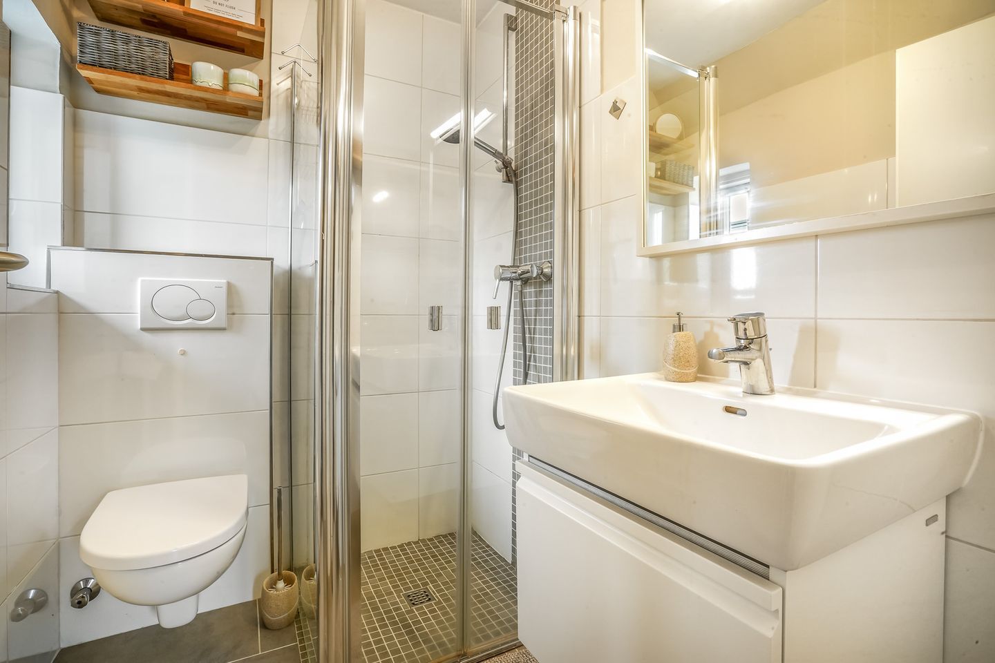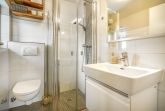 Im Erdgeschoss liegt außerdem das moderne Tageslichtbad, welches mit einer ebenerdigen Dusche, einem Waschtisch und einem WC ausgestattet ist.