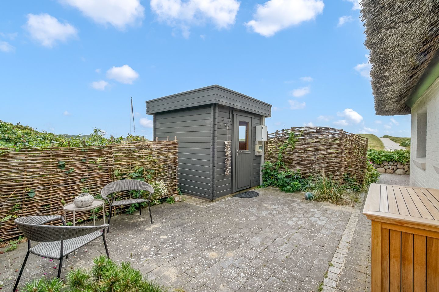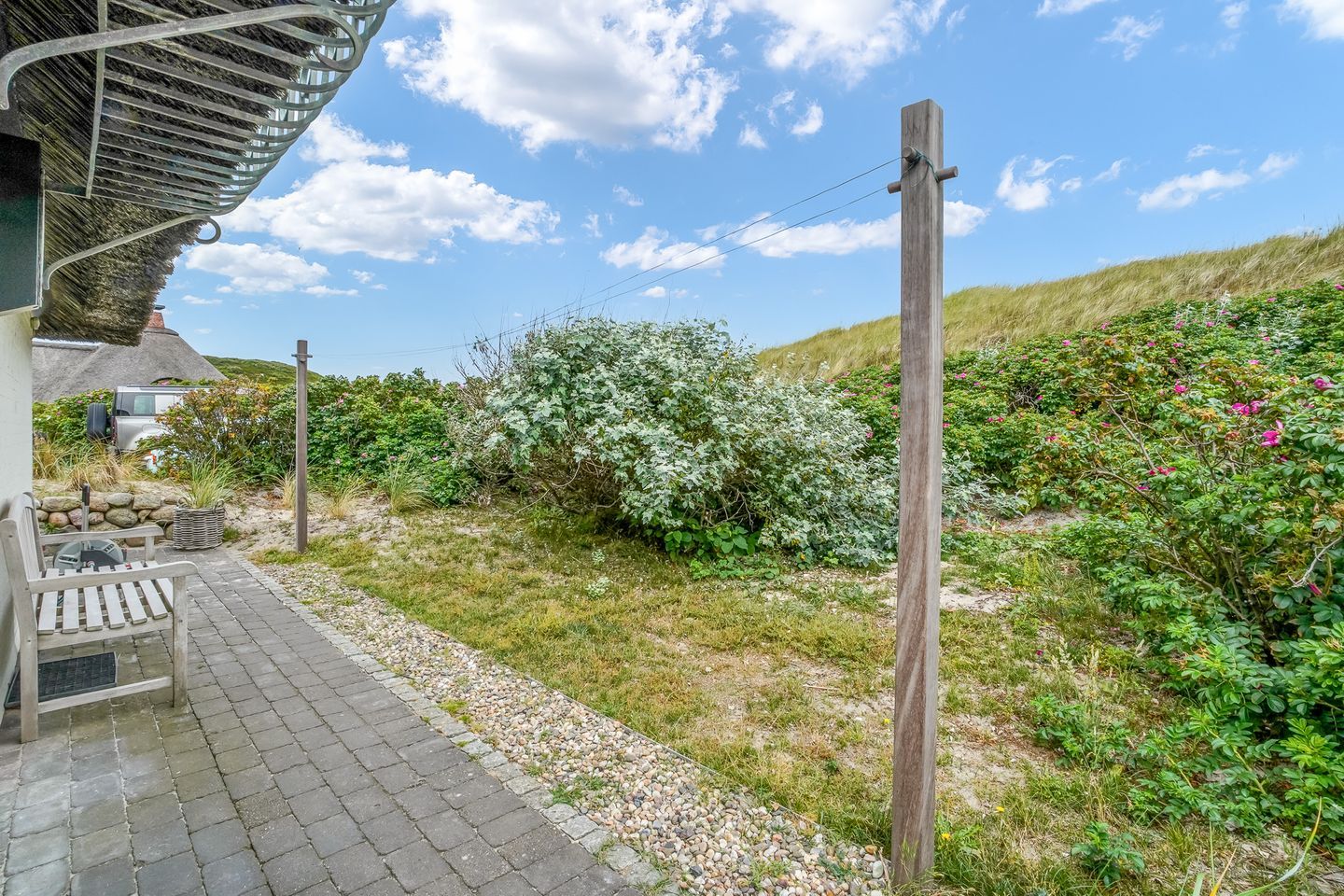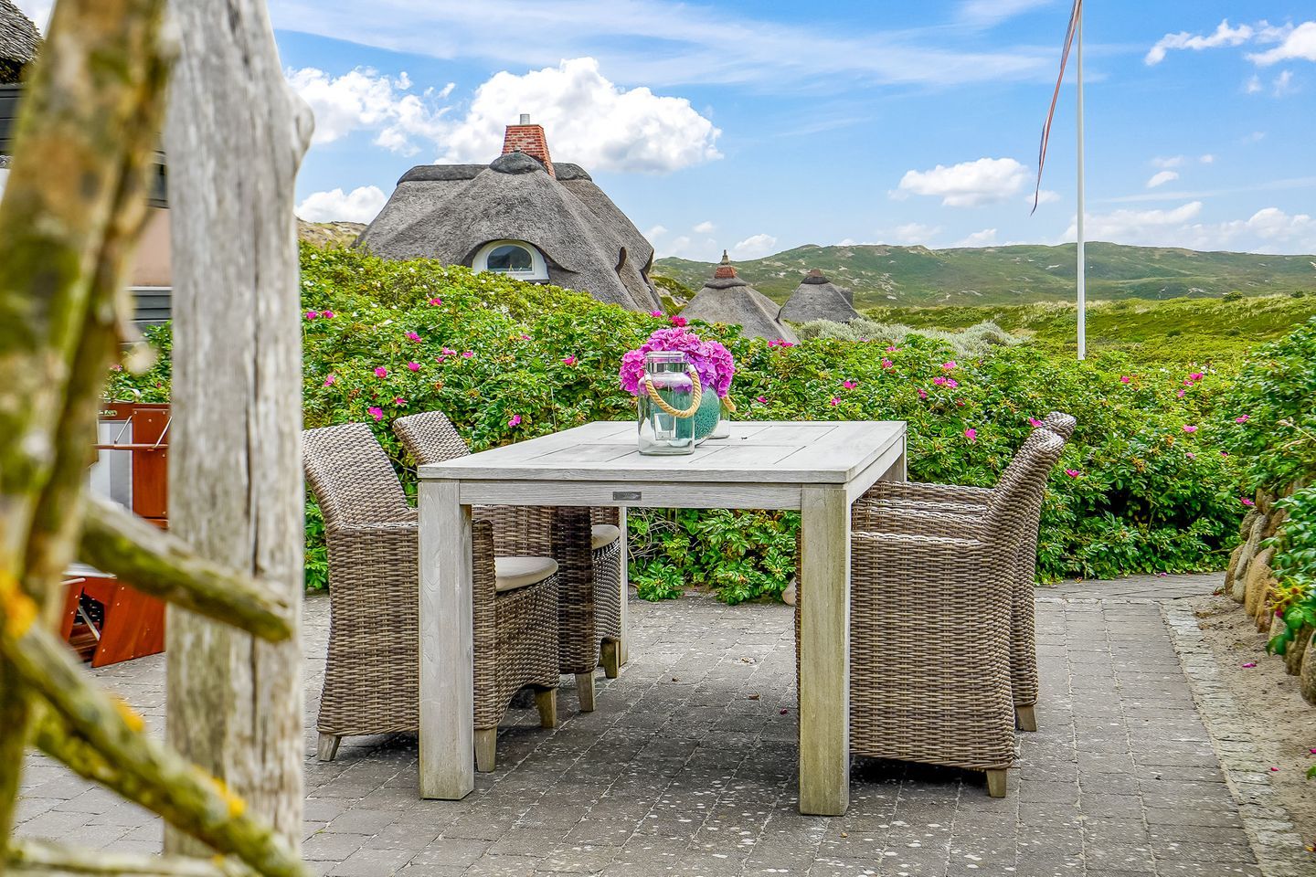 Vom Wohnbereich aus erreichen Sie die großzügige Terrasse mit Gartenmöbeln, einem Strandkorb und Sonnenliegen. Im Garten befindet sich auch das Saunahäuschen, von dem aus Sie ebenfalls den Blick in die Dünen genießen können.