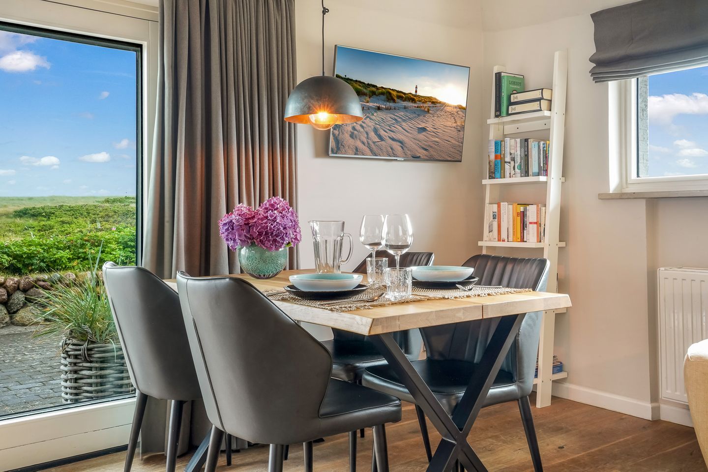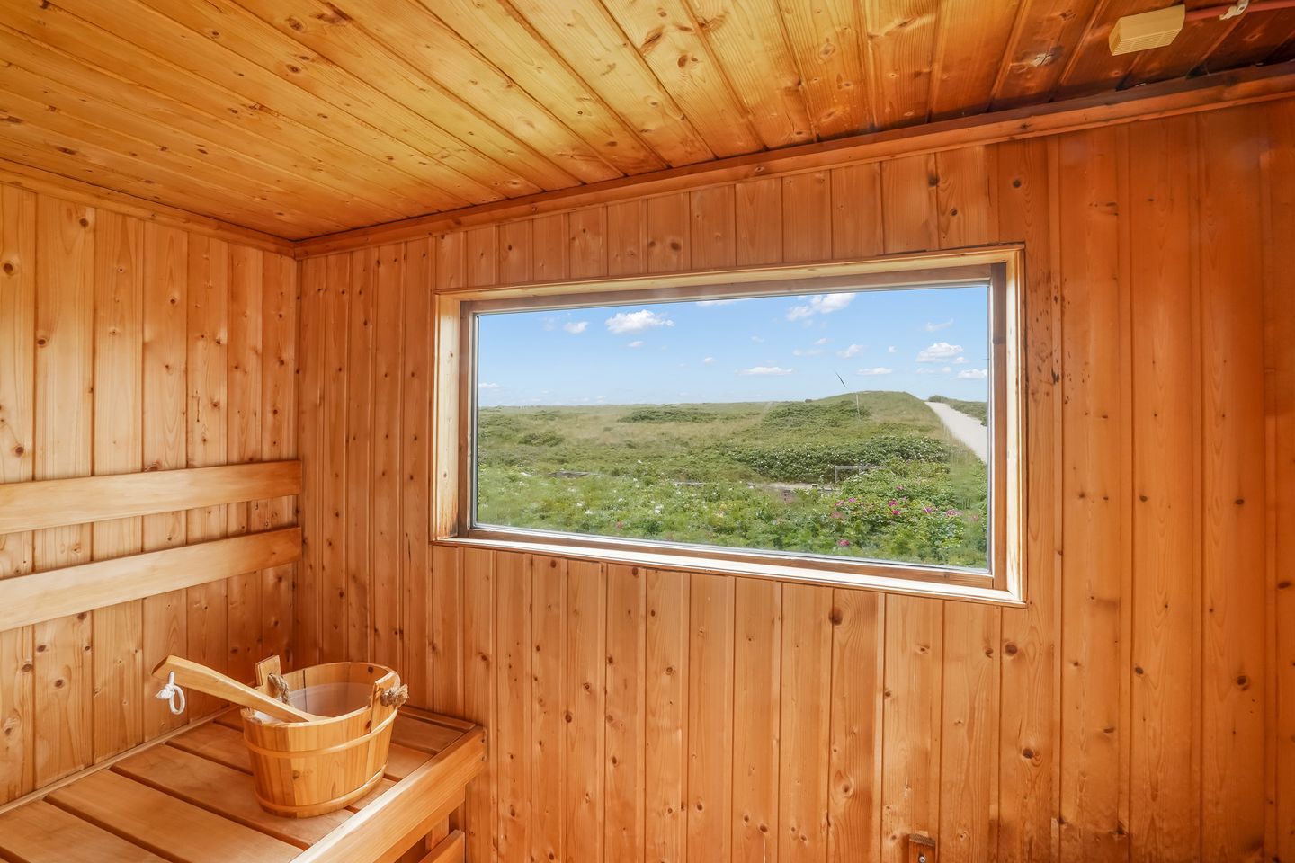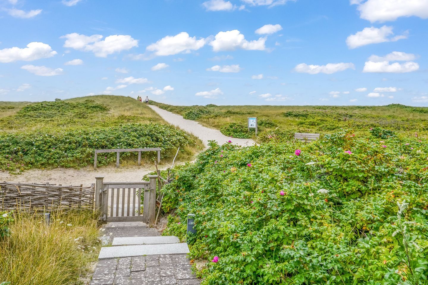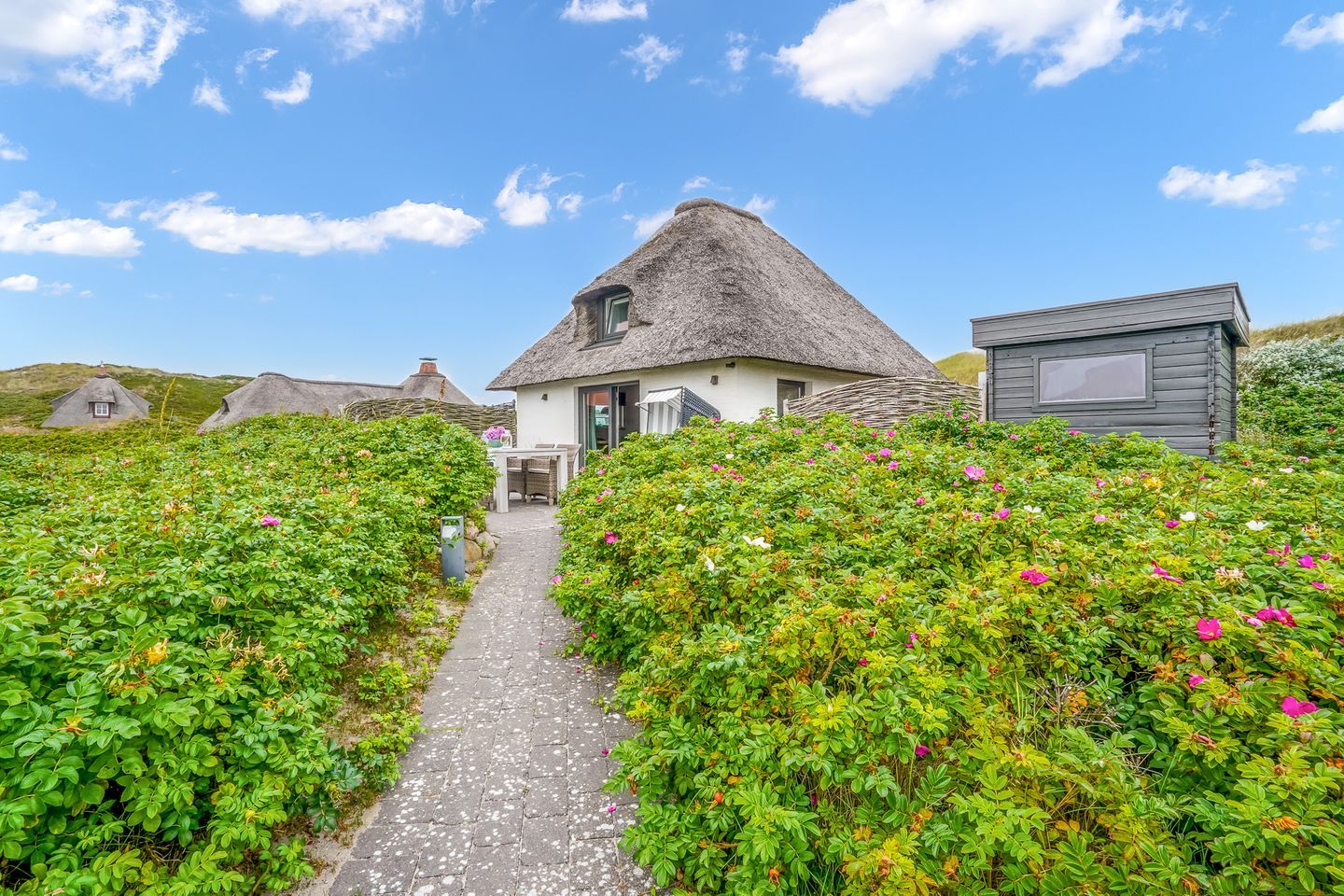 Vom Wohnbereich aus erreichen Sie die großzügige Terrasse mit Gartenmöbeln, einem Strandkorb und Sonnenliegen. Im Garten befindet sich auch das Saunahäuschen, von dem aus Sie ebenfalls den Blick in die Dünen genießen können.