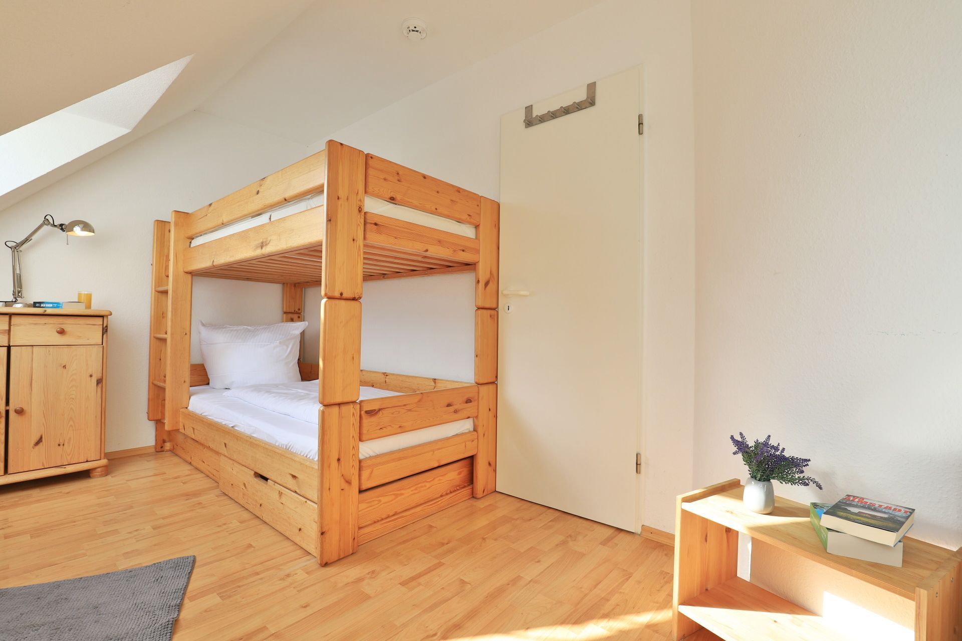Die 3-Zimmer Maisonettenwohnung ?Likedeeler 37? mit Balkon, besitzt eine Wohnfläche von 85qm und ist für eine Belegung mit bis zu 5 Personen bestens geeignet. Diese Wohneinheit befindet sich im 2. Obergeschoss ? Fahrstuhl. Für technische Unterhaltung können Sie den Fernseher, DVD-Player sowie eine Musikanlage nutzen, zudem steht WLAN kostenfrei bereit. Im sehr komfortabel möblierten Wohn-/Essbereich empfängt Sie eine bequeme Sitzgruppe und weiteres Mobiliar. Ebenso ist ein großer Esstisch im Wohnbereich platziert. Die integrierte Wohnküche ist offen gestaltet und ermöglicht die Eigenversorgung mit: Ceranherd, Backofen, Mikrowelle, Dunstabzug, Kühlschrank mit integr. Gefrierfach, Geschirrspüler, Kaffeemaschine, Wasserkocher, Toaster usw. Ihre Urlaubsmahlzeiten können Sie bequem am Esstisch zu sich nehmen. An wärmeren Tagen genießen Sie den saisonal möblierten Balkon in östliche Ausrichtung zum Innenbereich der Appartementanlage. Über eine geschwungene Wohnraumtreppe erreichen Sie zwei separate Schlafzimmer, die sich in der oberen Wohnebene befinden. Einer der Schlafbereiche ist mit einem Doppelbett, Kleiderschrank eingerichtet. Im zweiten Schlafzimmer bzw. Kinderzimmer, erwartet Sie ein Etagenbett und ein Einzelbett. Für Familien mit Kleinkind befindet sich ein Kinderreisebett und ein Kinderhochstuhl in der Wohnung. Die Ferienwohnung bietet Ihnen ein modernisiertes Duschbad mit Waschtisch, WC. Zusätzlich ist ein Gäste-WC mit Dusche vorhanden. Hausgäste können im Untergeschoss sowohl Waschmaschine als auch Wäschetrockner gegen Gebühr nutzen. Ihr Fahrzeug parken Sie in der hauseigenen Tiefgarage auf einem fest zugeordneten Stellplatz. Mit dem Fahrstuhl gelangen Sie bequem zu den Wohnungsetagen. Im Haus gibt es eine gemeinschaftlich nutzbare Fahrrad Abstellmöglichkeit.