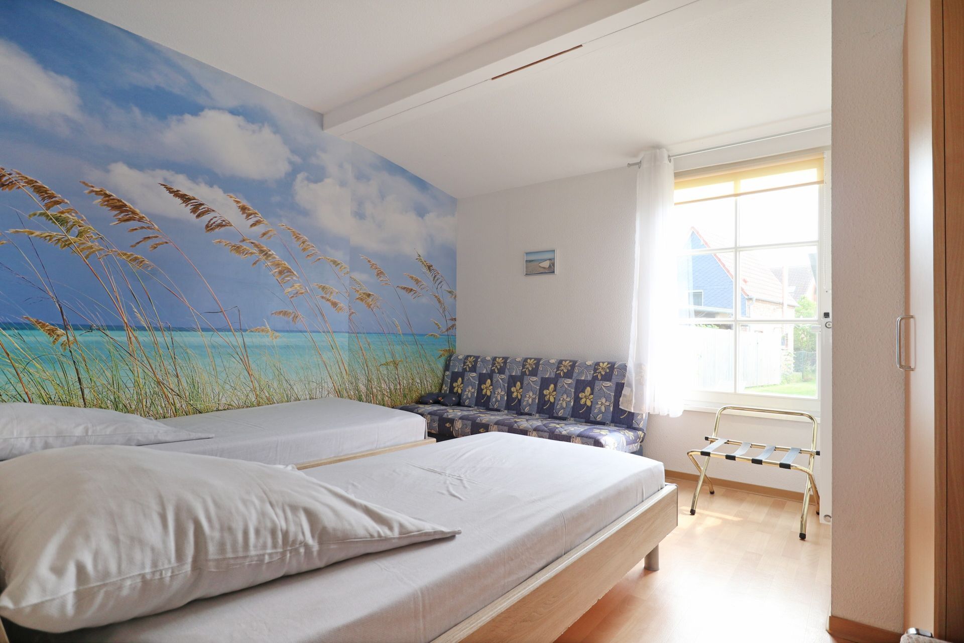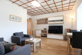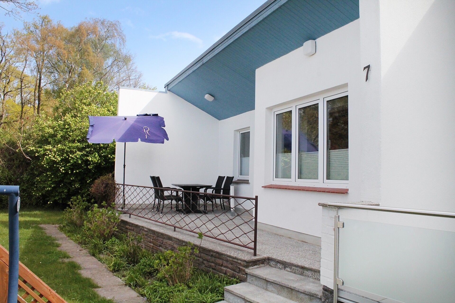 Das nah zum Strand liegende 3-Zimmer-Reihenendhaus - Seetage im Mariannenweg 7, empfängt Sie mit einer Wohnfläche von 50qm und verfügt über eine gute Ausstattung. Mit maximal 4 Personen ist eine Belegung möglich. Der freundlich möblierte Wohn-Essbereich bietet Ihnen eine bequeme Sitzgarnitur sowie einen Esstisch, der sich in einem kleinen Erker mit Fensterblick befindet. Selbstverständlich sind in dem Ferienhaus auch ein Flachbild Fernsehgerät sowie eine Musikanlage vorhanden. Die sonnige, leicht überdachte Terrasse in Richtung Süd-West, lässt Sie entspannen und auf der Grünfläche vor dem Haus können Sie sich ebenfalls erholen.