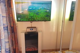 Unser Appartement Strandperle verfügt über ein hochwertiges Boxspringbett und ist sehr geschmackvoll und gemütlich eingerichtet. Ein Kleiderschrank mit praktischer Ausstattung und Spiegeltür steht Ihnen zur Verfügung. Zur Ausstattung gehören auch eine Miniküche mit Kaffeemaschine, Wasserkocher, Mikrowelle, Toaster, usw. NEU ab 2025: Ein großer 43 Flachbildfernseher mit Ambilight LED-Hintergrundbeleuchtung an der Wand sorgt für ein tolles Bilderlebnis. Da der Fernseher mit Smart-TV Funktion über das Internet ausgestattet ist, genießen Sie immer beste Unterhaltung nach Ihren Wünschen. Ein Internetradio ermöglicht jederzeit besten Radioempfang und ein elektrisches Kaminfeuer mit tollem Flammeneffekt sorgt für eine kuschelige Atmosphäre. Modernes Bad mit Fenster und flacher Dusche. Im gesamten Appartement befindet sich ein hygienischer Fliesenboden.