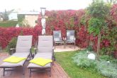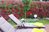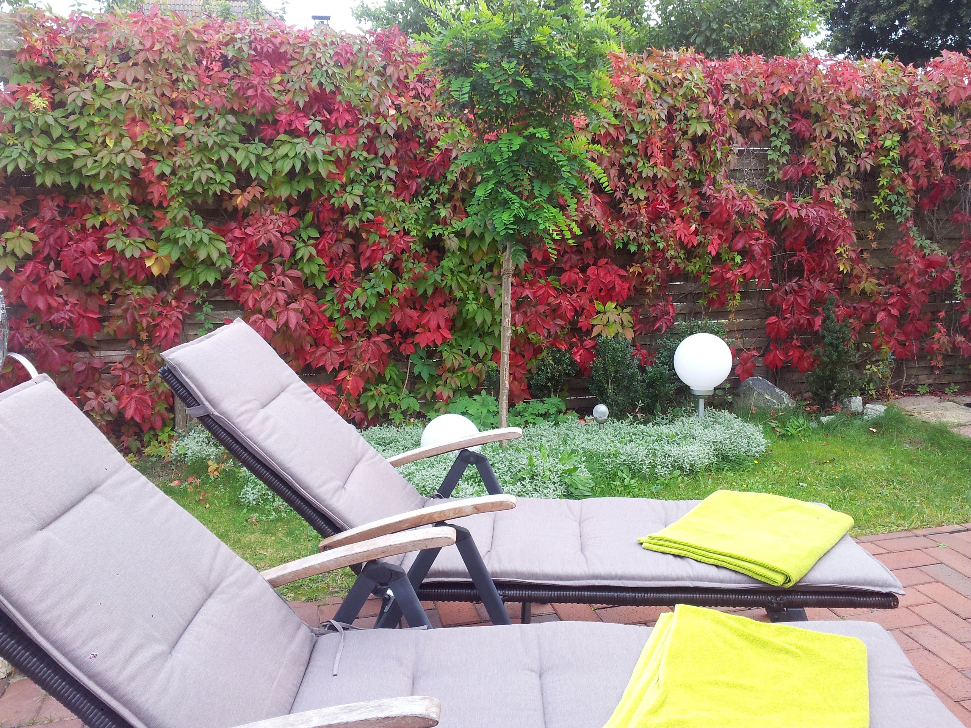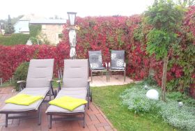 Eine große, geschützte und möblierte Terrasse vor dem Appartement gehört dazu. Dort stehen auch zwei Rollliegen, Grill und Fahrradständer für Sie bereit. Die Außenfassade lädt mit ihrer angenehm warmen terracotta Farbe zum Wohlfühlen auf der Terrasse ein. Der Garten um die Terrasse ist sehr schön und liebevoll angelegt - ideal zur Erholung. Das Appartement eignet sich nicht nur für 2 Reisende, sondern ist auch ideal für Alleinreisende.