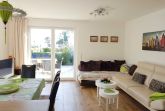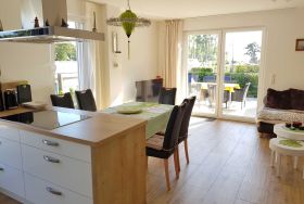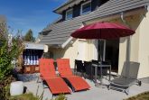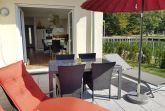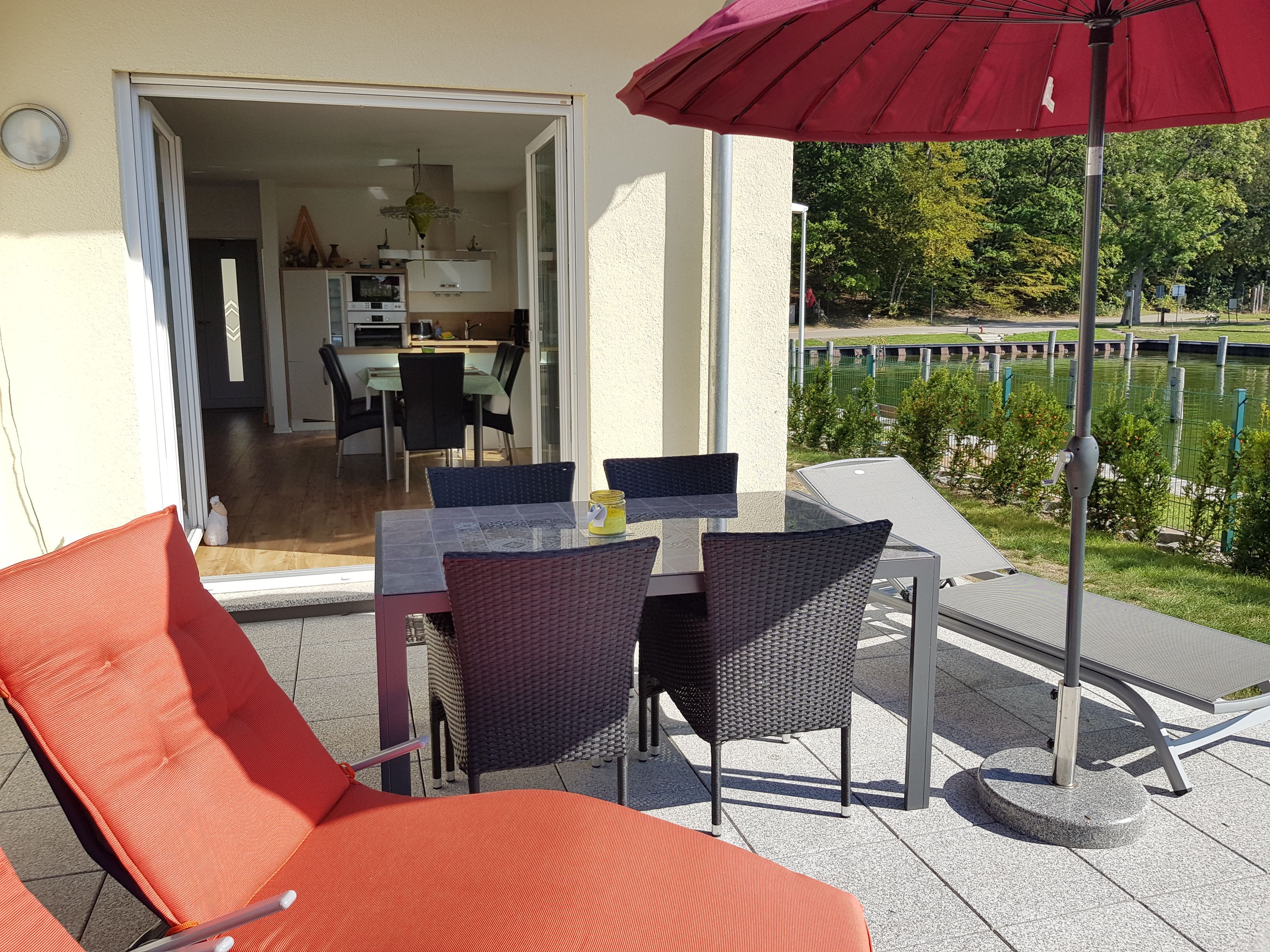 Heller Wohn- und Essbereich mit hochwertiger Küche. Die offene Küche ist modern ausgestattet mit Geschirrspüler, Kühlschrank mit separatem Gefrierfach, Backofen, eingebauter Mikrowelle sowie einer Kochinsel mit Ceran-Kochfeld (Induktion). Ein breites, beiges Ledersofa in modernem Design sorgt für besten Sitzkomfort. Abgerundet wird der Wohnbereich von einem modernen 55'' Fernseher mit Ambilight (Smart-TV) sowie einer Hifi-Anlage auf einem TV-Lowboard mit stimmungsvoller LED-Beleuchtung (Farbe einstellbar). Ein besonders reizvoller Platz bietet die möblierte Terrasse mit Strandkorb und Wasserblick. Der Garten ist mit vielen Pflanzen sehr schön und liebevoll angelegt - ideal zur Erholung.