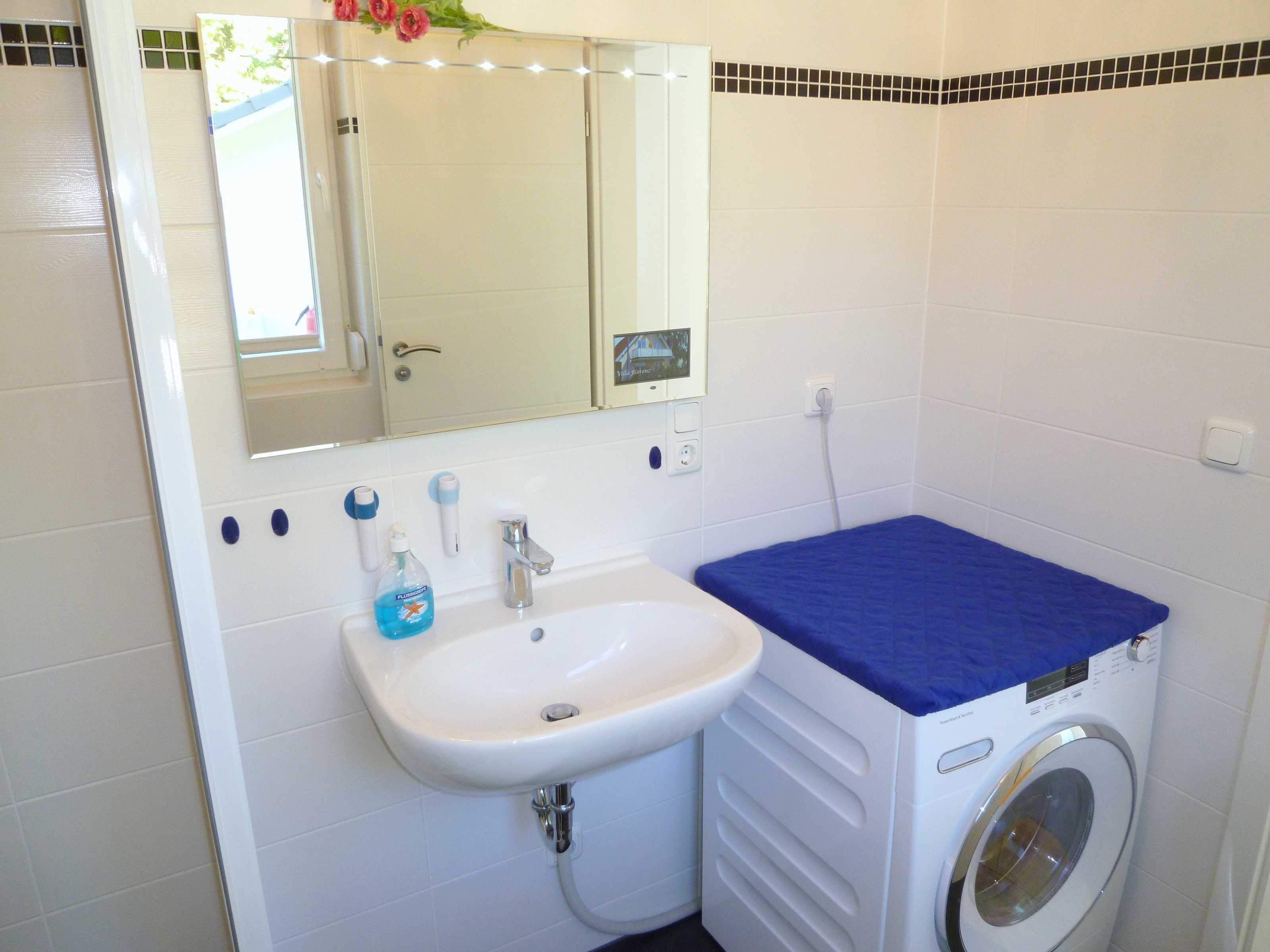 Das Ferienhaus verfügt über 2 moderne Bäder, jeweils mit bodengleichen Duschen. Neben dem Bad im Erdgeschoss steht ein zweites Bad im Obergeschoss zur Verfügung. Außerdem steht eine Waschmaschine für Sie bereit.
