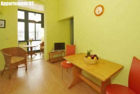Die komplett und modern eingerichtete 1- Raum- Wohnung ( 40 qm) befindet sich im Erdgeschoss bzw. im 1. OG der Villa Ostpreussen. Die Wohnung ist mit einem LCD Fernseher, einer Küchenzeile (Wohnung im Erdgeschoss separate Küche) und einer Veranda ausgestattet. Eine Aufbettung für eine 3. Person ist möglich.