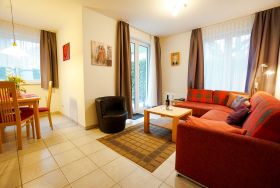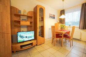 Im Zentrum des Seebades, unweit der Promenade, finden Sie diese modern ausgestattete, ca. 42 m² große 2-Zimmer-Nichraucherwohnung. Die Ferienwohnung befindet sich im Erdgeschoß des Hauses, verfügt über eine sonnige Terrasse, ist südseitig ausgerichtet und bietet 2 bis 3 Personen einen angenehmen Aufenthalt. Die Ausstattung umfasst ein Schlafzimmer mit Doppelbett, eine voll ausgestattete Küche, ein Duschbad und im Wohnzimmer befindet sich eine Schlafcouch, ein Esstisch für 4 Personen und der Zugang zur Terrasse. Die Entfernung zum Ostseestrand beträgt nur 2 Gehminuten.