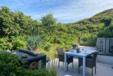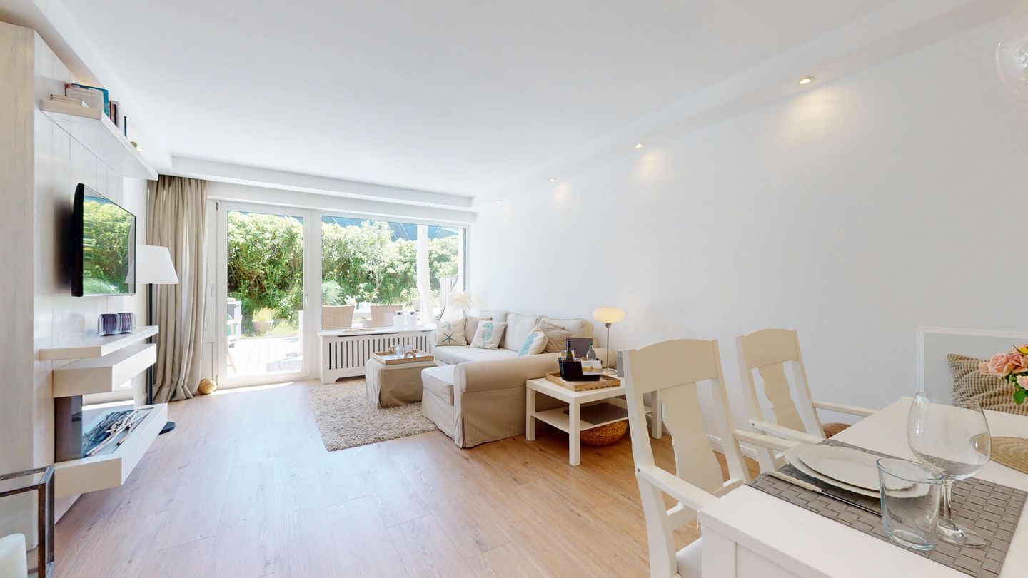 Die angrenzende großzügige Terrasse ist ein absolutes Highlight dieser Wohnung. Sie lädt mit viel Privatsphäre zum ausgiebigen Verweilen ein. Hier können Sie die Sonne von morgens bis in den frühen Abend genießen und sich an der Dünenlandschaft erfreuen – inklusive Meeresrauschen.