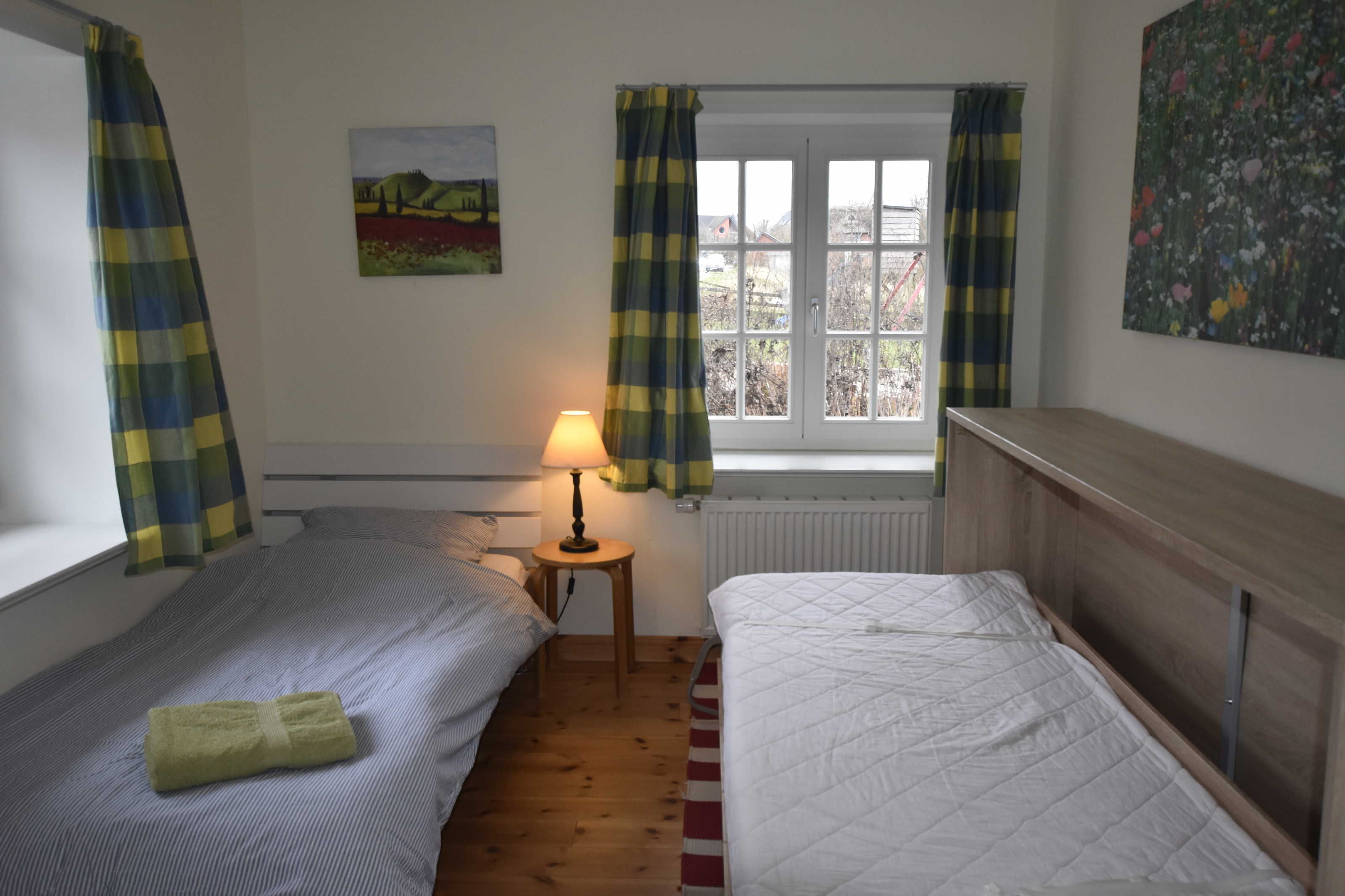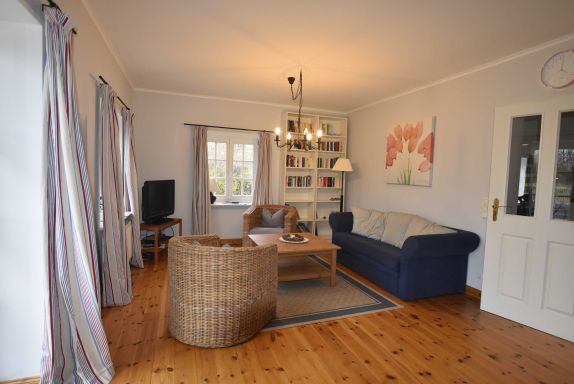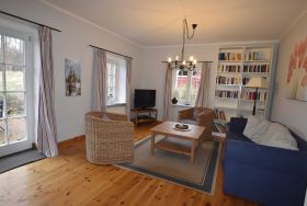3-Raum-Ferienwohung im eleganten Landhausstil. Wohnbereich mit gemütliche Sitzecke und Eßbereich und Zugang zur Terrasse. Küche mit Backofen, 4-Plattenherd, Mikrowelle, Geschirrspüler, Kühlschrank mit Gefierfach, Toaster, Kaffeemaschine, Wasserkocher. 1 Schlafzimmer mit Doppelbett, 1 Schlafzimmer mit Einzelbett und ausklappbaren Schrankbett Zusätzliche Aufbettung für 2 Personen auf Schlafcouch im Wohnzimmer. Badezimmer mit Du / WC / Waschmaschine.