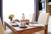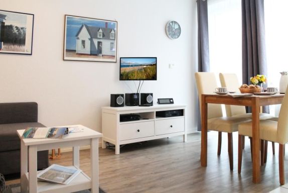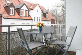 Die modern komfortabel möblierte 2-Zimmerwohnung befindet sich im 1. OG und besitzt eine Wohnfläche von 36qm. Eine Belegung ist mit bis zu 4 Personen möglich. Der geschmackvoll eingerichtete Wohn-Essbereich ist mit einem Sofa, welches sich in ein Schlafsofa mit zwei weiteren Schlafgelegenheiten umwandeln lässt- und mit einem Esstisch ausgestattet. Ebenso sind Fernseher, Musikanlage und gebührenfreies WLAN vorhanden. In der offenen Wohnküche können Sie Ihre Urlaubsmahlzeiten zubereiten mit: Herd, Backofen, Dunstabzug, Kühlschrank mit integriertem Gefrierfach, Spülmaschine usw. Ihre Mahlzeiten nehmen Sie am Esstisch zu sich, oder Sie machen es sich auf dem saisonal möblierten West- Balkon gemütlich. Das Appartement verfügt über ein separates Schlafzimmer mit Doppelbett 1,60m x 2,00m, Kleiderschrank. Das innenliegende Badezimmer besitzt eine Dusche, Waschtisch, Fön und WC. Im Haus können Waschmaschine sowie Wäschetrockner geben Gebühr gemeinschaftlich genutzt werden. Für Ihren PKW steht ein Außen - Stellplatz zur Verfügung. Haustiere sind nicht gestattet. Nichtraucher.