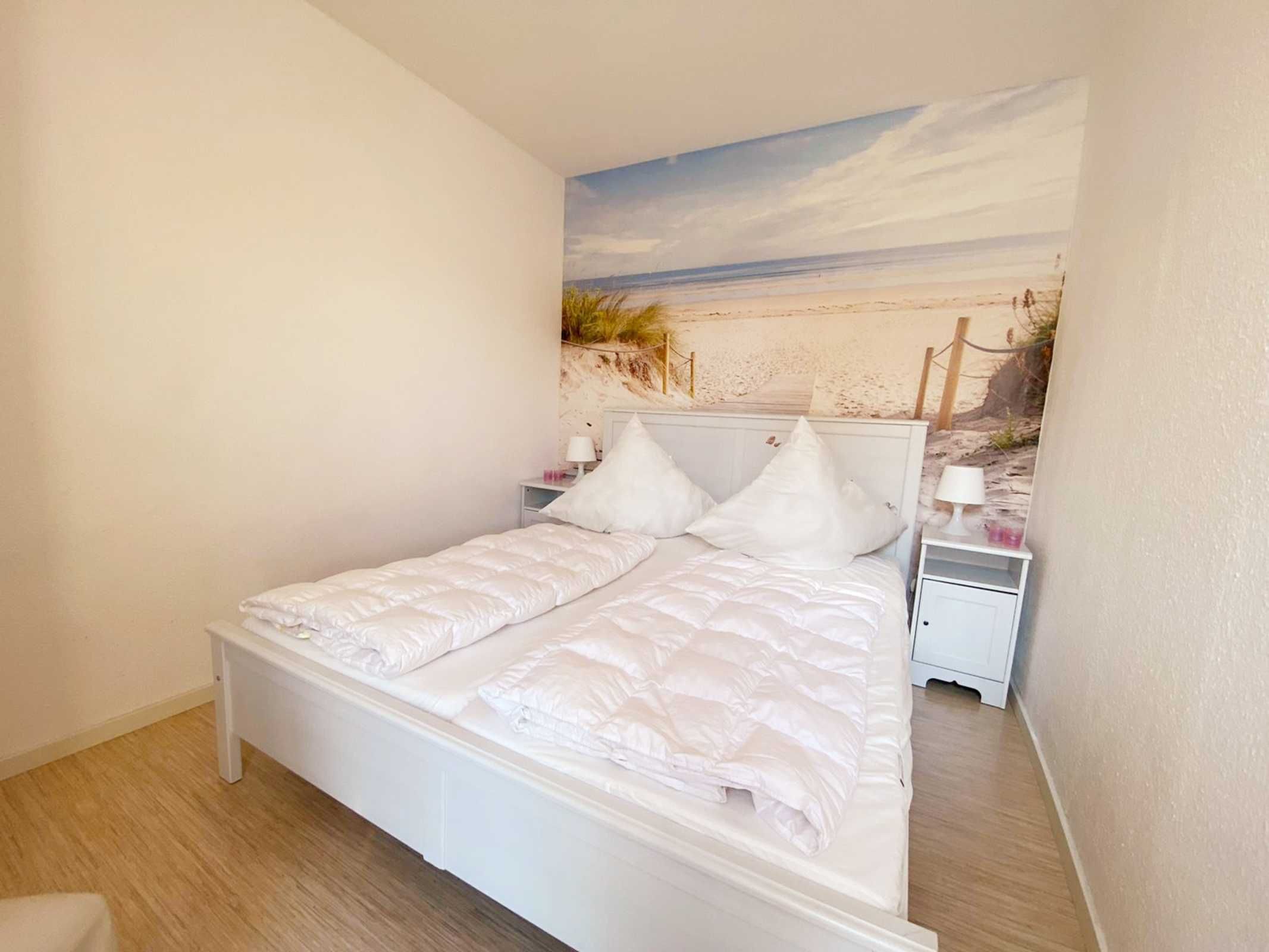 • Schlafzimmer: Doppelbett mit zwei Einzelmatratzen 80x200cm, Kleiderschrank, Nachttische + Lampen