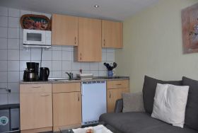 Im Wohn- Essbereich finden Sie die gemütliche Sitzecke mit ausziehbarer Couch, sowie die offene Küche mit Mikrowelle, Kühlschrank mit Tiefkühlfach, Wasserkocher, Toaster, Herd und Filterkaffeemaschine.