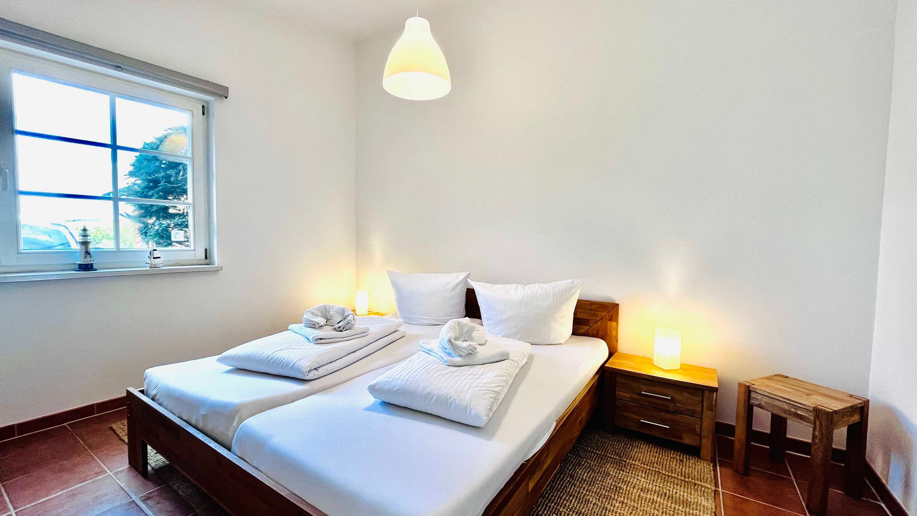 Ein Parkplatz befindet sich direkt vor dem Haus. Das Schlafzimmer ist mit einem Doppelbett ausgestattet.