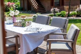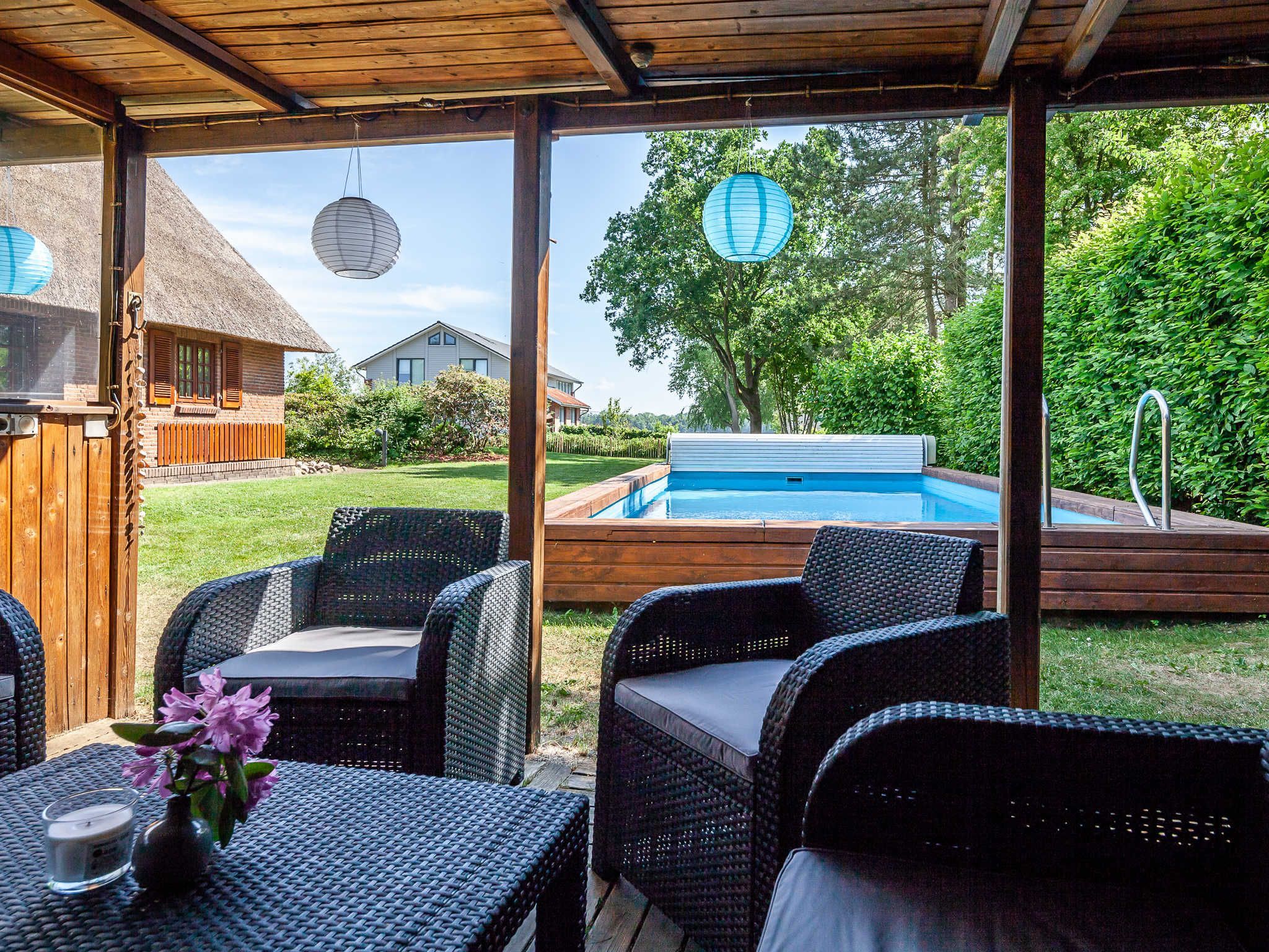 Der 2500 Quadratmeter große Garten ist komplett eingezäunt und liebevoll bepflanzt. Er bietet neben den beiden Sonnenterrassen einen großen Pool (8 x 4 Meter und 1,50 Meter tief), der für eine Erfrischung nach der Sauna oder an heißen Tagen einfach wundervoll ist. Der Poolbereich hat eine überdachte Poolbar und eine urige Grillecke für gesellige Barbecue Abende im Ferienhaus.