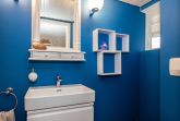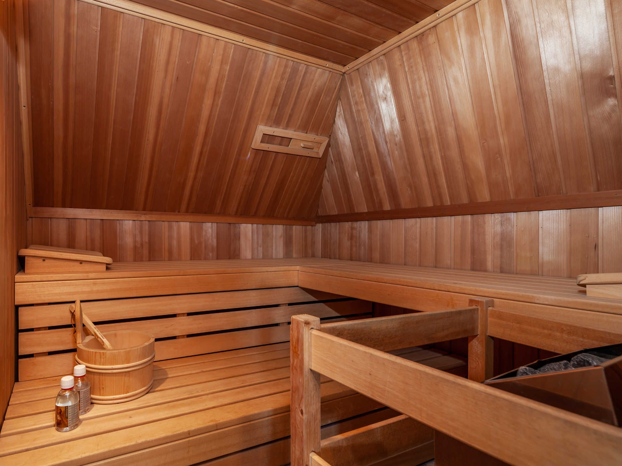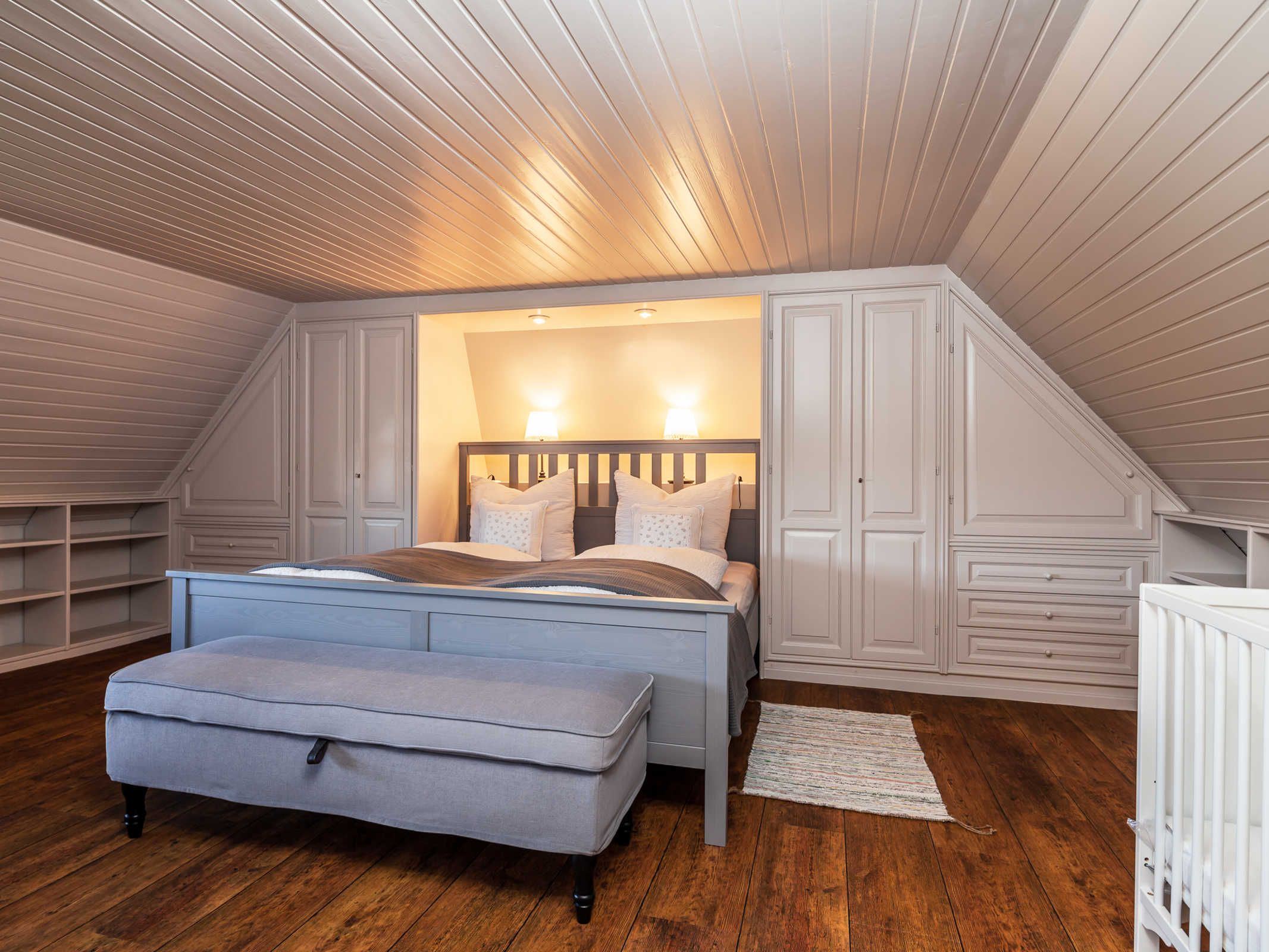 Über die urige Wendetreppe gelangen die Gäste in den oberen Bereich des Ferienhauses. Hier befindet sich ein weiteres Schlafzimmer mit einem Doppelbett und Kleiderschrank. Es schließt sich das zweite Bad an, das sich mit echten Marmorfliesen und einer freistehenden Badewanne schmückt. Die geschlossene Sauna ist ein besonderes Highlight für kühlere Tage. Nach dem Saunagang lässt es sich herrlich von der Mamorbank mit Blick auf den See entspannen. Desweiteren gibt es einen Duschbereich mit Duschbrause und Abspülschlauch nach dem Saunagang.
