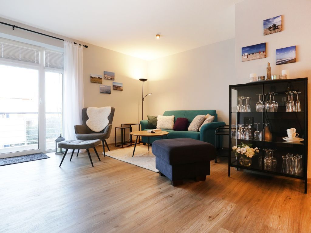 Die Residenz Haffblick ist eine zentral, dennoch ruhig gelegene Appartementanlage bestehend aus vier Häusern mit jeweils 17 Wohneinheiten. In nur 200 Meter befindet sich der Ostseestrand. Das Ortszentrum ist in wenigen Schritten erreicht. Die beliebte Ferienanlage liegt gleichzeitig nah zum Naturschutzgebiet an den Haffwiesen auch nah dem Tarnewitzer Urwald. Ganzjährig bietet der hauseigene Wellnessbereich Sauna, sowie Infrarot Wärmekabinen gegen Gebühr. Ein Fitnessraum steht kostenfrei zur Verfügung. Ebenfalls kostenlos sind WLAN sowie Sky Programme Fußball Bundesliga -Sport- Cinema- Disney. Jeder der Wohneinheiten ist individuell ausgestattet, komfortabel möbliert und verfügt über Terrasse oder Balkon, teilweise zwei Balkone. Zudem gibt es auf dem Grundstück Pavillons mit Blick auf die Pferdewiesen. In jedem der Häuser befinden sich Waschmaschine und Wäschetrockner mit Münzeinwurf. Zugehörig ist ein PKW -Außenstellplatz pro Ferienwohnung. Teilweise sind Haustiere gestattet. Gäste der Residenz Haffblick verbringen einen entspannten Aufenthalt und genießen gleichzeitig die nahe Lage zu vielen Annehmlichkeiten des Ostseebades. Restaurants sowie Cafe´s und Geschäfte sind in Kürze erreicht. Die hier beschriebene 2-Zimmer Ferienwohnung Haffblick 61 mit Balkon, liegt im 1. Obergeschoss und bietet eine Wohnfläche von 50qm. Eine Belegung mit maximal 4 Personen möglich. Die hübsche Wohnung lädt mit einem Wohn-/Essbereich mit Wohnküche zu einem schönen Urlaub ein. Ein separates Schlafzimmer mit Doppelbett und Kleiderschrank ist vorhanden. Im Wohnzimmer bietet ein Schrankbett zwei zusätzliche Schlafgelegenheiten. Die Wohnung besitzt ein innenliegendes Duschbad. Es handelt sich um ein Nichtraucher Appartement. Haustiere sind nicht erlaubt