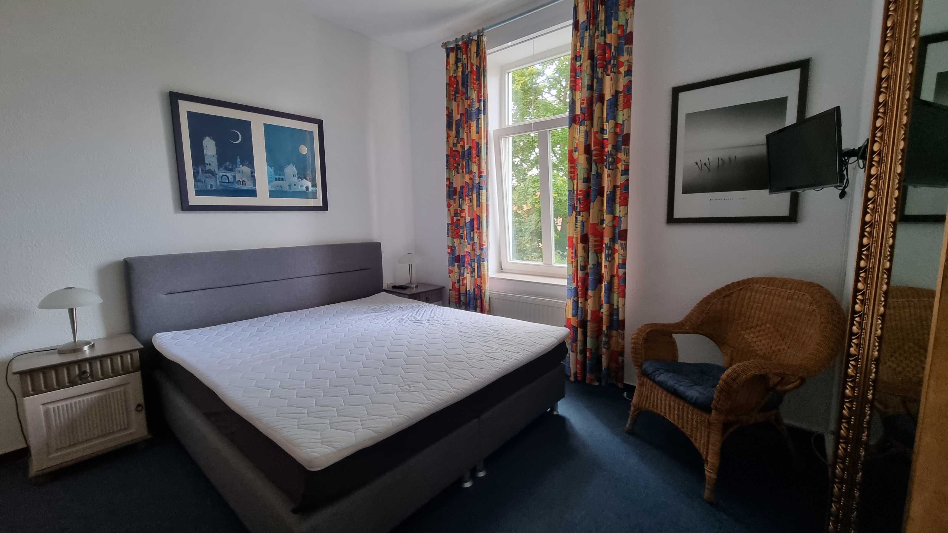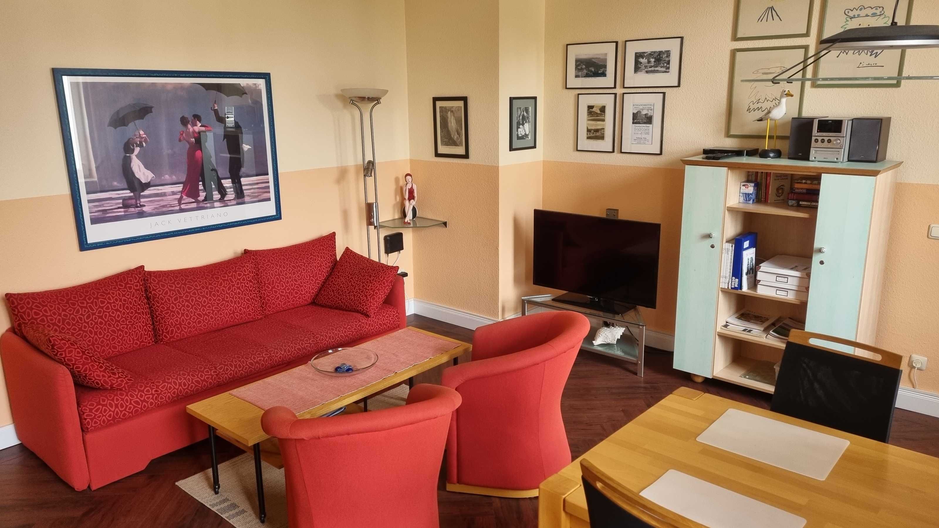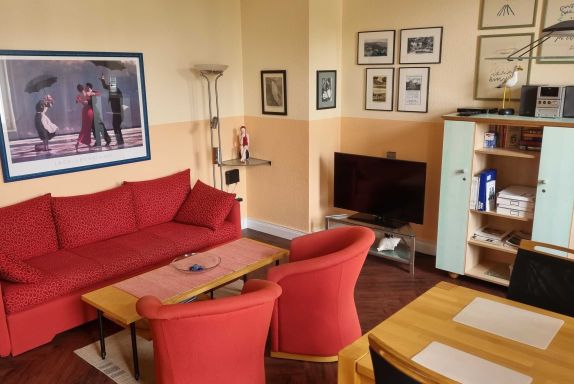 Die großzügige, freundliche und individuell eingerichtete Ferienwohnung besteht aus einem komfortabel ausgestatteten Wohnzimmer (27 qm) mit Sitzecke und Essplatz für 4 Personen, mit LCD-TV, DVD, Radio/CD, Lesestoffe, Spiele, einem großen Schlafzimmer (14 qm) mit Doppelbett, einem 2.tem Schlafzimmer (11 qm) mit 2 Einzelbetten, komplett eingerichteter Küche (mit 4-Plattenherd, Backofen, Geschirrspüler, Kühlschrank, Kaffeemaschine, Wasserkocher, Toaster etc.), einem Duschbad/WC und Diele.