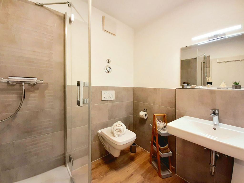 Die Residenz Haffblick ist eine zentral, dennoch ruhig gelegene Appartementanlage bestehend aus vier Häusern mit jeweils 17 Wohneinheiten. In nur 200 Meter befindet sich der Ostseestrand. Das Ortszentrum ist in wenigen Schritten erreicht. Die beliebte Ferienanlage liegt gleichzeitig nah zum Naturschutzgebiet an den Haffwiesen auch nah dem Tarnewitzer Urwald. Ganzjährig bietet der hauseigene Wellnessbereich Sauna sowie Infrarot-Wärmekabinen gegen Gebühr. Ein Fitnessraum steht kostenfrei zur Verfügung. Ebenfalls kostenlos sind WLAN sowie Sky Programme Fußball Bundesliga -Sport- Cinema- Disney. Jeder der Wohneinheiten ist individuell ausgestattet, komfortabel möbliert und verfügt über Terrasse oder Balkon, teilweise zwei Balkone. Zudem gibt es auf dem Grundstück Pavillons mit Blick auf die Pferdewiesen. In jedem der Häuser befinden sich Waschmaschine und Wäschetrockner mit Münzeinwurf. Zugehörig ist ein PKW -Außenstellplatz pro Ferienwohnung. Teilweise sind Haustiere gestattet. Gäste der Residenz Haffblick verbringen einen entspannten Aufenthalt und genießen gleichzeitig die nahe Lage zu vielen Annehmlichkeiten des Ostseebades. Restaurants sowie Cafe´s und Geschäfte sind in Kürze erreicht. Das modernisierte 2-Zimmer Appartement Haffblick 16 besitzt zwei Balkone. Vom 3. Obergeschoss genießen Sie die Aussicht über eine schöne Wiesenlandschaft. Die Wohnfläche der Ferienwohnung beträgt 54qm. Für einen Aufenthalt mit bis zu 3 Personen ist das Feriendomizil nahezu perfekt. Es handelt sich um eine Wohnung für Nichtraucher. Haustiere sind nicht gestattet.