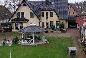 Bei gutem Wetter lädt eine große Spielwiese sowie eine Grillecke und Terrasse zum Verweilen ein. Bei schlechtem Wetter (oder zu viel Sonne), genießen unsere Gäste gern den Gartenpavillon mit Feuerstelle.