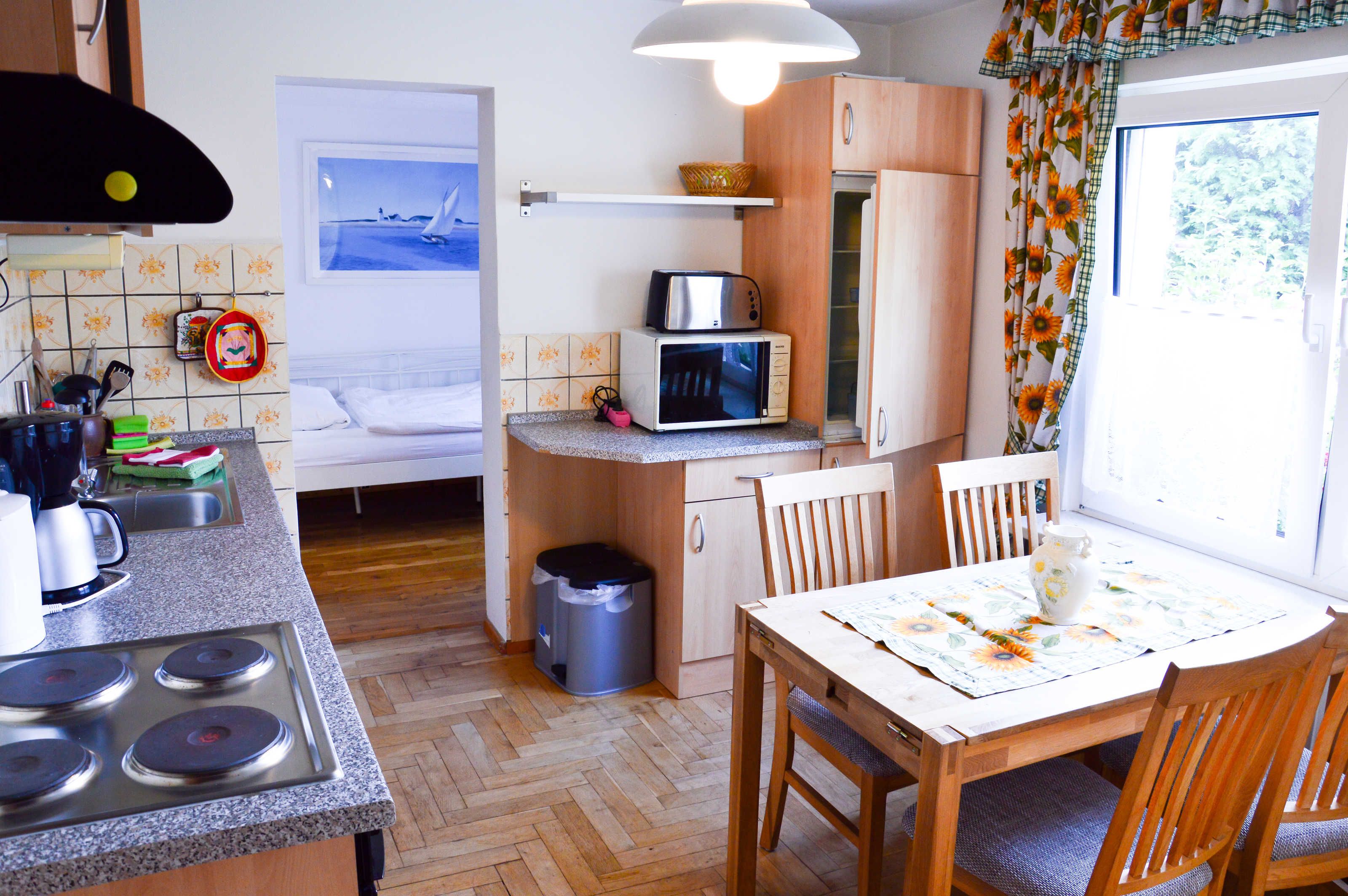Küchenutensilien, Spülmaschine, Wasserkocher, Toaster, Filterkaffeemaschine, Kühlschrank, Mikrowelle, Herd, Esstisch mit Stühlen