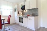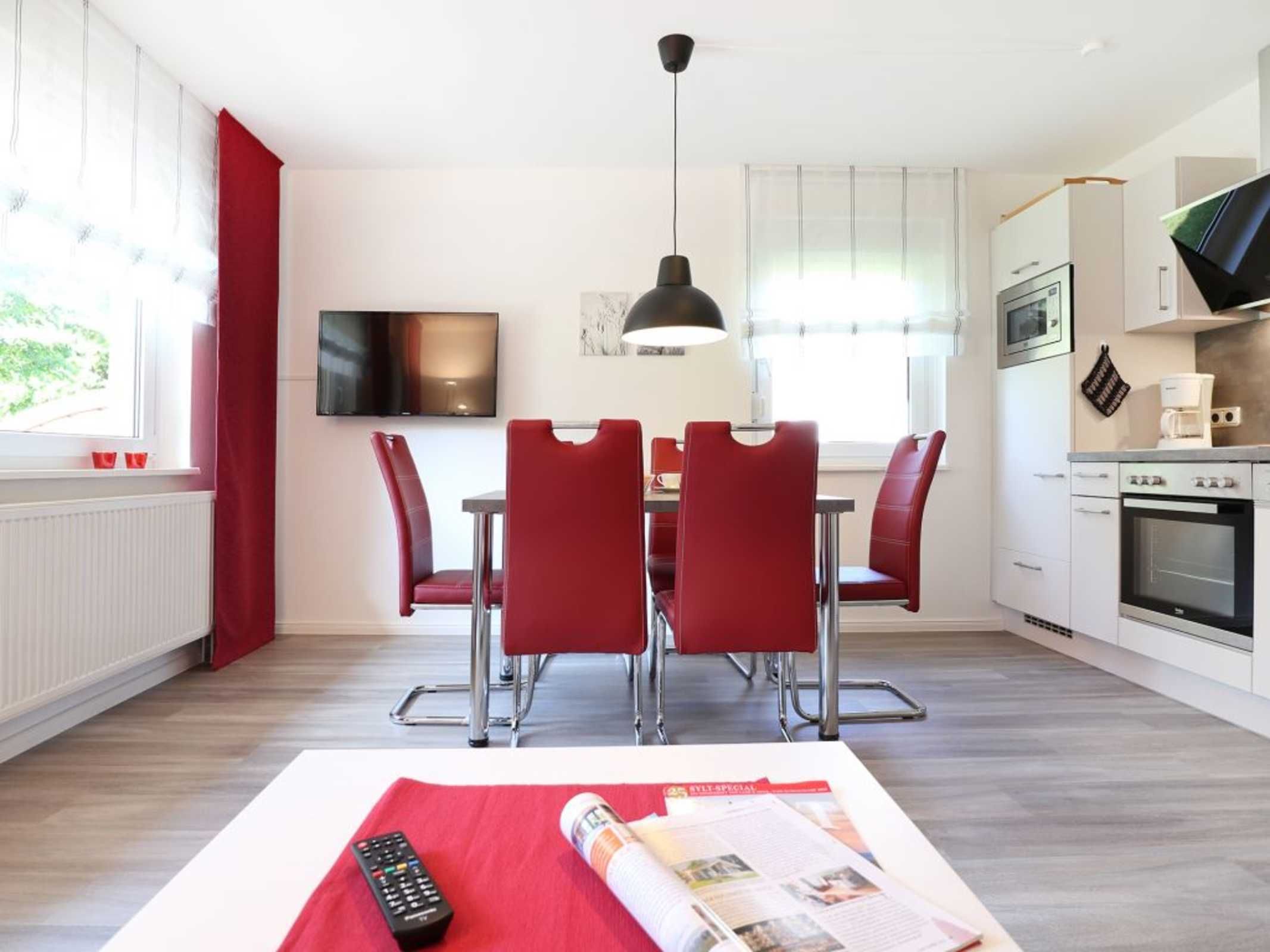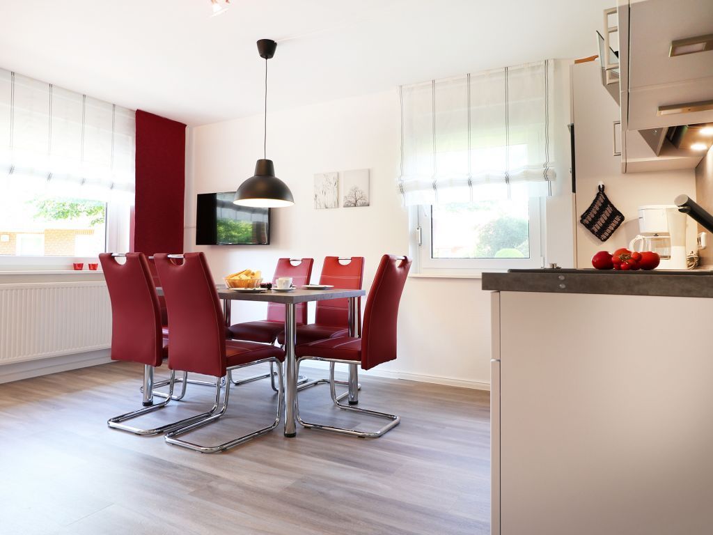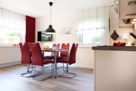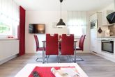 Das schick möblierte und gut ausgestattete Reihen Eckhaus im Urlauberdorf 61d mit sonniger Terrasse und Gartennutzung, empfängt bis zu sechs Gäste mit einer Wohnfläche von 55qm. Im Erdgeschossbereich befindet sich der moderne Wohn-Essbereich mit einem Sofa, welches in ein Schlafsofa mit zwei Schlafmöglichkeiten umgewandelt werden kann. Zudem bietet ein großer Esstisch ein gutes Platzangebot für gemeinsame Mahlzeiten. Die in den Wohnbereich integrierte Komfort Küchenzeile ist für Selbstversorger bestens ausgestattet mit Herd, Backofen, Mikrowelle, Dunstabzugshaube, Kühlschrank mit Gefrierfach, Geschirrspüler sowie Kaffeemaschine, Wasserkocher, Toaster usw. Technische Unterhaltungselektronik ermöglichen ein Flachbildfernseher sowie eine Musikanlage mit CD. Zudem befindet sich im Erdgeschoss ein hübsches Schlafzimmer mit zwei Einzelbetten und Kleiderschrank.