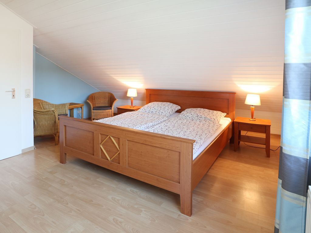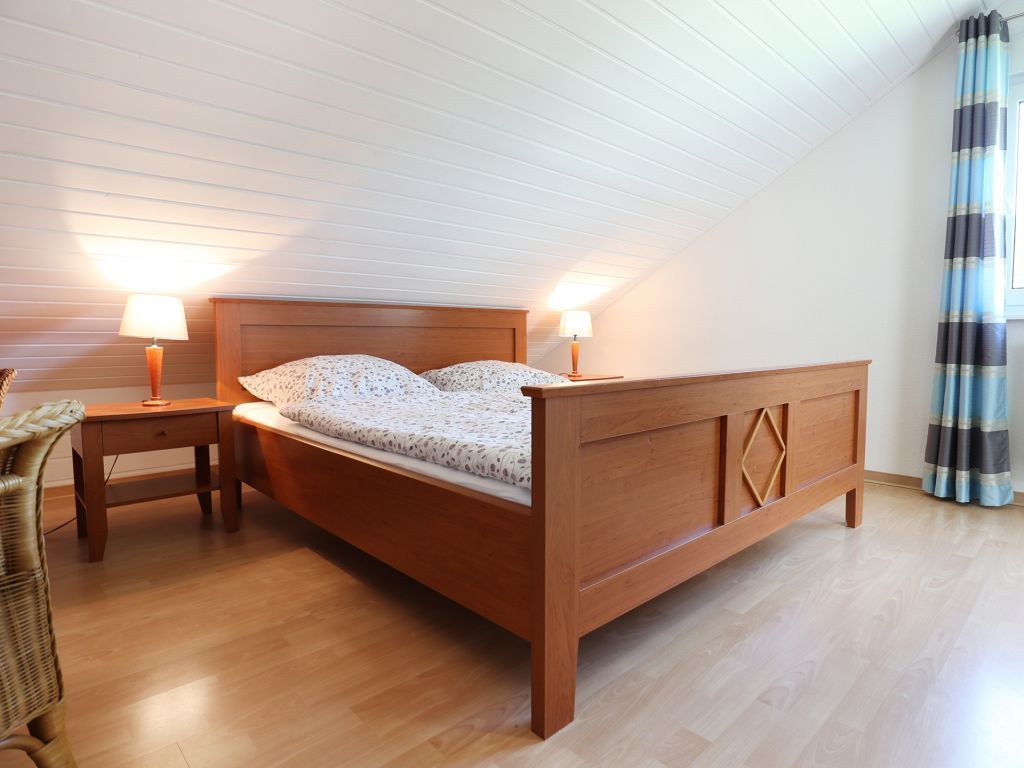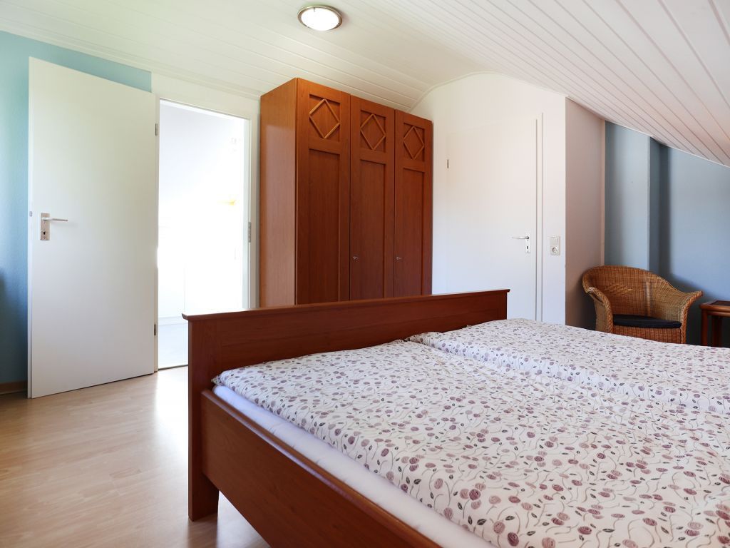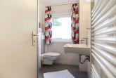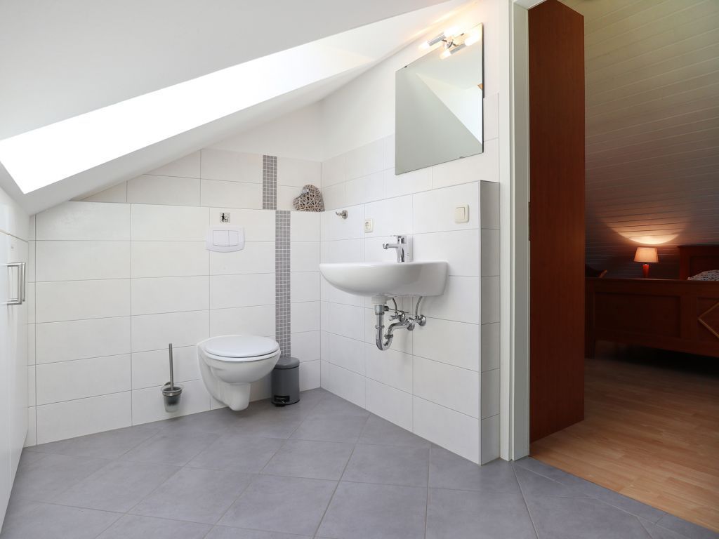 Auf der Wohnebene ist auch ein modernes Tageslicht Badezimmer mit tiefem Duscheinstieg, Waschtisch, Handtuchheizung und WC vorhanden. Über eine Treppe gelangen Sie in das obere Geschoss des Feriendomizils, wo sich ein weiteres Schlafzimmer mit Doppelbett und Kleiderschrank befindet. Idealer Weise besitzt diese Etage ein Gäste-WC mit gebührenfreier Waschmaschinen Nutzung. Für Familien mit kleinen Kindern wurden bei der Ausstattung ein Kinderhochstuhl und ein Kinderreisebett berücksichtigt.