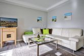 Das harmonische Wohnzimmer verfügt neben einer gemütlichen Couchecke, TV und