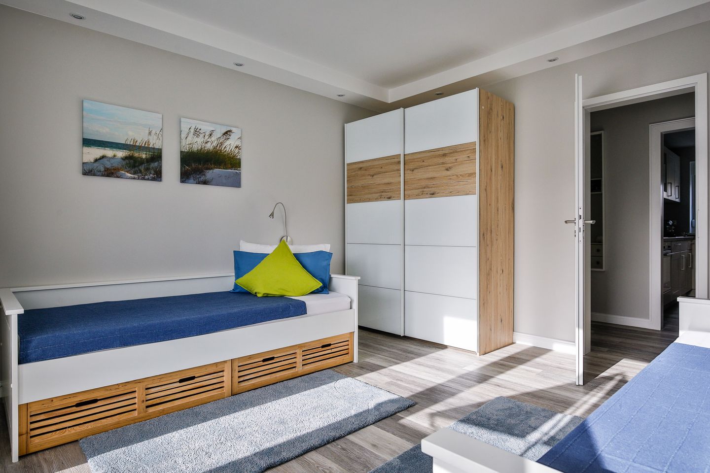 Kleiderschrank sowie TV. Auch das zweite Schlafzimmer besticht mit zwei