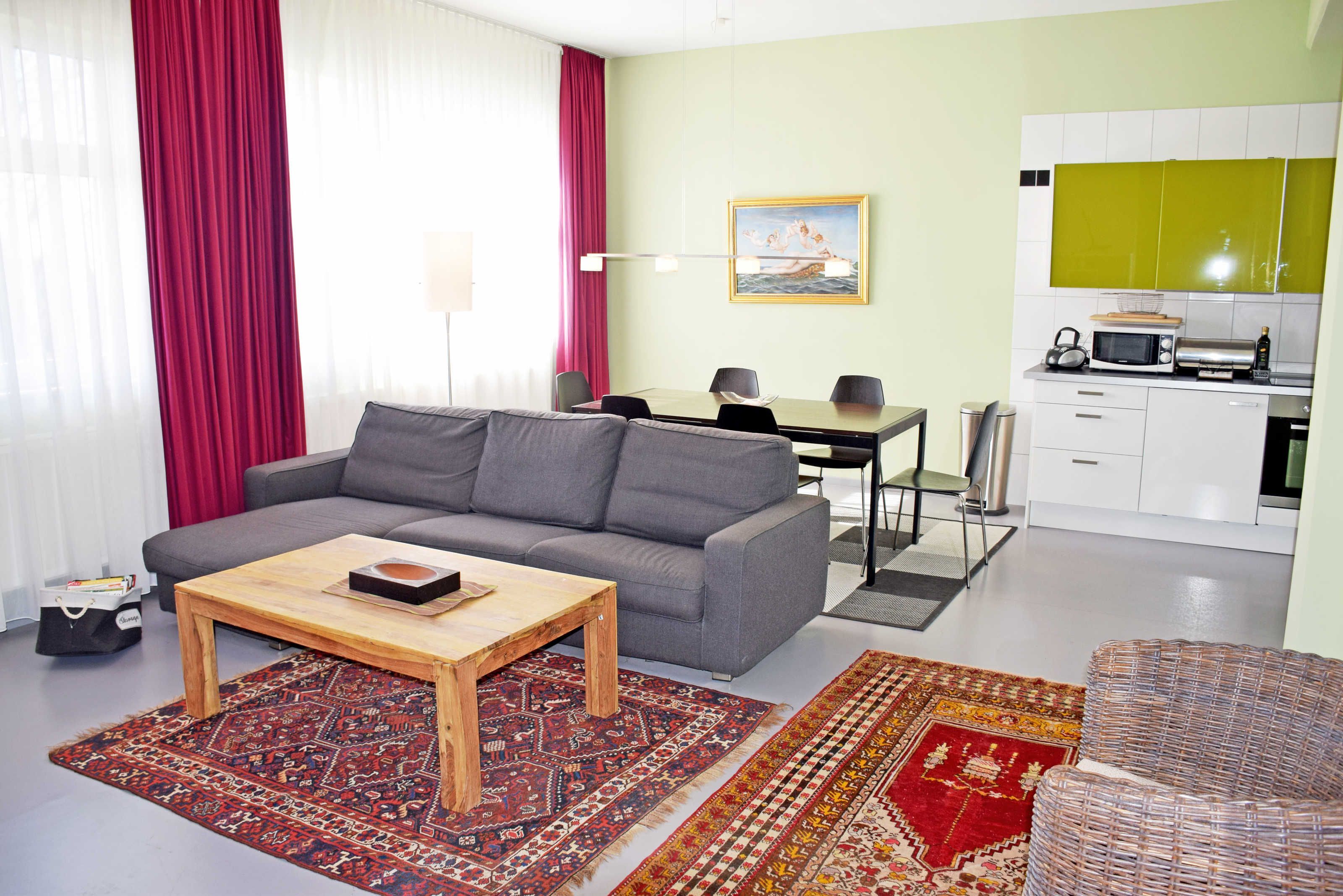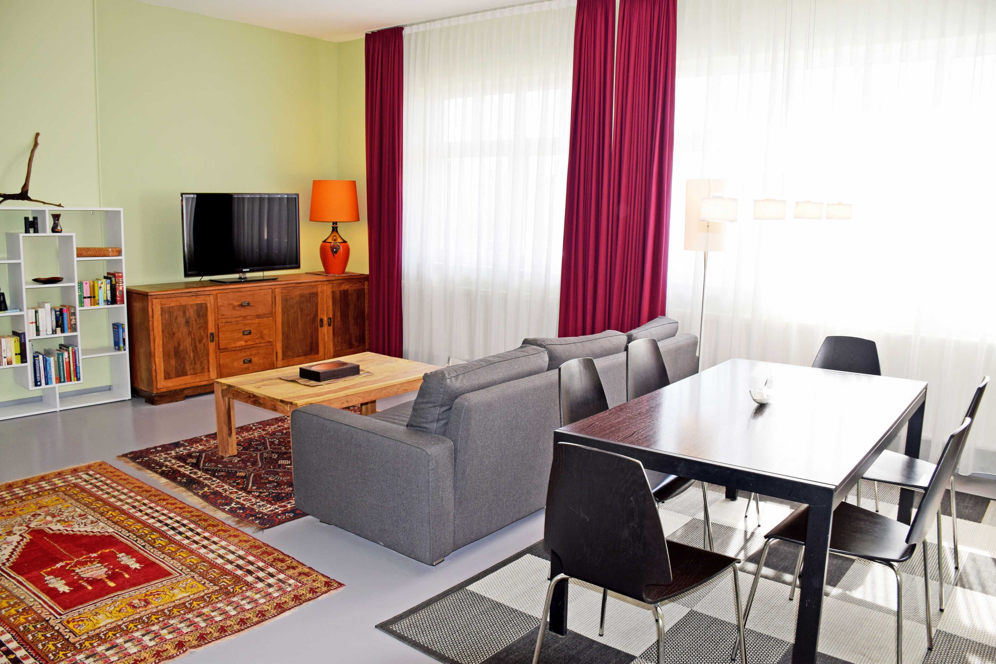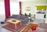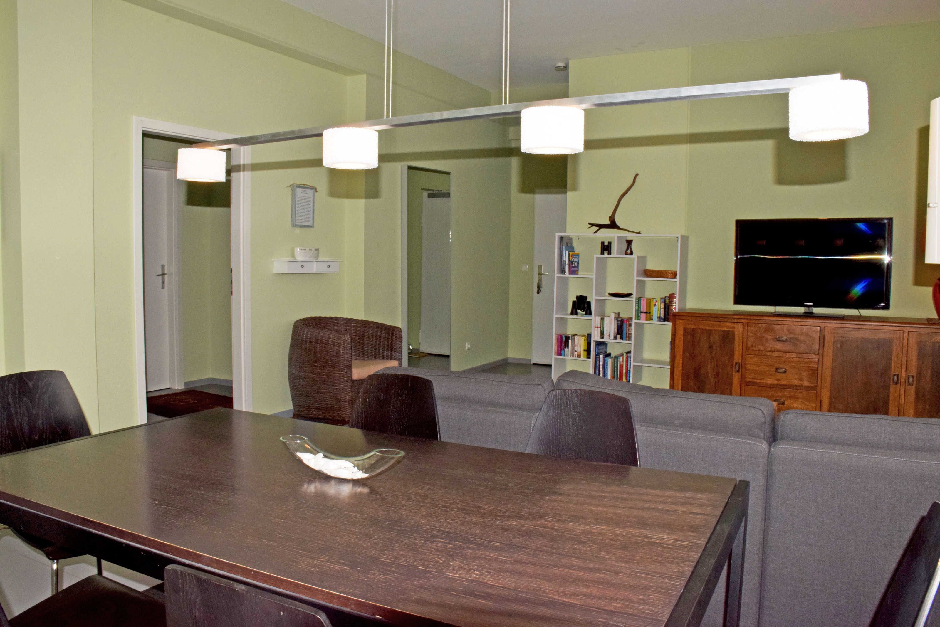 Im Wohnraum befinden sich eine bequeme Schlafcouch für einen Gast, Sessel und ein Tisch, ein modernes Flachbild-TV-Gerät. Hier steht auch ein großer Esstisch mit Stühlen.