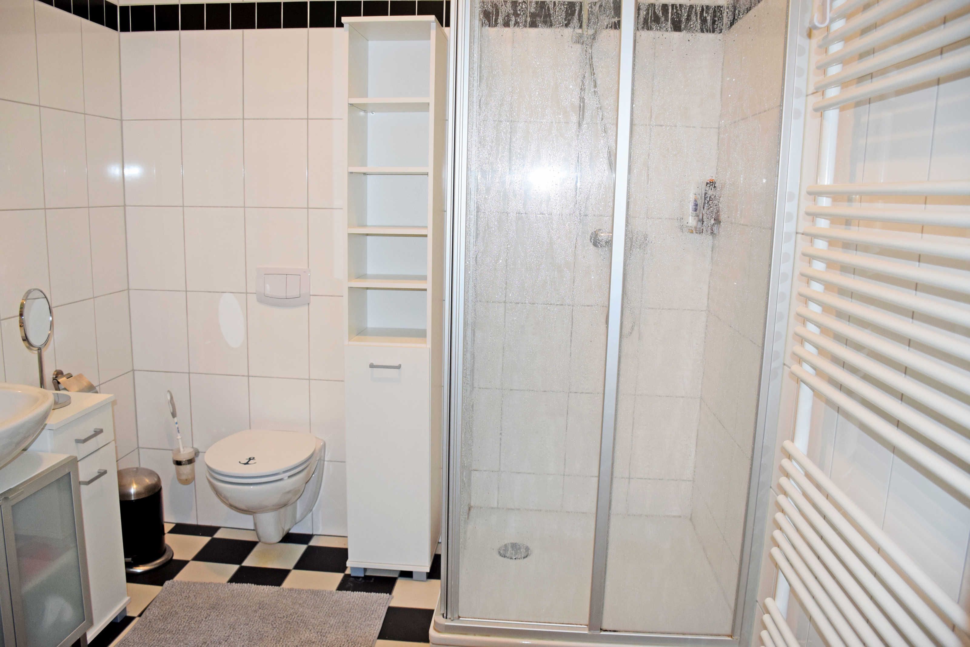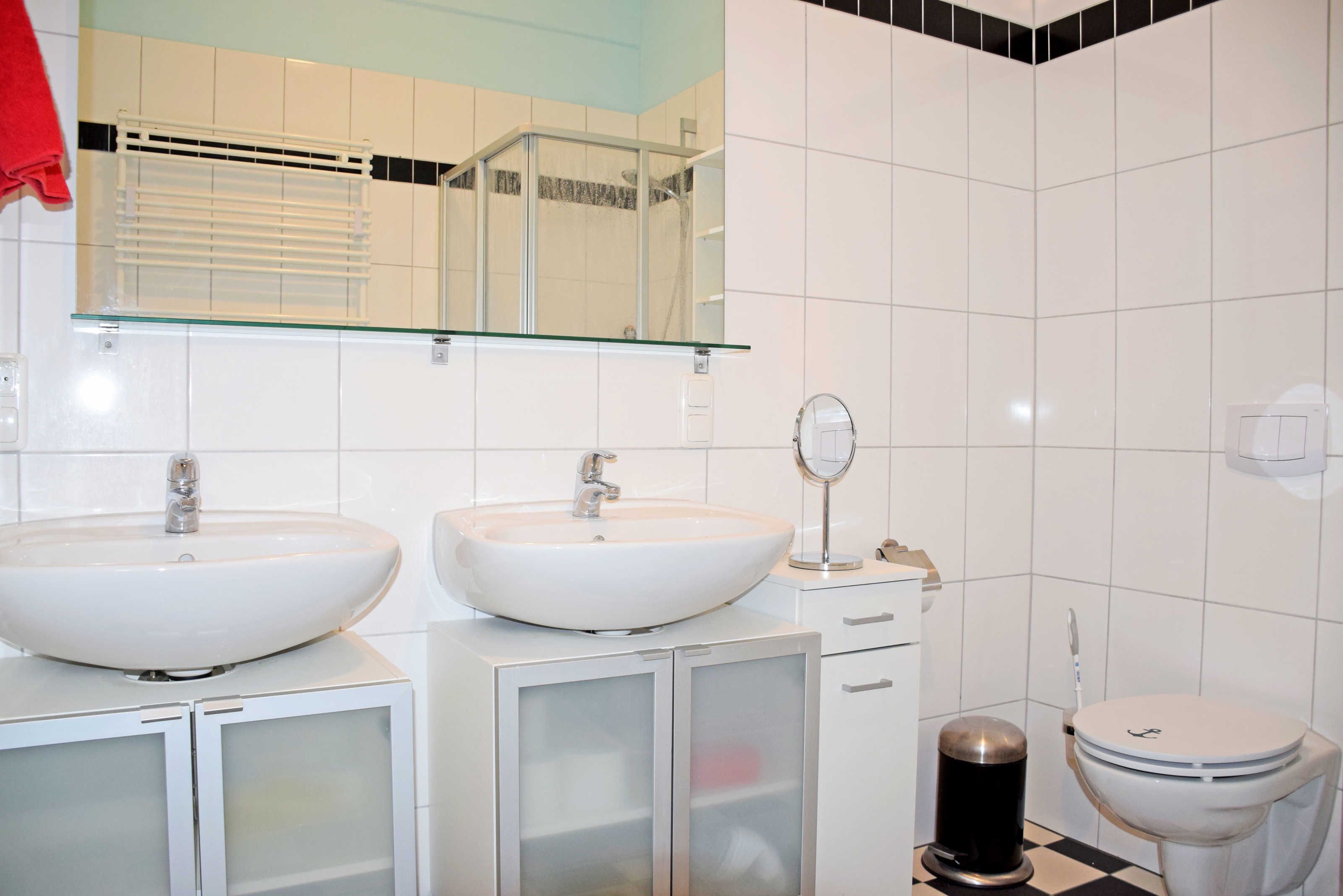 Das moderne Bad ist mit Dusche, WC und Doppel-Waschtisch ausgestattet.