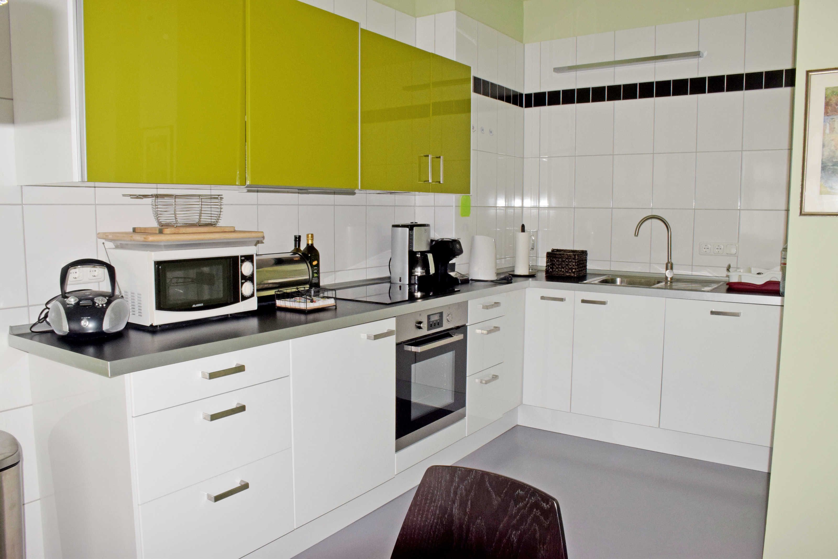 Die moderne Küchenzeile ist exklusiv ausgestattet mit Cerankochfeld, Abzugshaube, Backofen, Mikrowelle, Geschirrspülmaschine, Wasserkocher, Kaffeemaschine, Toaster und umfangreichen weiteren Küchenutensilien.