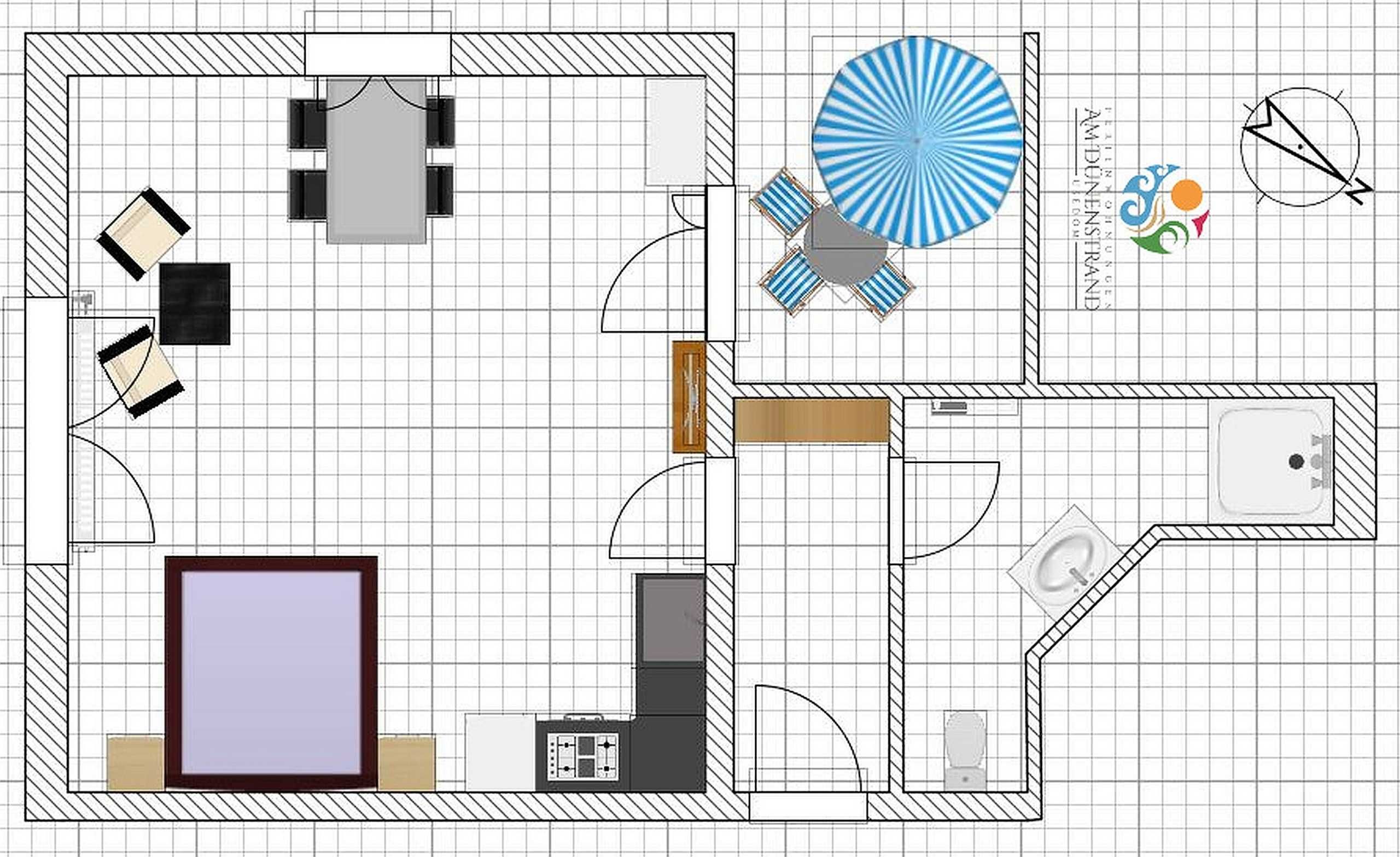 Die komfortable 1-Zimmerwohnung im Dachgeschoss (2.Etage) des Hauses ist 40 qm groß und bietet zwei Personen Platz. Die Wohnung verfügt über ein komplettes Wohnzimmer mit Esstisch, Radio, Smart-TV, einem Doppelbett mit Komforthöhe (1,80 m Liegefläche), sowie eine komplett ausgestattete Küchenzeile mit Geschirrspüler, Herd mit Ceranfeld. usw. und eine sonnige Loggia in Südlage mit münzbetriebenem Heizstrahler und Gartenmöbeln.