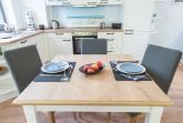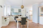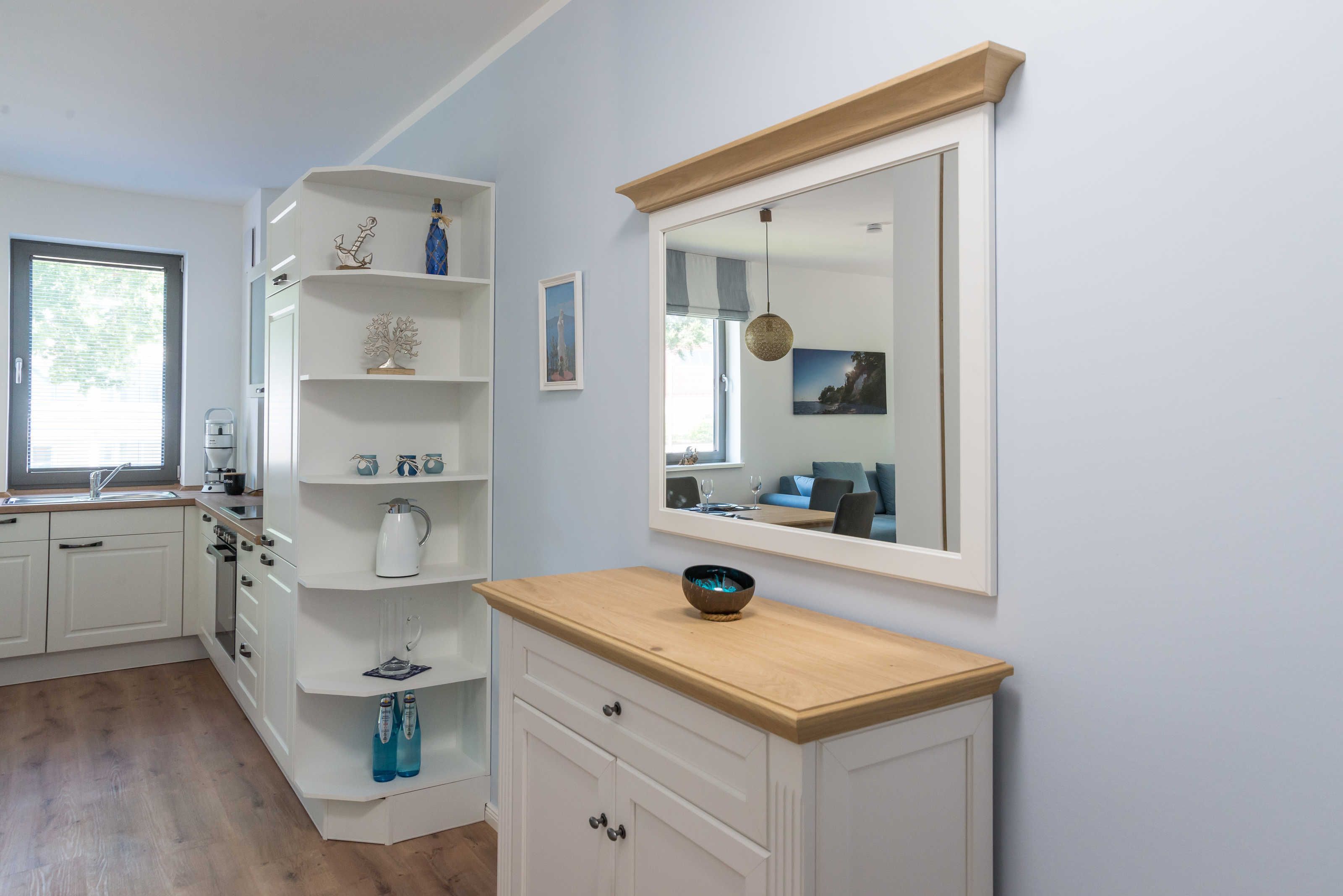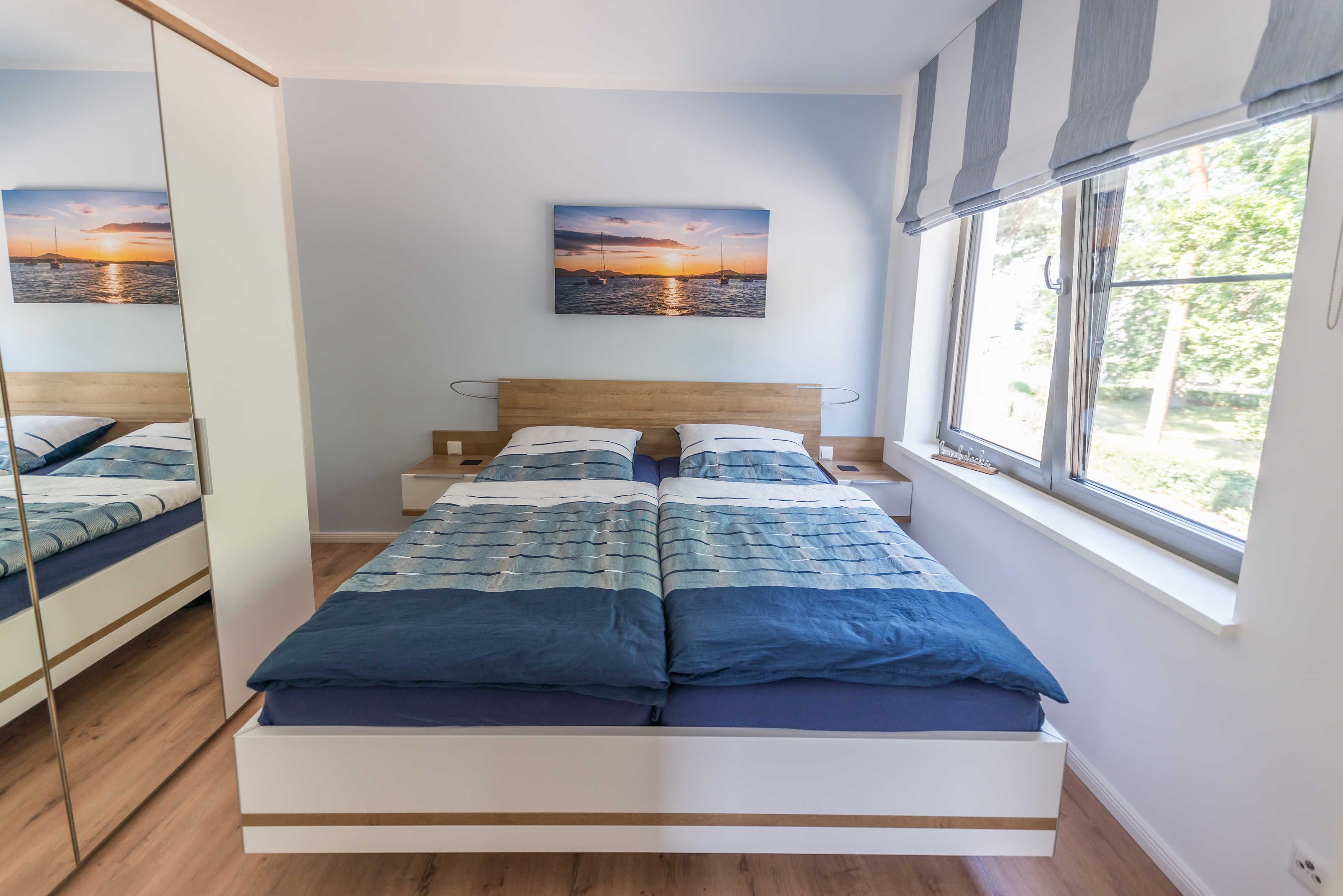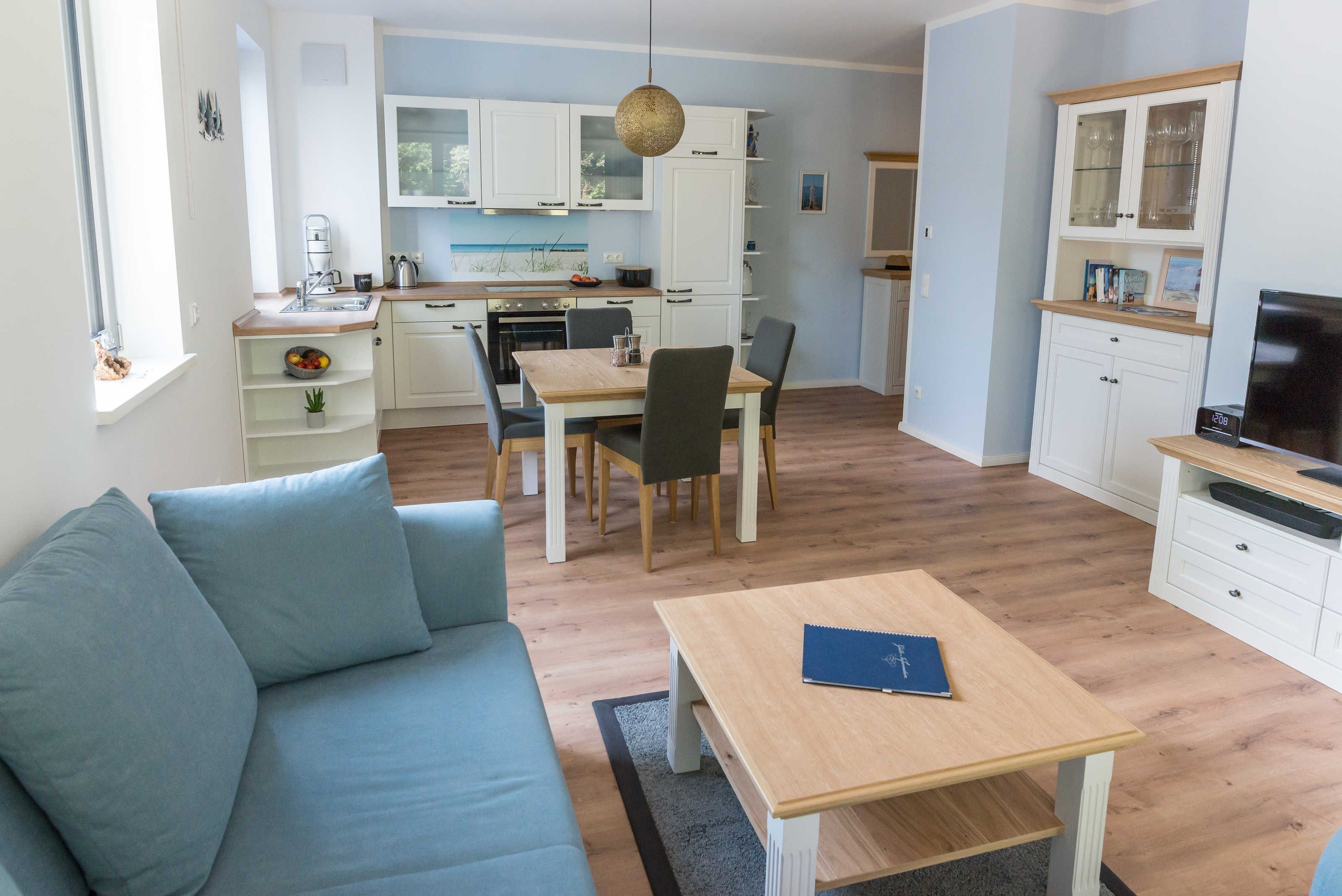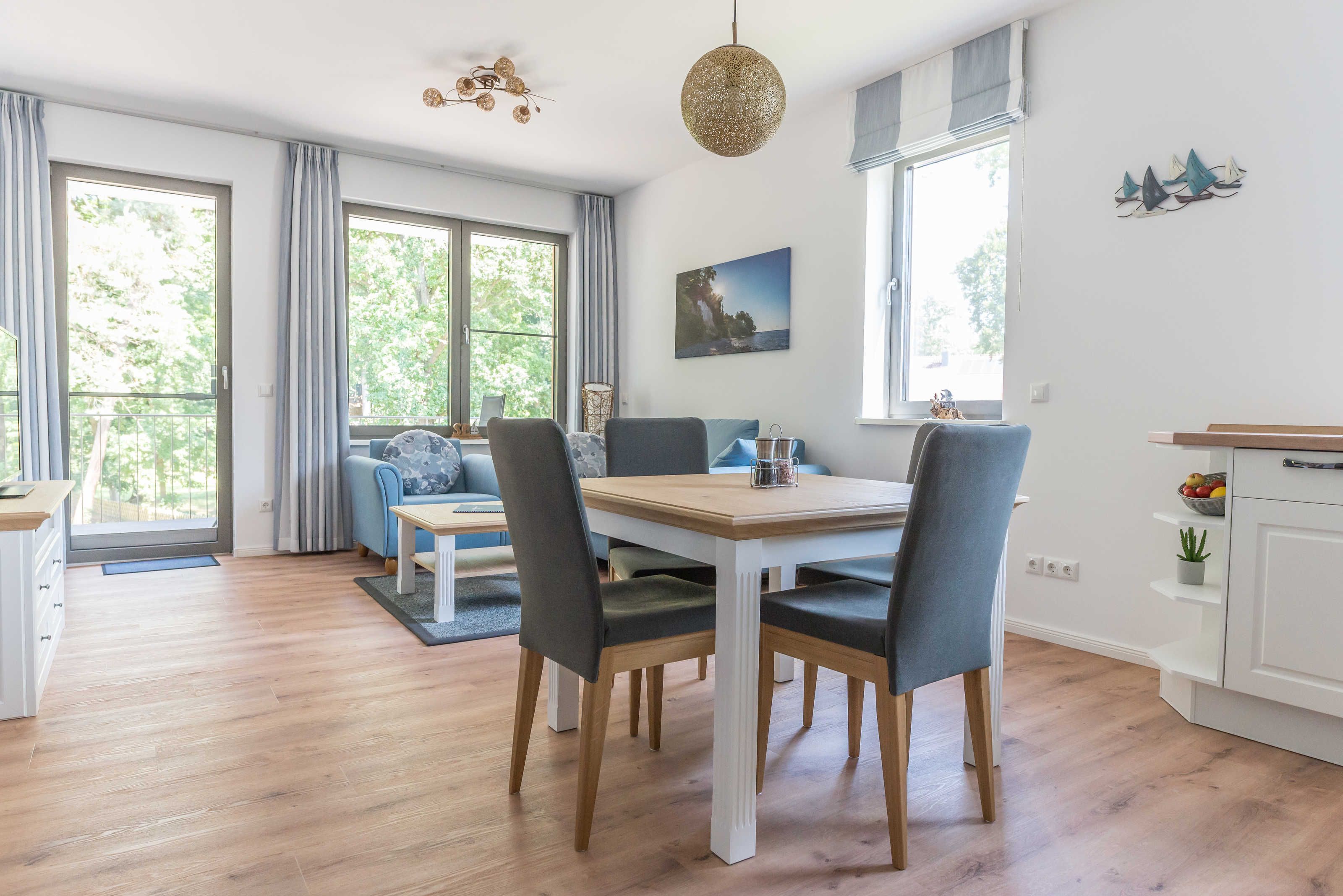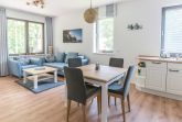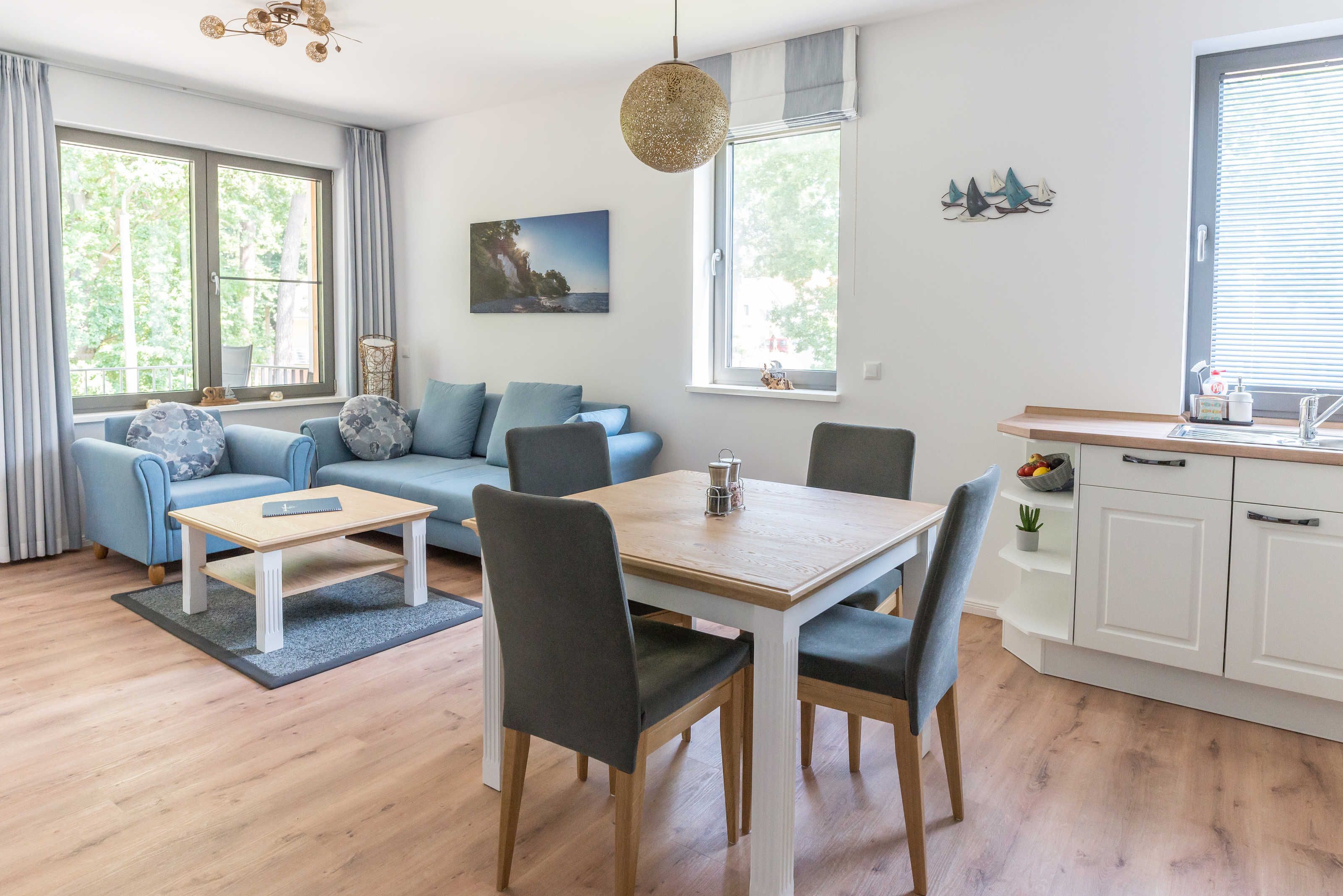 Die stilvoll und komfortabel eingerichtete Nichtraucherferienwohnung Blaue Oase befindet sich in der 1. Etage des Hauses. Die Zwei-Raum-Wohnung bietet für max. 3 Erwachsene auf 51 qm Platz zum Wohlfühlen und Entspannen. Die Wohnung ist mit viel Liebe zum Detail für einen angenehmen Aufenthalt eingerichtet. Sie ist komplett mit Insektenschutz ausgestattet und Allergiker freundlich. Der offene Wohnbereich ist mit modernen Möbeln ausgestattet und verfügt über eine bequeme ausziehbare Couch (1,60m x 2,00m) in modischem Blau sowie einen Sessel, einen Couchtisch, einer Stehlampe, ein Sideboard und eine Vitrine. Für die Unterhaltung stehen Ihnen ein Smart-TV und ein DAB-Radio mit Bluetooth zur Verfügung sowie ein kostenloser Internetanschluss (WLAN). Von hier gelangen Sie auch auf den überdachten Balkon (Norden), wo Ihnen eine Sitzgarnitur für einen gemütlichen Tagesausklang in der Abendsonne zur Verfügung steht. Dabei genießen Sie einen entspannenden Blick auf den Park. Die hochwertig eingerichtete Einbauküchenzeile im Landhausstil besitzt ein Cerankochfeld, Backofen, Kühlschrank mit Gefrierfach, Toaster, Wasserkocher, Kaffeemaschine, Eierkocher sowie umfangreiche Küchenutensilien. Der Essbereich schließt sich an und besteht aus einem Esstisch und gepolsterten Stühlen. Die Fenster sind hier nach Osten gerichtet, so dass Sie zum Frühstück die Morgensonne genießen können. Für einen erholsamen Schlaf steht Ihnen ein bequemes Doppelbett (1,80m x 2,00m) mit verstellbaren Lattenrosten zur Verfügung. Nachttisch mit Leuchten, ein großzügiger Kleiderschrank und eine Verdunklungsmöglichkeit ergänzen die Ausstattung im Schlafzimmer. Alle Räume haben hochwertige Böden aus Vinyl in schöner Eichenoptik. Eine Fußbodenheizung sorgt an kühleren Tagen für wohlige Wärme. Im innenliegenden Bad finden Sie einen Waschtisch, ein Wandspiegel, eine ebenerdige Regendusche, ein WC, ein Fön sowie ein Handtuchtrockner. Der Flurbereich ist mit einer Kommode, einem Spiegel und einem Wandschrank ausgestattet. Die Wohnung verfügt über einen Staubsauger, einen Wäscheständer und Reinigungsutensilien. Ihre eigenen oder gemieteten Fahrräder können Sie in einen Fahrradständer im begrünten Außenbereich abstellen und sichern. In der Tiefgarage (Einfahrtshöhe 2,15m) steht Ihnen ein PKW-Stellplatz (Nr. 95) zur Verfügung. Von dort können Sie mit Ihren Koffern und Einkäufen bequem mit dem Fahrstuhl zur Wohnung Blaue Oase im 1. OG fahren. Haustiere sind nicht erlaubt. Die Erstausstattung eines Wäschepaketes (komplette Bettwäsche, 1 Duschhandtuch, 2 kleine Handtücher) können Sie bis 14 Tage vor der Anreise gegen einen Aufpreis dazu buchen oder durch eigene ergänzen. Ab 2 gebuchten Paketen erhalten Sie einmalig 1 Geschirrtuch und einen Duschvorleger dazu. Genießen Sie Ihren Aufenthalt in der Blauen Oase einfach ein Ort des Wohlfühlens.