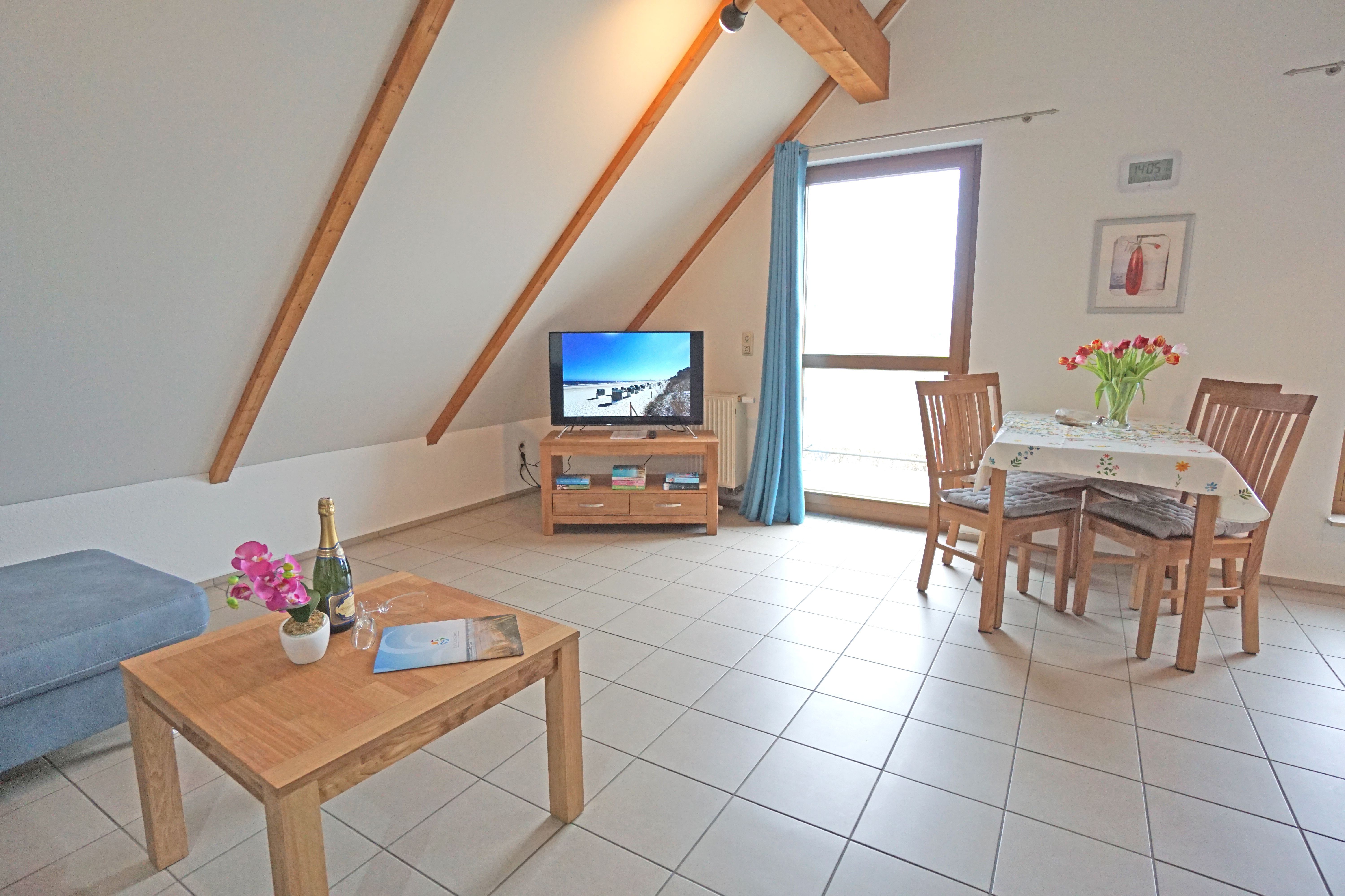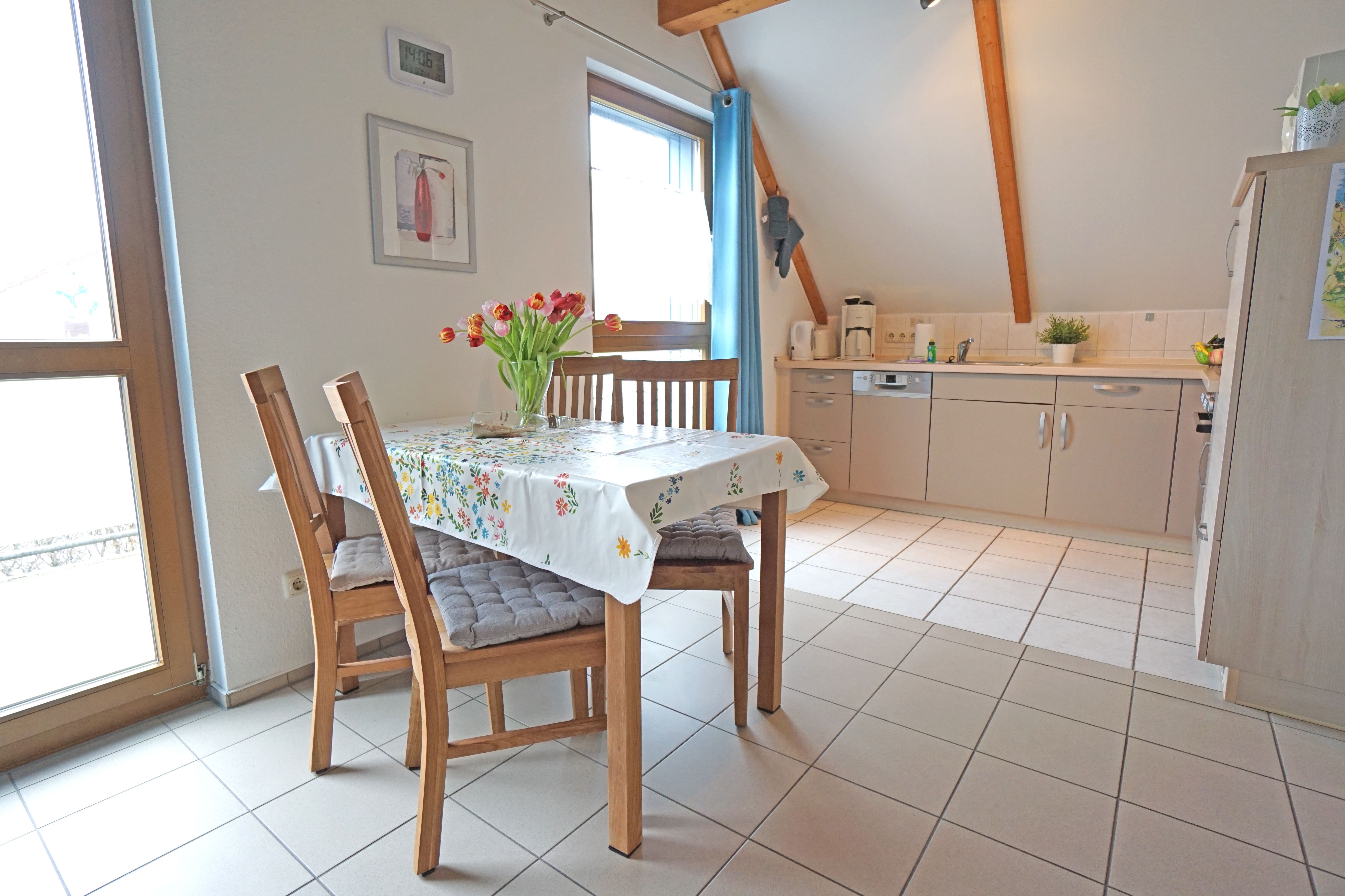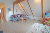 Die Wohnungen im Dachgeschoss bieten Platz für 2 Personen und sind ca. 45 m ² groß. Sie sind aufgeteilt in ein Schlafzimmer, einen Wohnraum mit Einliegerküche, ein komfortables Bad und ein Balkon.