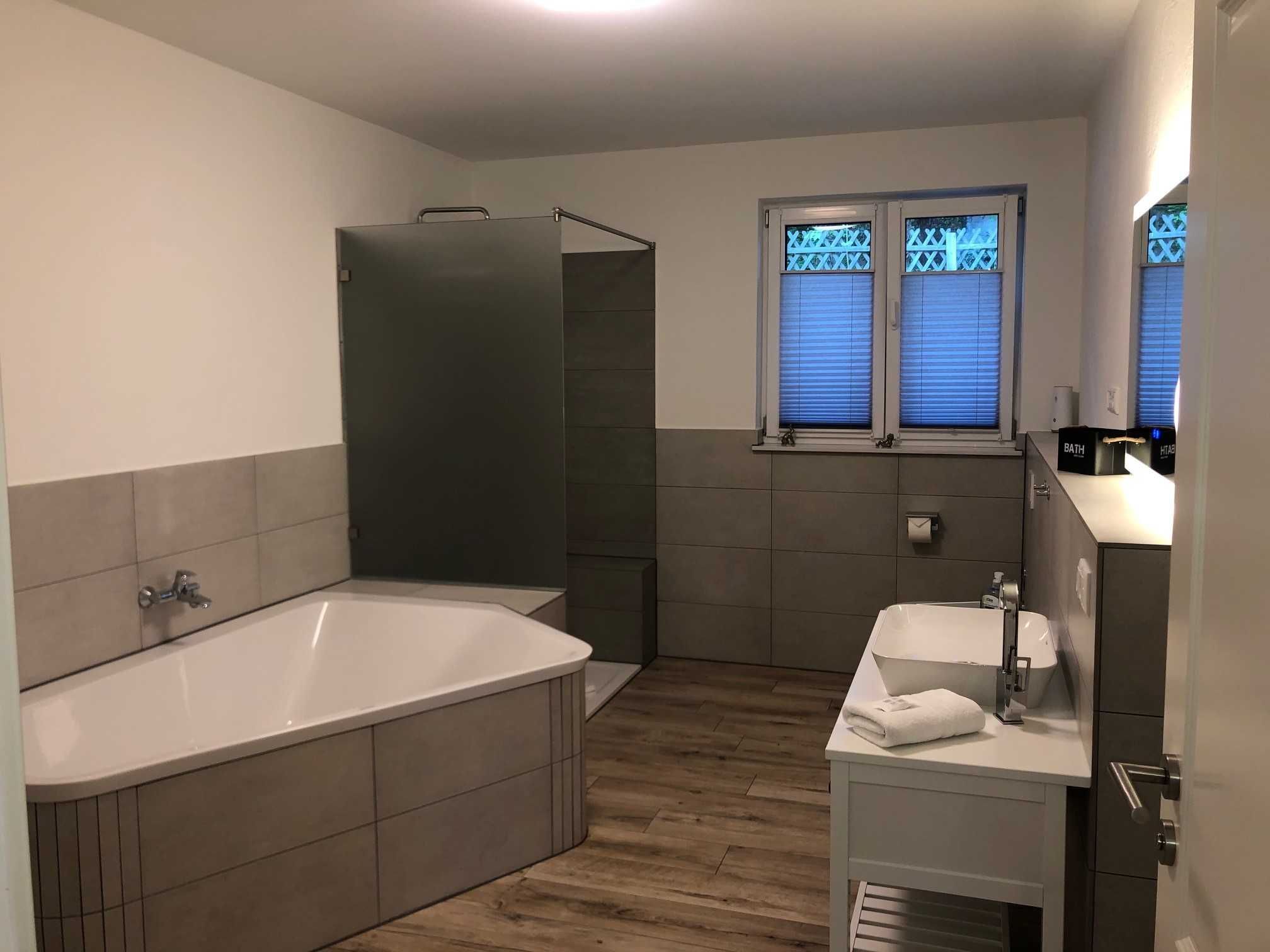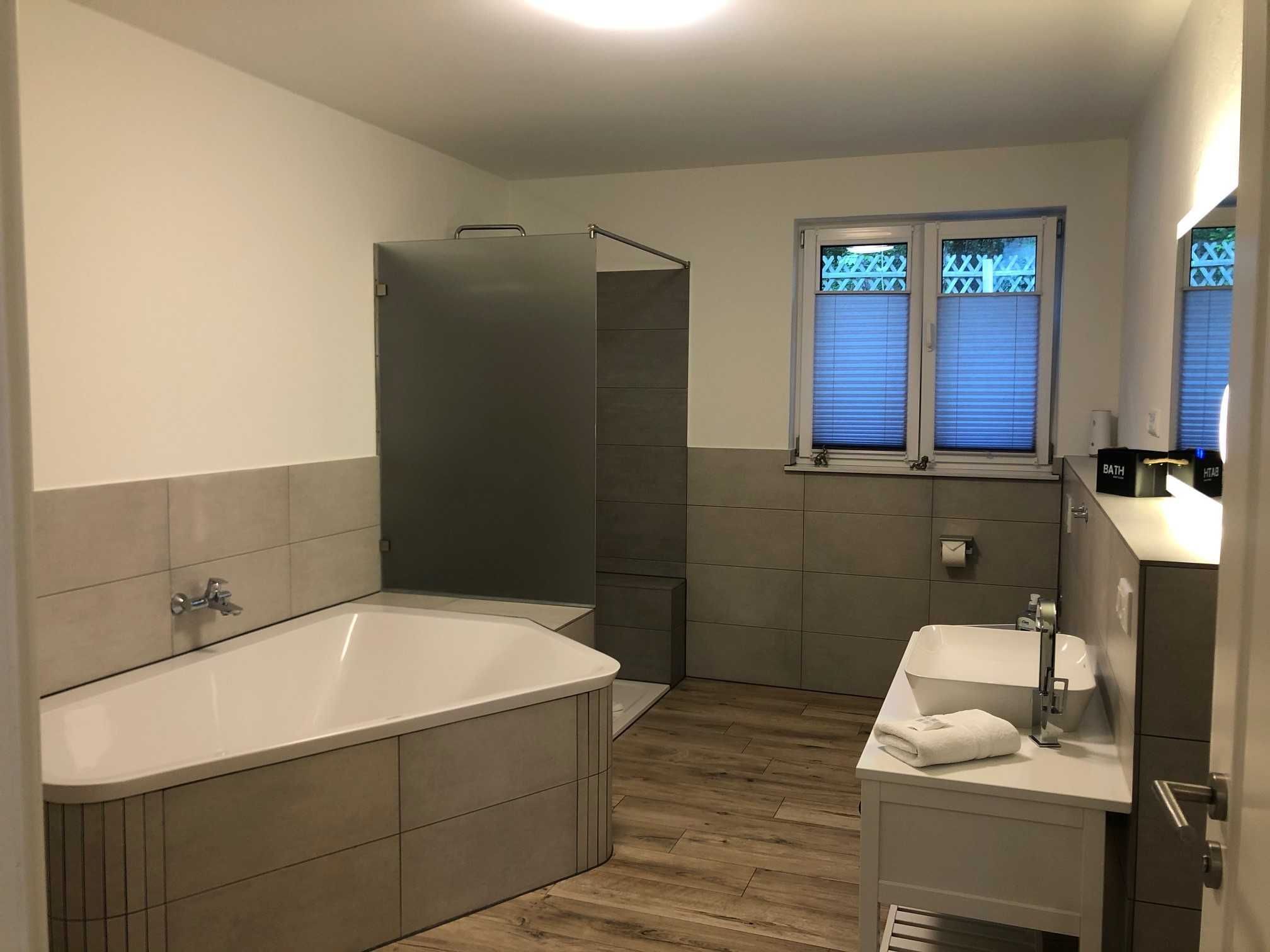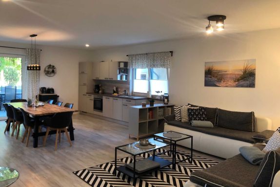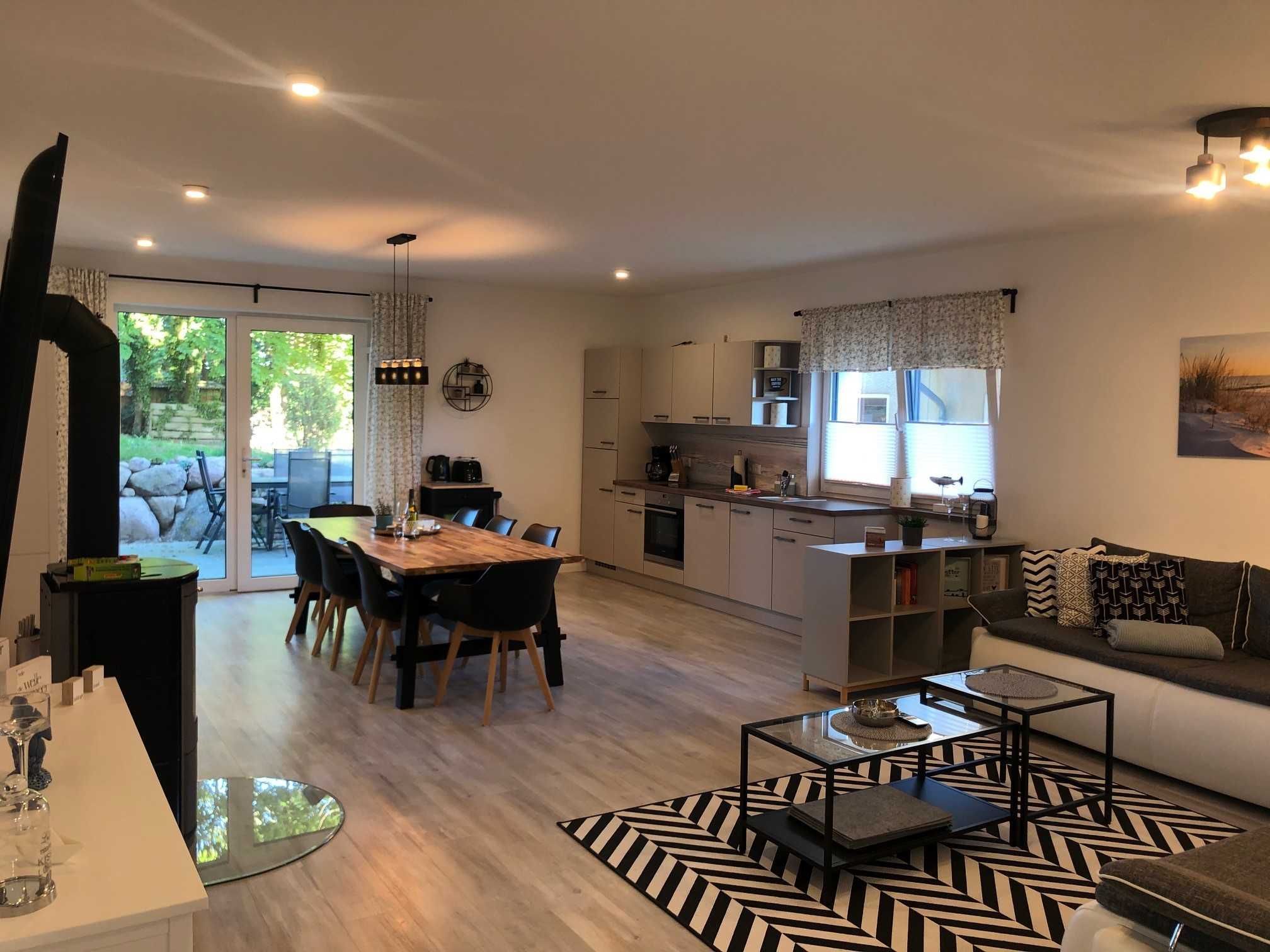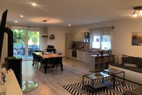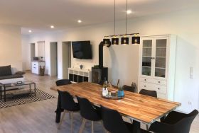 Diese helle und moderne 130 qm große Ferienwohnung bietet Platz für bis zu 8 Personen und 2 Babies und verfügt über einen Wohnbereich mit Kamin, Smart-TV sowie einen großen Esstisch mit acht Stühlen. Die angrenzende offene Küchenzeile ist mit Elektroherd, Backofen, Kaffeemaschine, Wasserkocher, Toaster und ausreichend Geschirr ausgestattet. Es gibt 3 Schlafzimmer, 2 Schlafzimmer haben je ein Doppelbett und das dritte Schlafzimmer zwei Einzelbetten, wobei diese auch zu einem Doppelbett gestellt werden können. Im Wohnbereich befinden sich 2 gemütliche Schlafcouchen für 2 weitere Personen. Die Wohnung verfügt über zwei Bäder, das größere Bad hat eine Dusche, WC und eine Badewanne und das kleinere Bad eine große Dusche und WC. Der Flurbereich wurde großzügig gestaltet, hier befinden sich auch zwei Relaxliegen zum Entspannen und Verweilen. Komplettiert wird die gehobene Ausstattung der Wohnung durch die 20 qm große möblierte Sonnenterrasse mit Blickrichtung zum Wald. Hier können Sie morgens bei schönstem Wetter das Frühstück genießen oder den Abend bei einem Glas Wein ausklingen lassen. WLAN sowie ein Parkplatz für Ihren Pkw sind im Preis inbegriffen.
