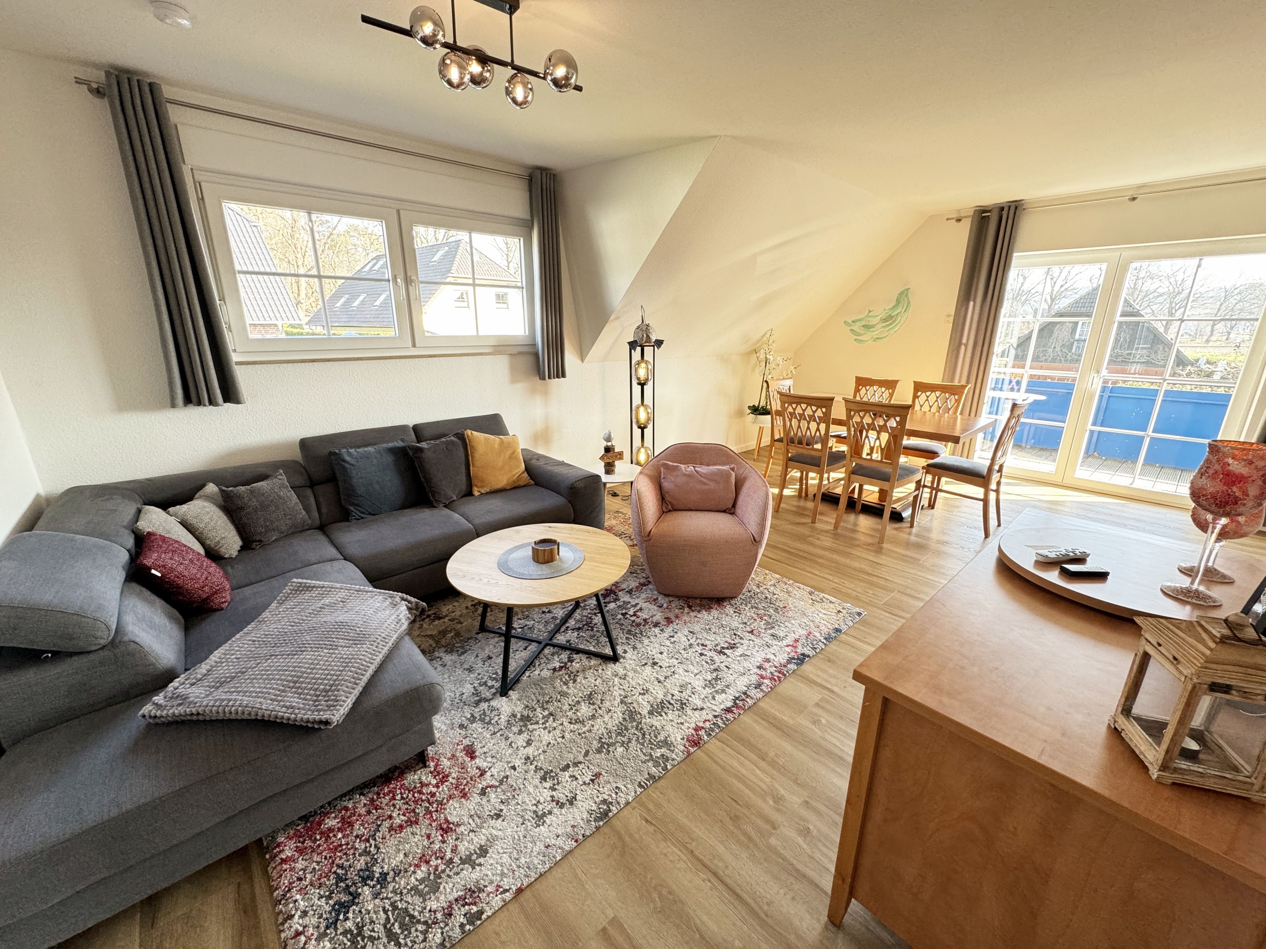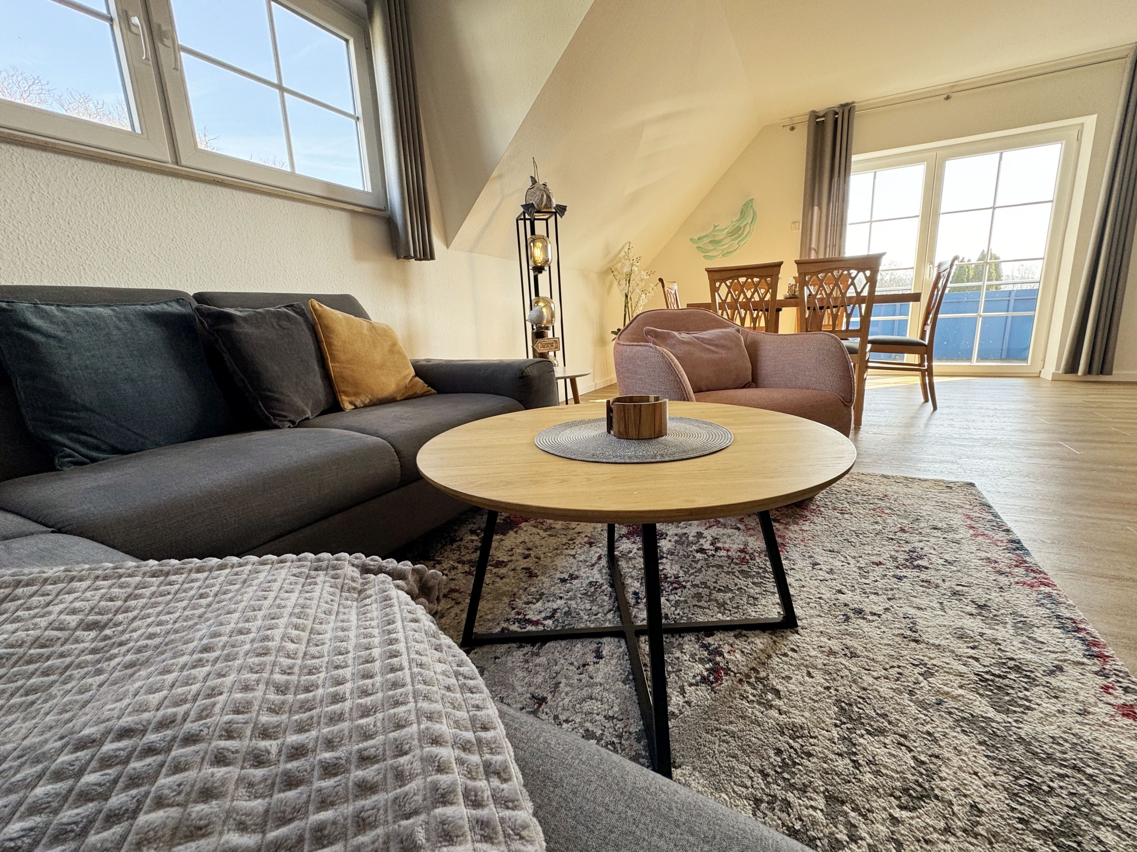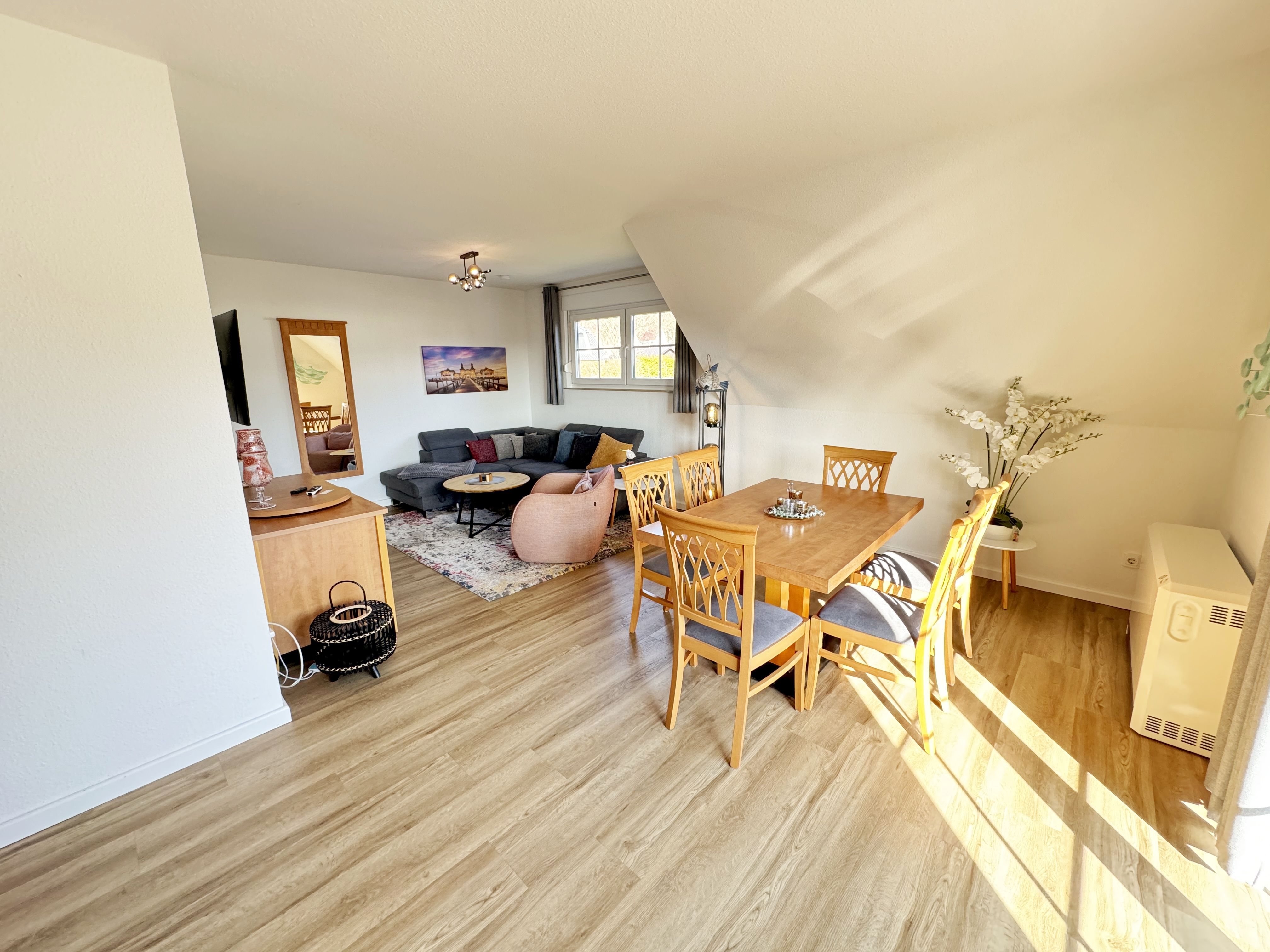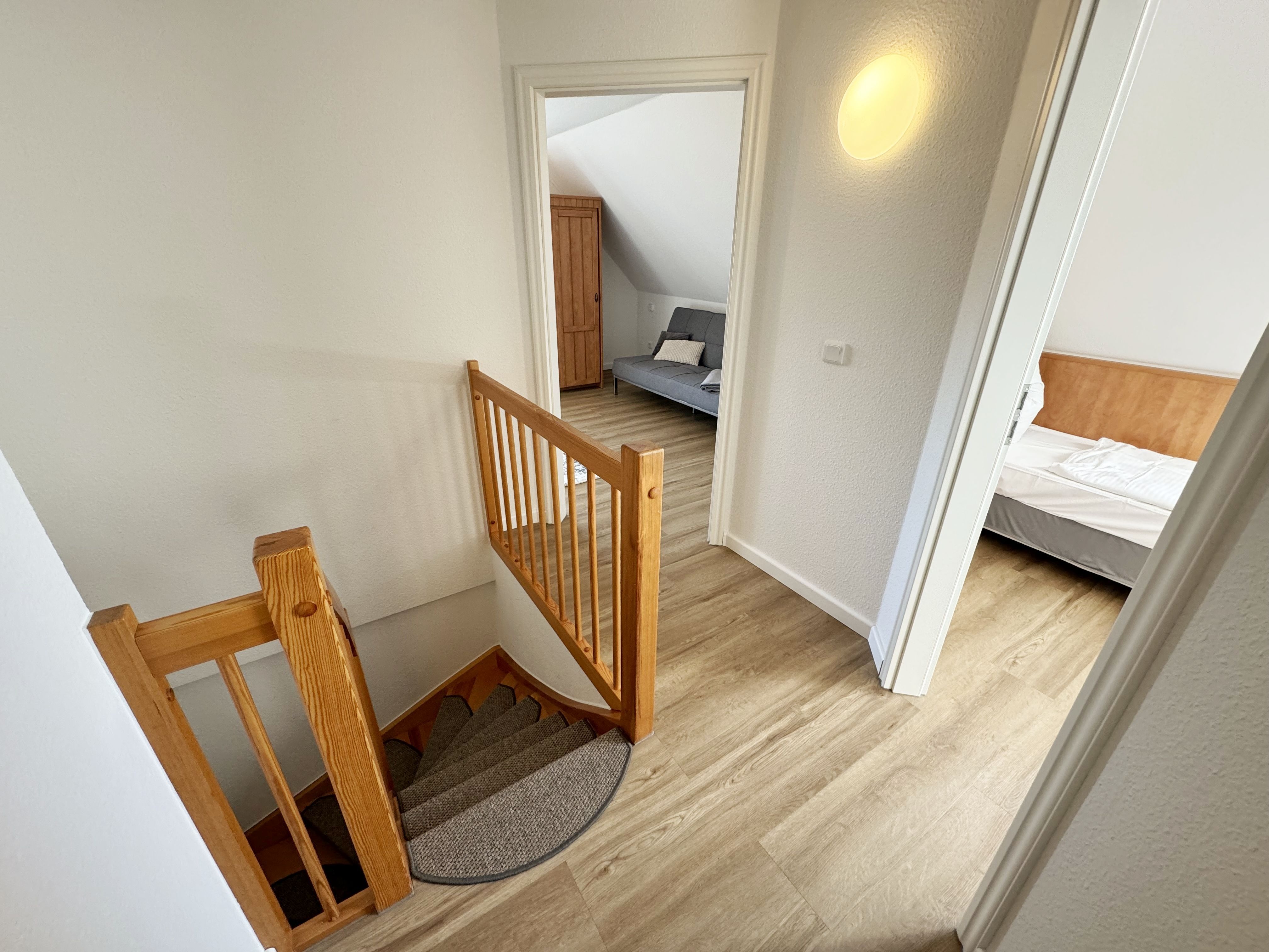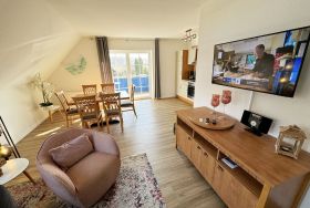 Die Nichtraucherwohnung mit ca. 66 m² besticht durch ihre komfortable Raumaufteilung. Die in 1. Obergeschoss liegende Maisonettferienwohnung Nr.12 bietet ausreichend Platz für 2 bis 4 Erwachsene + 1 Kind bis 10 Jahre. Im Wohnbereich wird die Unterhaltungstechnik durch einen modernen Smart-TV, ein CD-Player und ein Radio abgerundet. Auch im Urlaub müssen Sie nicht auf einen Internetanschluss (W-LAN) verzichten. Dieser ist für Sie inklusive. Für die Gemütlichkeit wurde der Wohnbereich mit zwei Couchen, einen Sessel, Couchtisch und einem Sideboard ausgestattet. Den bestuhlten Balkon (Osten) mit einem Sonnenschirm sowie einer Sonnenliege können Sie vom Wohnbereich erreichen. Er lädt bei einem Glas Wein zum Entspannen ein und bietet Ihnen etwas Blick auf den Selliner See. Die angrenzende Küchenzeile verfügt über eine Spülmaschine, eine Mikrowelle, Ceranfeld mit Backofen, Kühlschrank, Wasserkocher, Toaster, Kaffeemaschine, Eierkocher und diverse Küchenutensilien. Ein Esstisch für 6 Personen kann auch für einen unterhaltsamen Spieleabend genutzt werden. Das 1. Schlafzimmer wurde mit einem Doppelbett (1,80 m x 2,00 m), Nachttischablagen, einen Kleiderschrank sowie eine Couch (1,10m x 1,90m) welche als Aufbettung für das Kind genutzt werden kann, ausgestattet. Das 2. Schlafzimmer verfügt über 2 Einzelbetten (0,90 m x 2,00 m), Nachttischablagen und einen Kleiderschrank. Im Tageslichtbad befinden sich eine Dusche, ein Waschtisch, ein WC und ein Fön. Beide Schlafzimmer sowie das Bad erreichen Sie bequem über die Treppe da Sie sich im oberen Bereich befinden. Fensterläden und Vorhänge dienen zum Verdunkeln der Räumlichkeiten. In allen Räumlichkeiten finden Sie Nachtspeicheröfen. Ein Wäscheständer sowie Reinigungsutensilien stehen für Sie bereit. Maximal 2 Haustiere können gegen eine Gebühr dazu gebucht werden. Ein PKW-Stellplatz Nr. 12 befindet sich direkt auf dem Grundstück. Ihre mitgebrachten oder geliehenen Fahrräder können Sie nach Verfügbarkeit im abschließbaren Fahrradraum unterstellen. Die Erstausstattung eines Wäschepaketes (komplette Bettwäsche, 1 Duschhandtuch, 1 kleines Handtuch) können Sie bis 14 Tage vor Anreise gegen einen Aufpreis dazu buchen oder durch eigene ergänzen. Ab 2 gebuchten Paketen erhalten Sie einmalig 1 Geschirrhandtuch und 1 Duschvorleger dazu.
