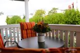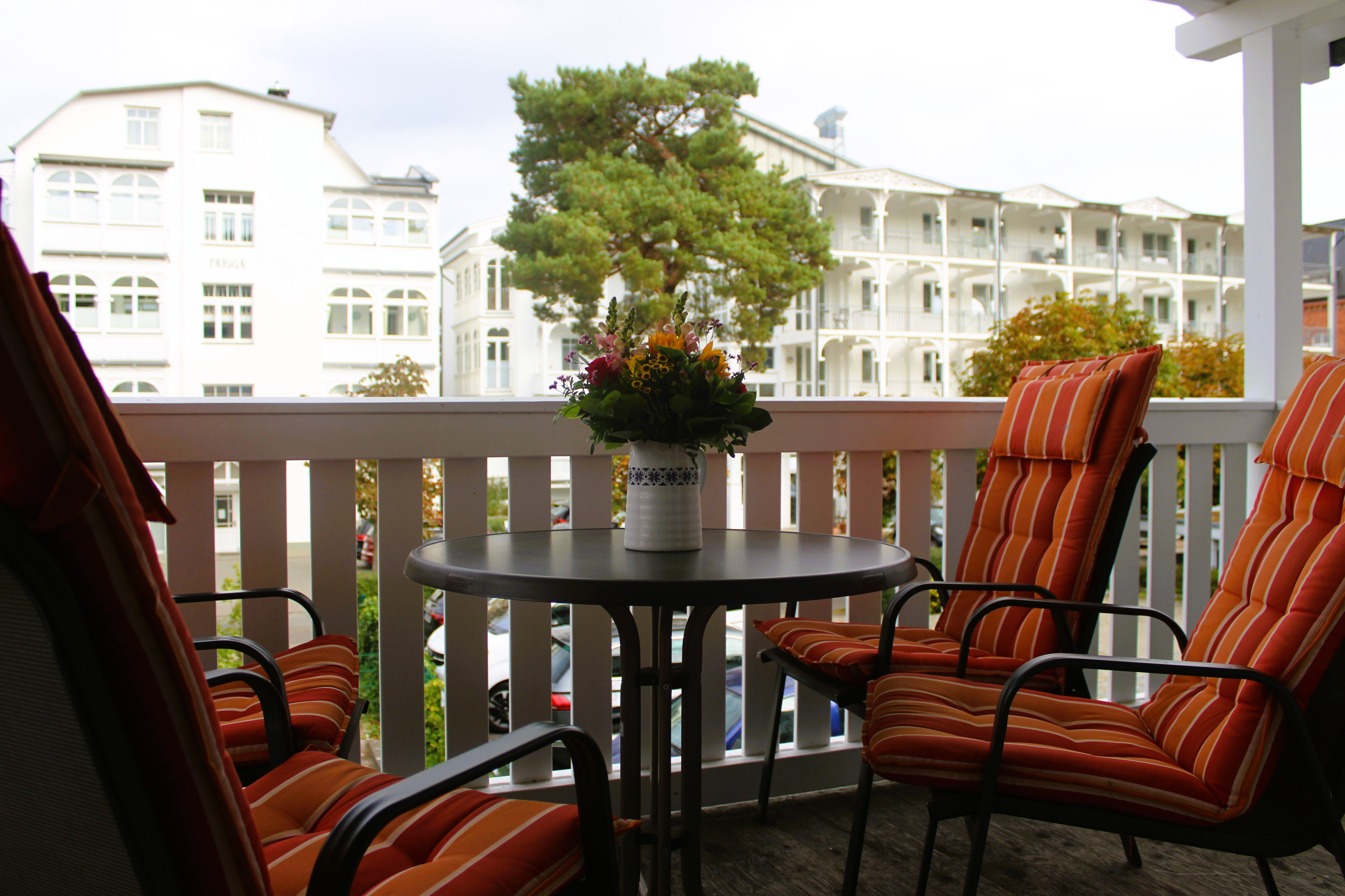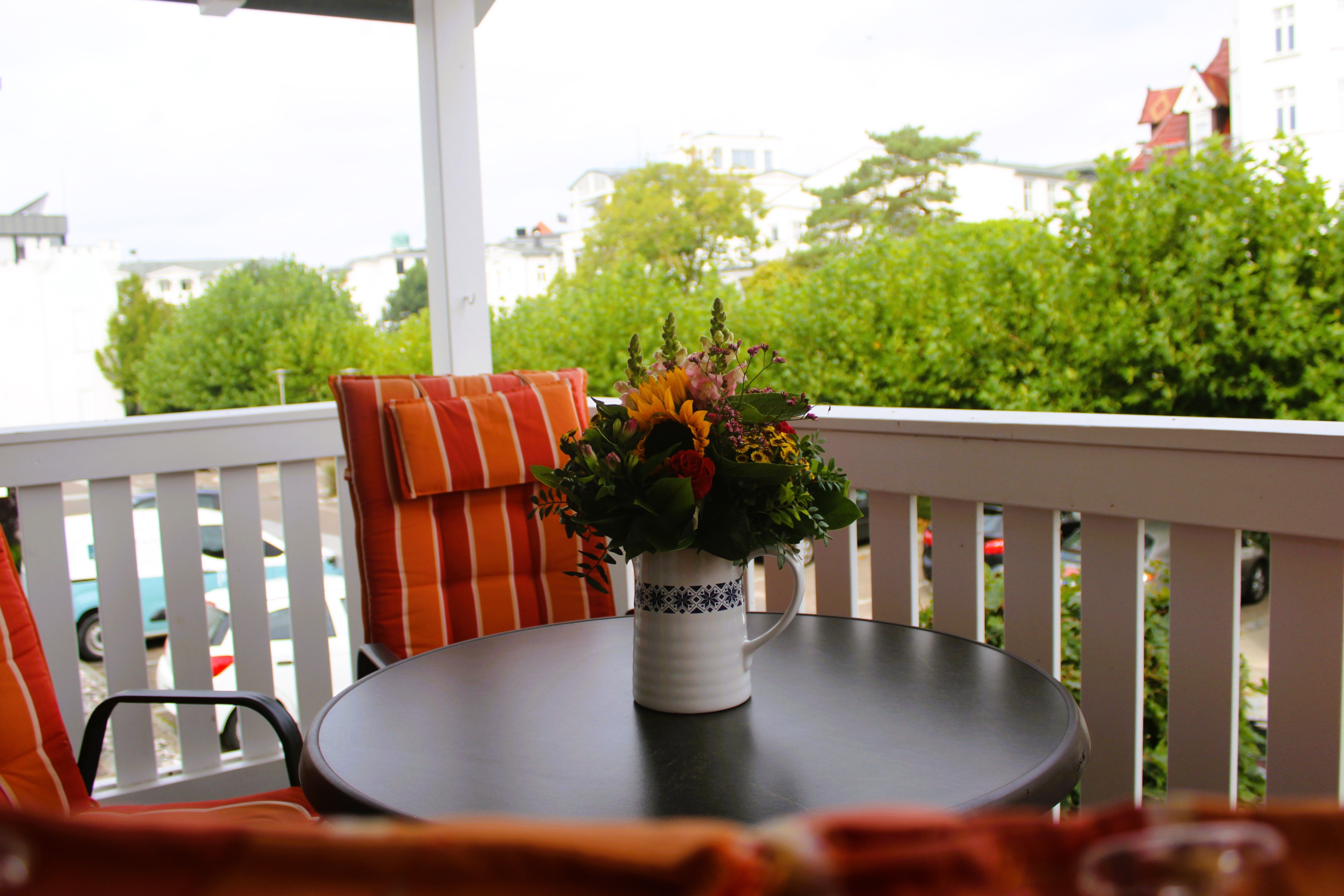 Der großzügige, möblierte Balkon, der vom Wohnbereich aus zugängig ist, bietet einen wunderbaren Blick auf die stilvollen vorgelagerten Bäderstilvillen.