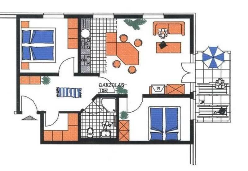 Es verfügt über einen offenen Wohnbereich mit integrierter Essecke und Küche. Weiter über 2 Schlafzimmer und ein Bad mit Dusche/WC.