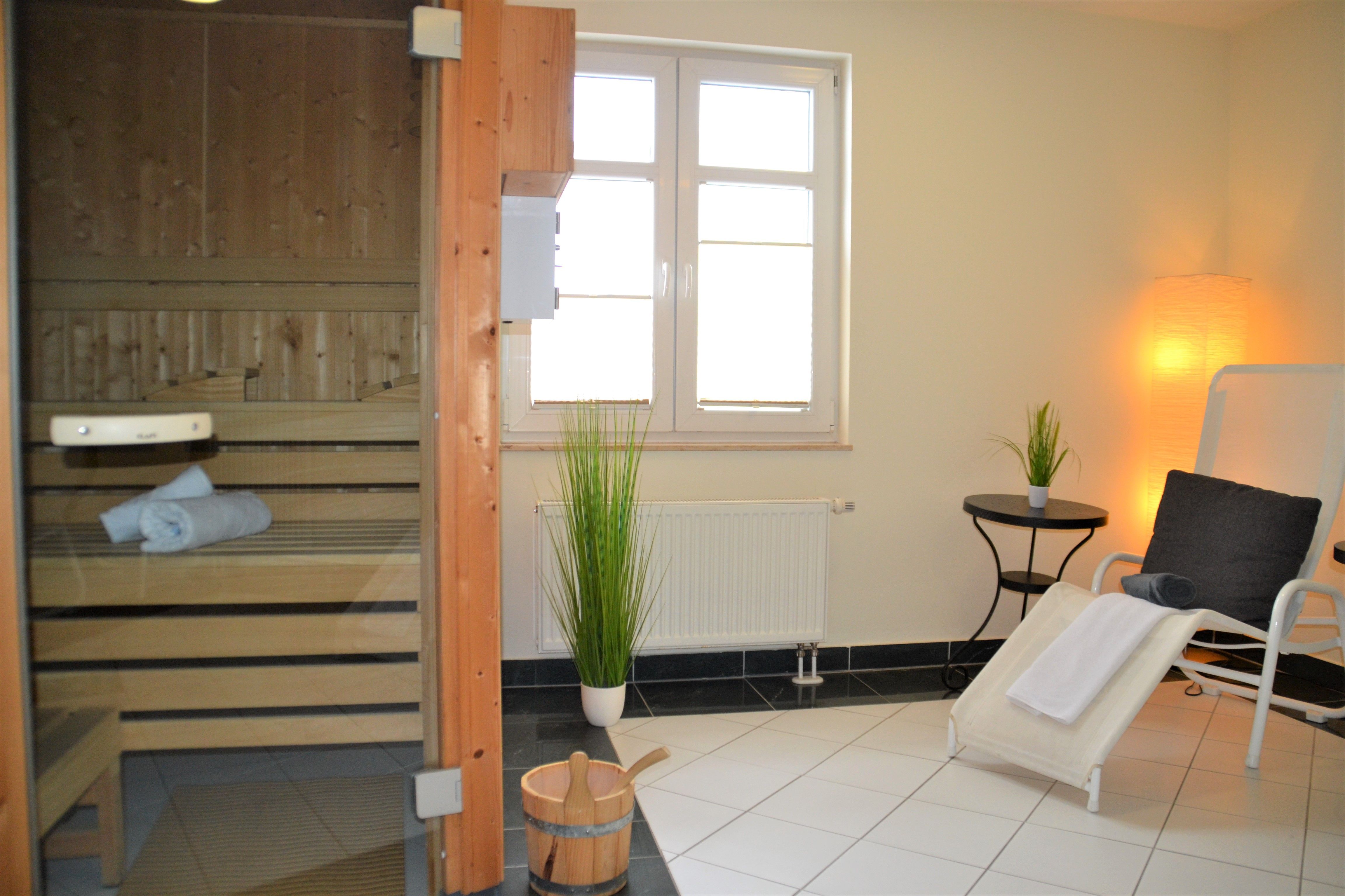 Ebenfalls auf der 1. Etage befindet sich ein Saunabereich mit Dusche. Ruheliegen in dem kleinen Wellness-Areal laden zum Erholen ein.