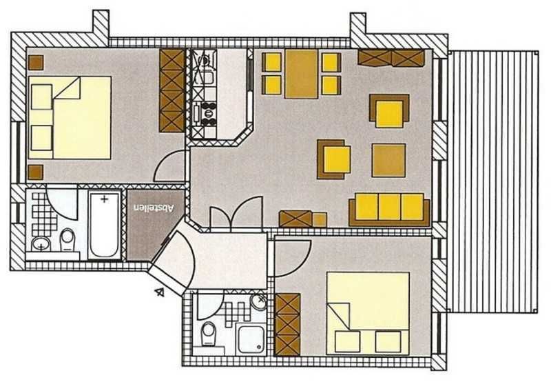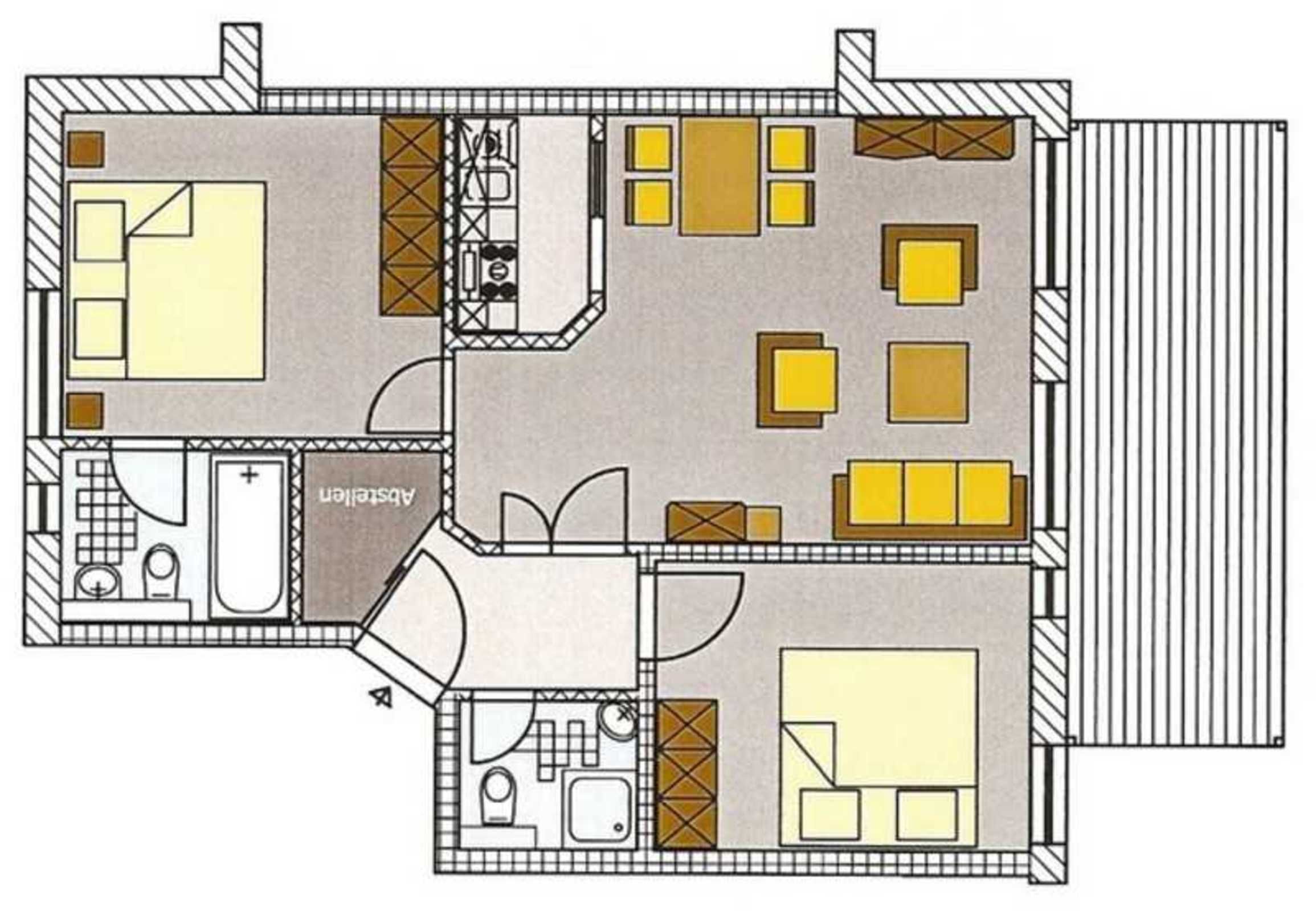Das App. verfügt über 2 Schlafzimmer (je 1 Doppelbett 1,60 m x 2,00 m), 2 Bäder (einmal Wanne/WC und einmal DU/WC) und einen großen Wohn-/Essbereich mit integrierter Küche. Die 3 Fernseher (im Wohnbereich und in den 2 Schlafzimmern) sind internetfähig. Es gibt eine schick möblierte Terrasse.