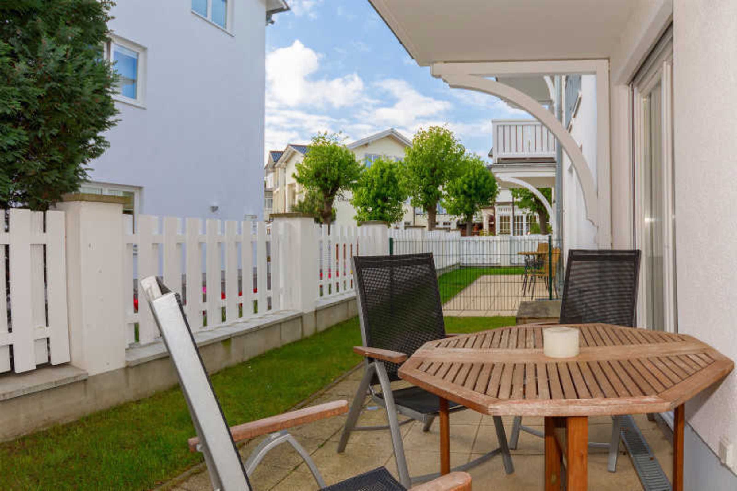 Des Weiteren gibt es eine schick möblierte Terrasse, auf der der Gast seine Urlaubszeit genießen kann.