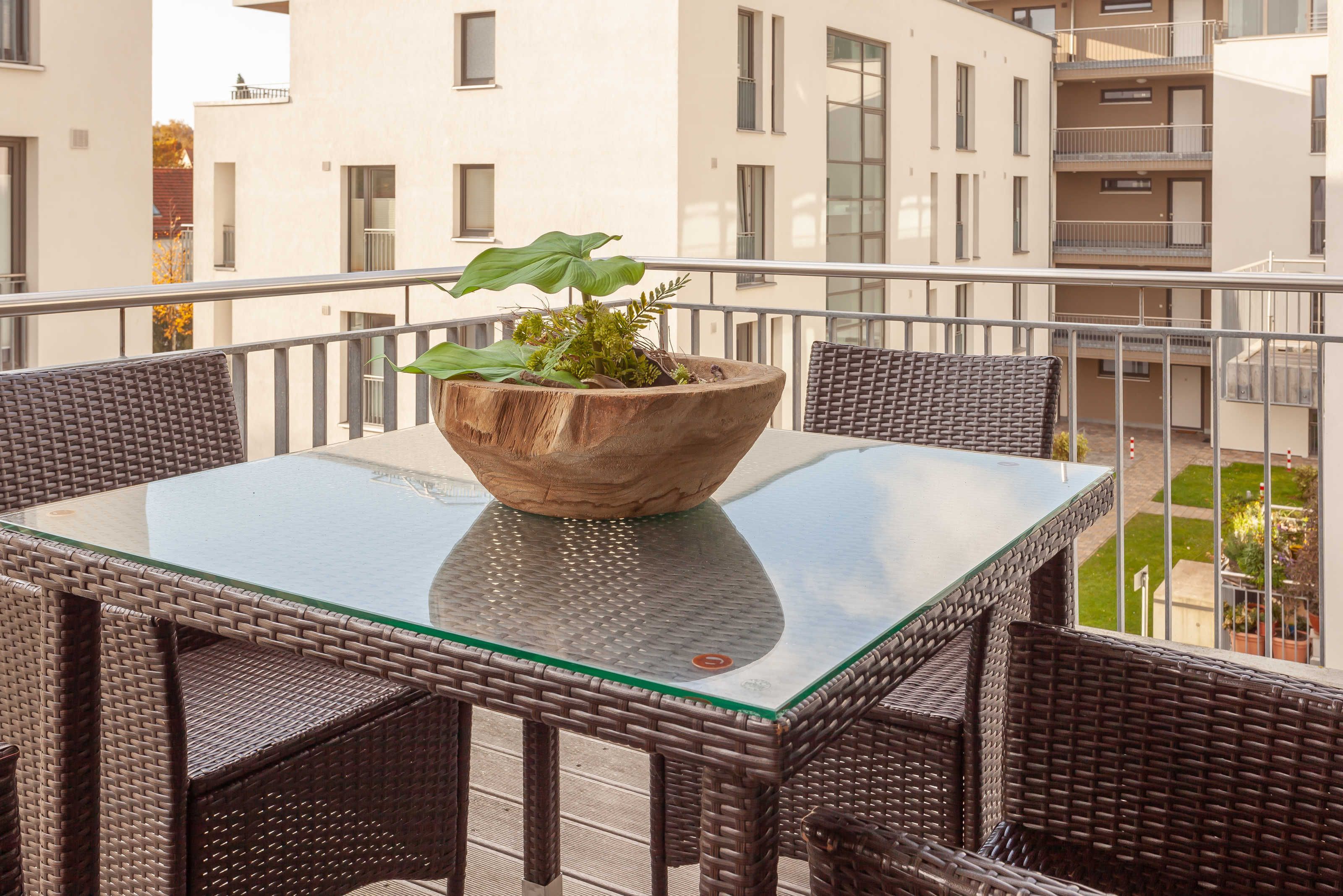 Vom Wohnbereich aus gelangen Sie auf den Balkon mit Holzoptik-Fussboden sowie mit einer 4er-Sitzgruppe mit Tisch, in Rattanoptik gehalten. Besonders zur wärmeren Jahreszeit genießt der Gast seine Zeit hier im Freien, aber aufgrund der Südlage kann man auch schon im Frühjahr oder noch bis in den goldenen Herbst Urlaubszeit draußen genießen.