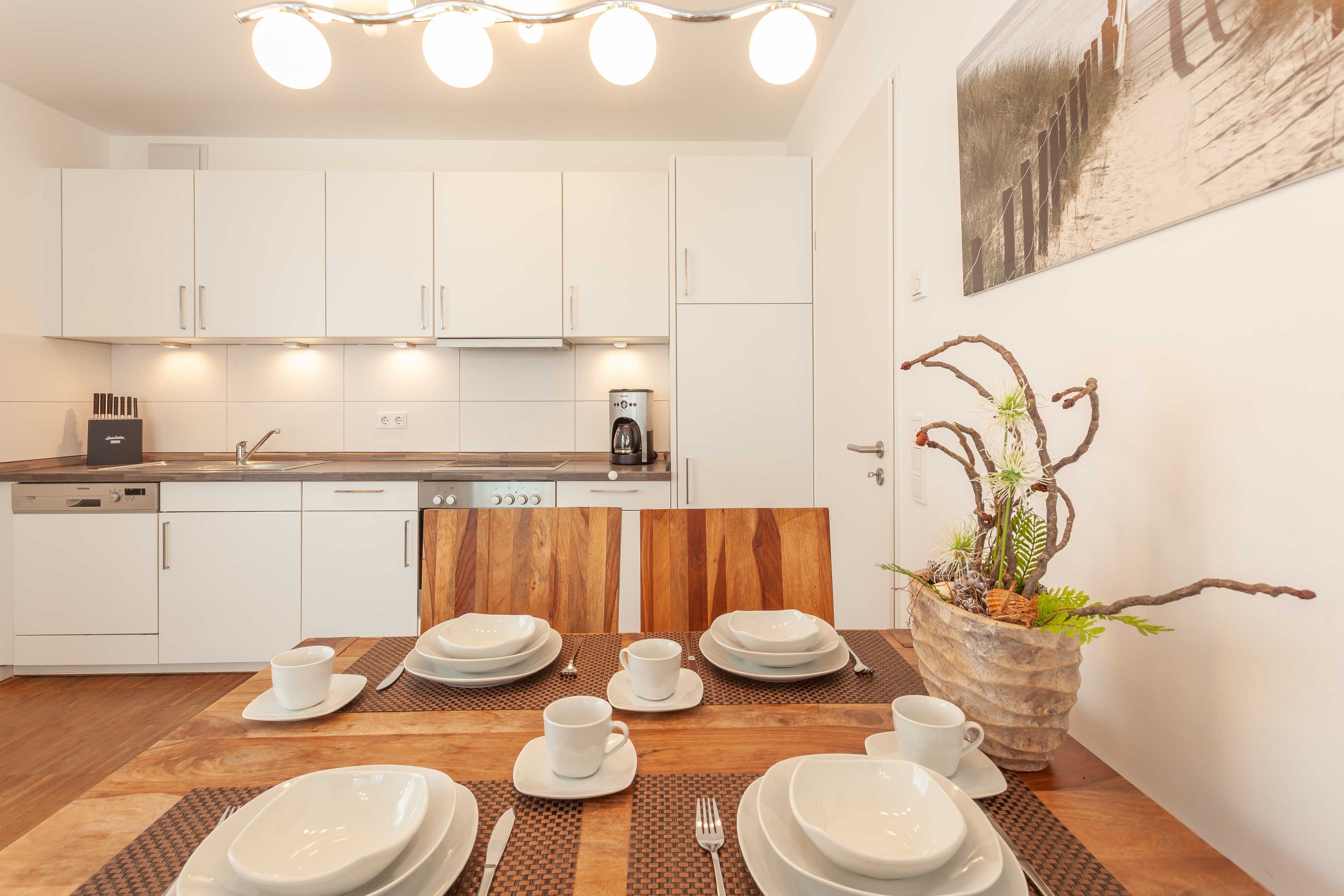 Die in den eleganten Wohnraum integrierte Küche mit weißen Fronten geht über die gesamte Breite an der Stirnwand und verfügt über alle Geräte, auf die man im Urlaub nicht verzichten möchte, wie beispielsweise einen Herd mit Ceran-Kochfeld und Backofen, eine Geschirrspülmaschine, einen Kühlschrank mit Gefrierfach, eine Kaffeemaschine, Toaster und Wasserkocher. Die Küche ist vollständig mit Kochutensilien ausgestattet und verleitet geradezu zum Kochen im Urlaubsdomizil.
