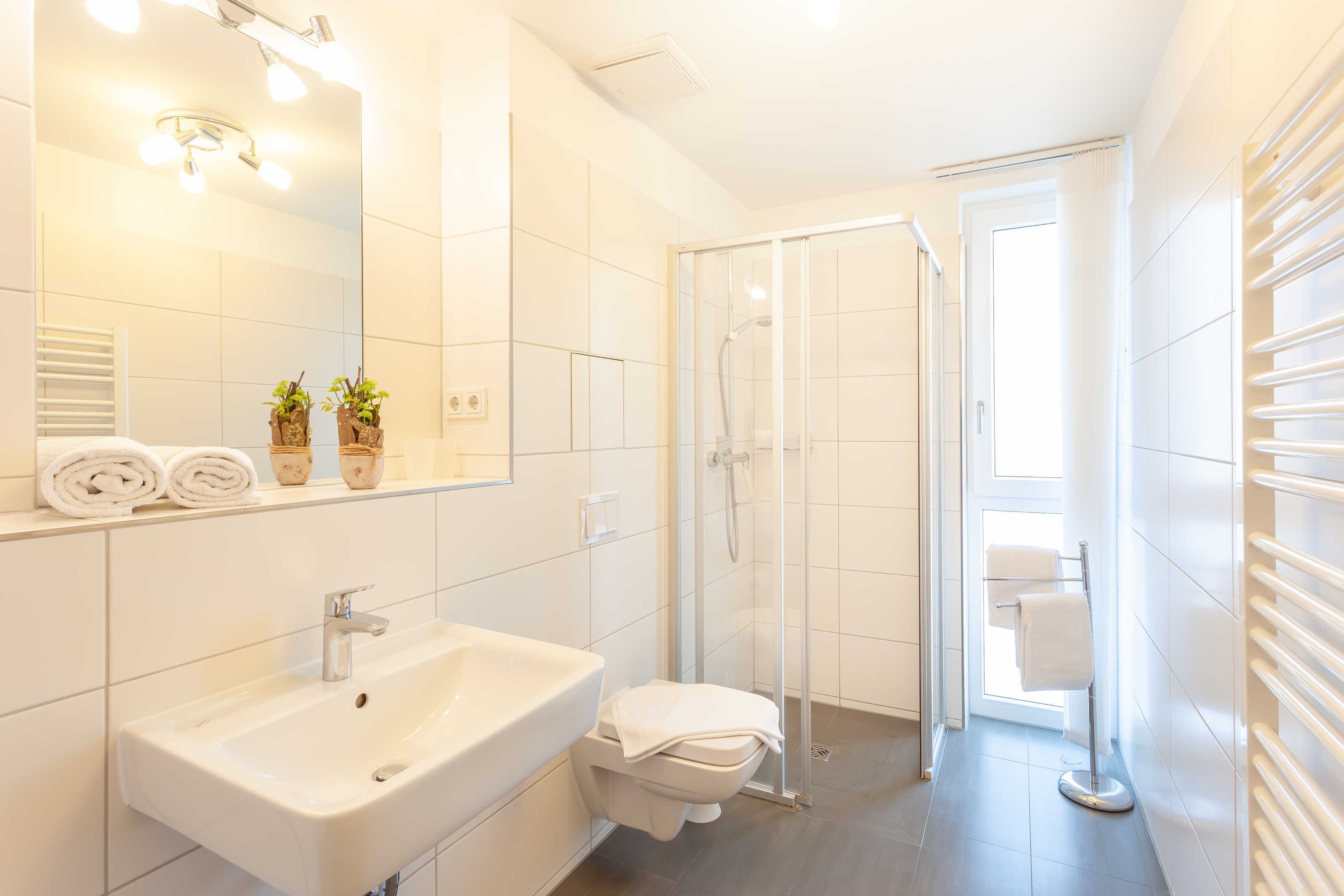 Im hellen, großzügigen Wohlfühl-Badezimmer mit großem Außenfenster finden Sie eine bodentiefe und barrierefreie Dusche sowie eine Waschmaschine. Das Bad ist modern gestaltet und es ist einfach eine Wohltat, sich hier aufzuhalten.
