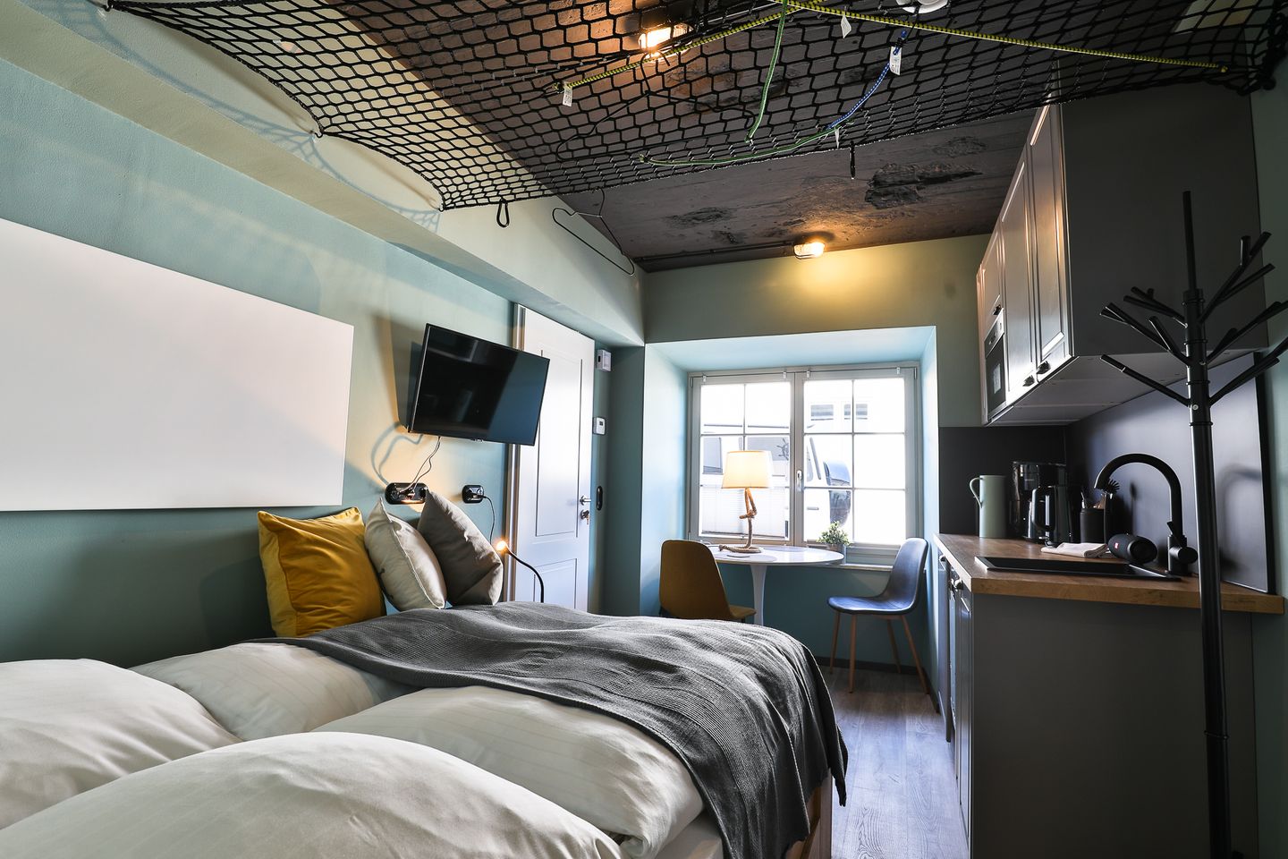 Der kombinierte Wohn-Schlafraum wartet mit einem Queensize Bett auf. Weiter ist in diesen die kleine, aber gut ausgestattete Küchenzeile sowie der Essbereich integriert.