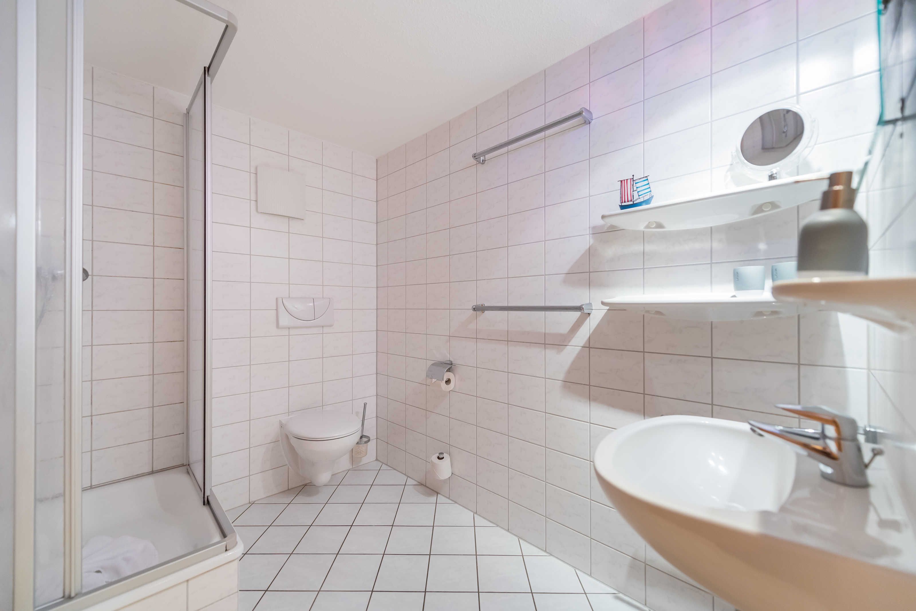 Weiterhin gibt es im Appartement ein Badezimmer mit Dusche und ein separates WC mit Handwaschbecken.