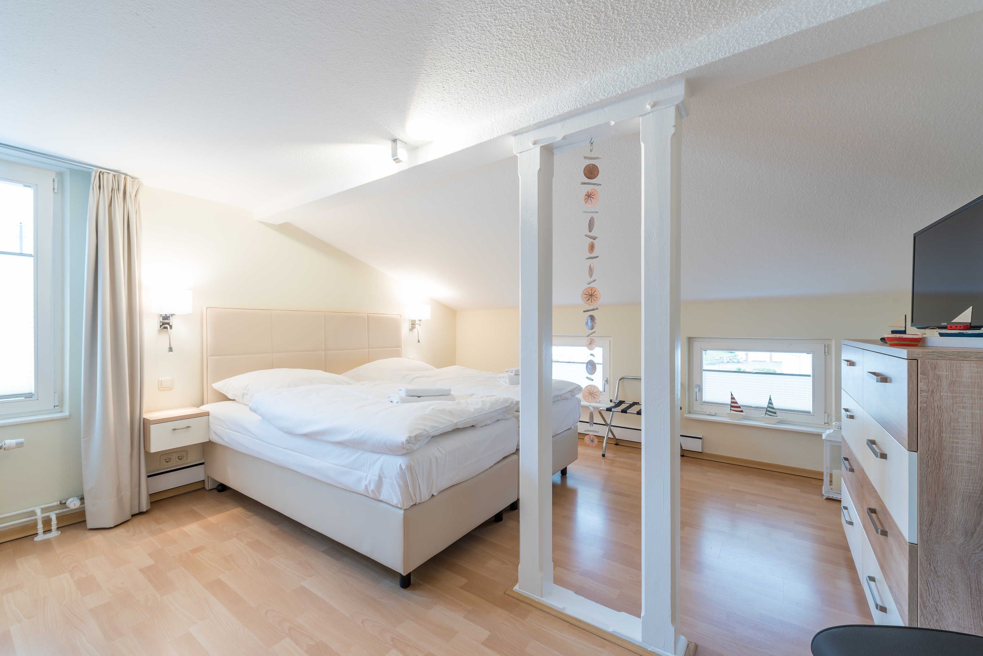 Das Appartement 7 in der 2. Etage, das Penthaus, bietet Ihnen auf ca. 75 qm ein wundervolles Feriendomizil. Es verfügt über 2 Schlafzimmer (jeweils mit einem Doppelbett 1,80 m x 2,00 m). Eines ist sogar mit einem Fernseher ausgestattet.