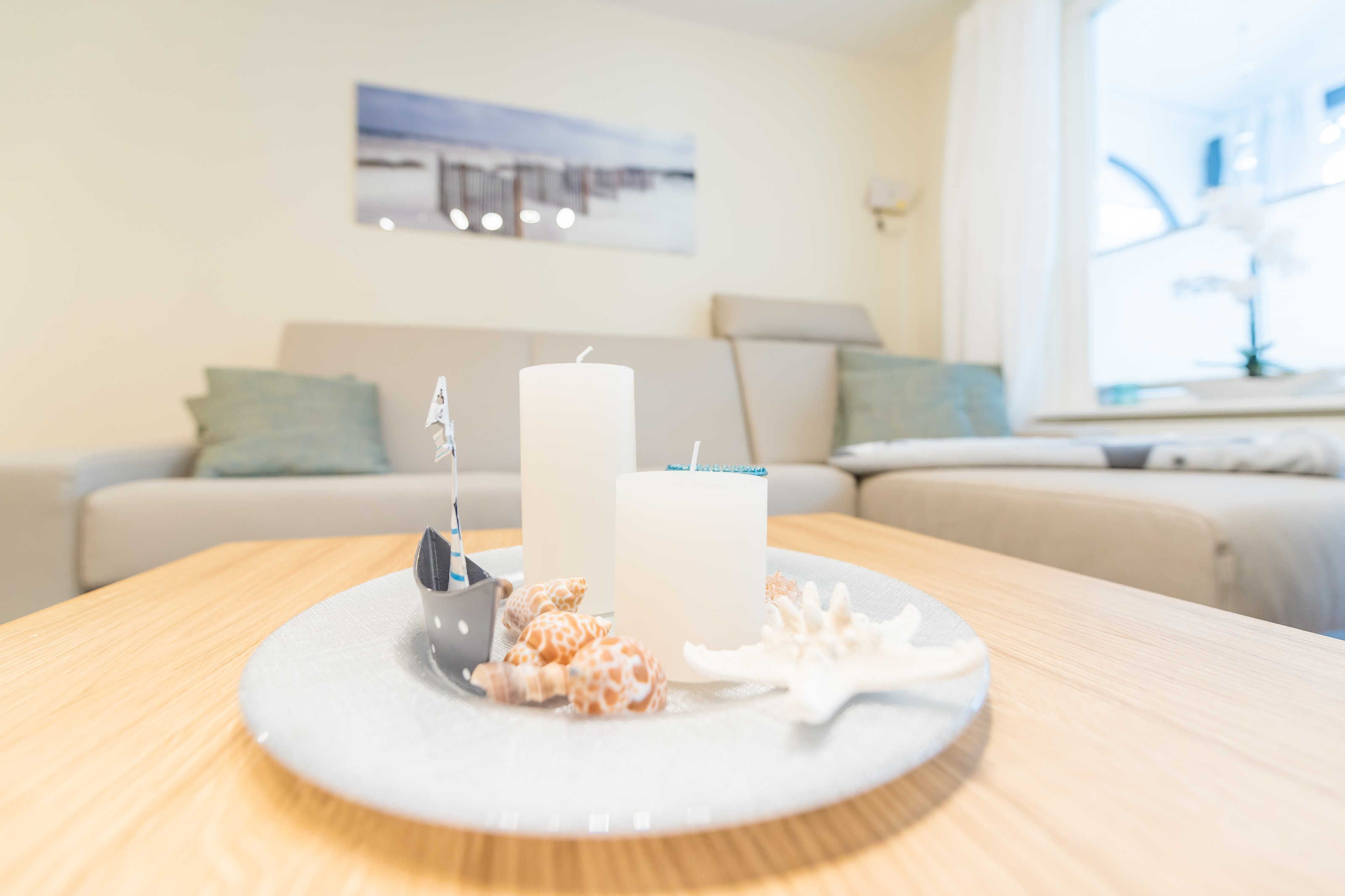 Im gemütlichen Wohnbereich gibt es einen internetfähigen Fernseher sowie einen CD-Player mit Radio. WLAN ist inklusive. Bei Anreise mit einer 5./6. Person, vorzugsweise Kinder, kann die Couch im Wohnbereich zu einem bequemen Bett umgewandelt werden (Liegefläche 1,40 m x 2,00 m). Ein heller Essplatz befindet sich ebenfalls hier und lädt zum gemeinsamen Speisen oder zum geselligen Zusammensein ein.