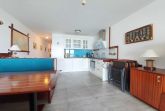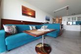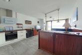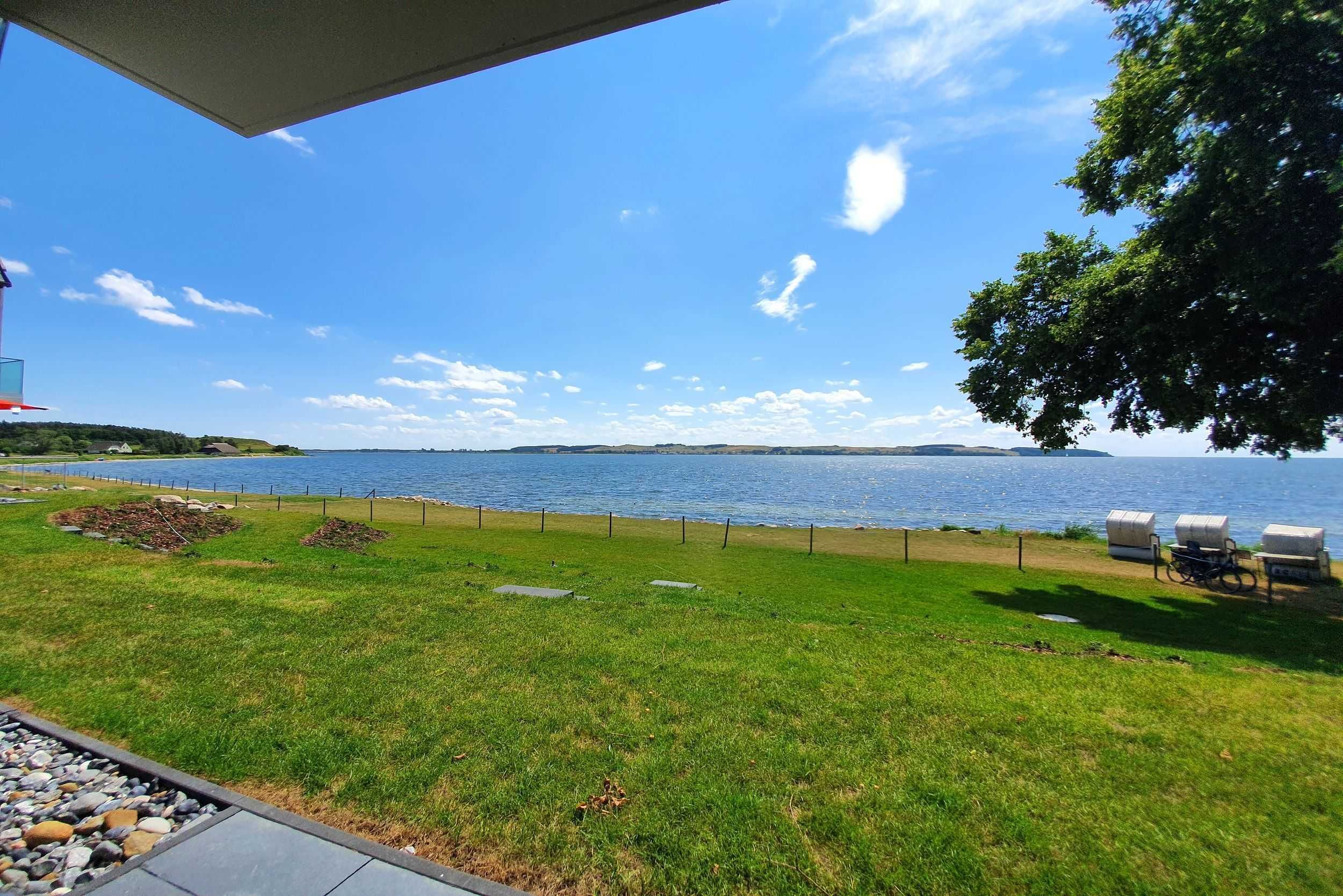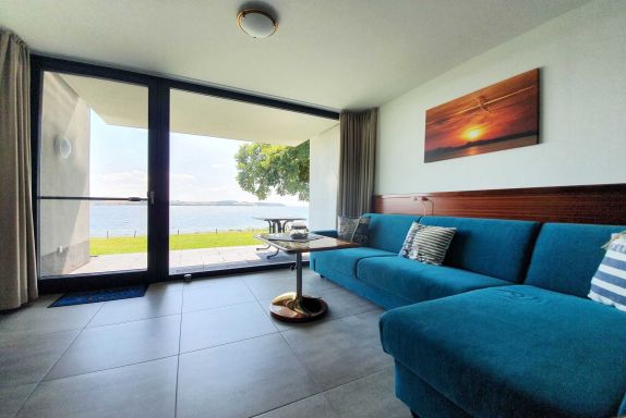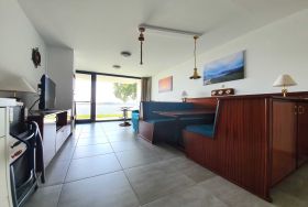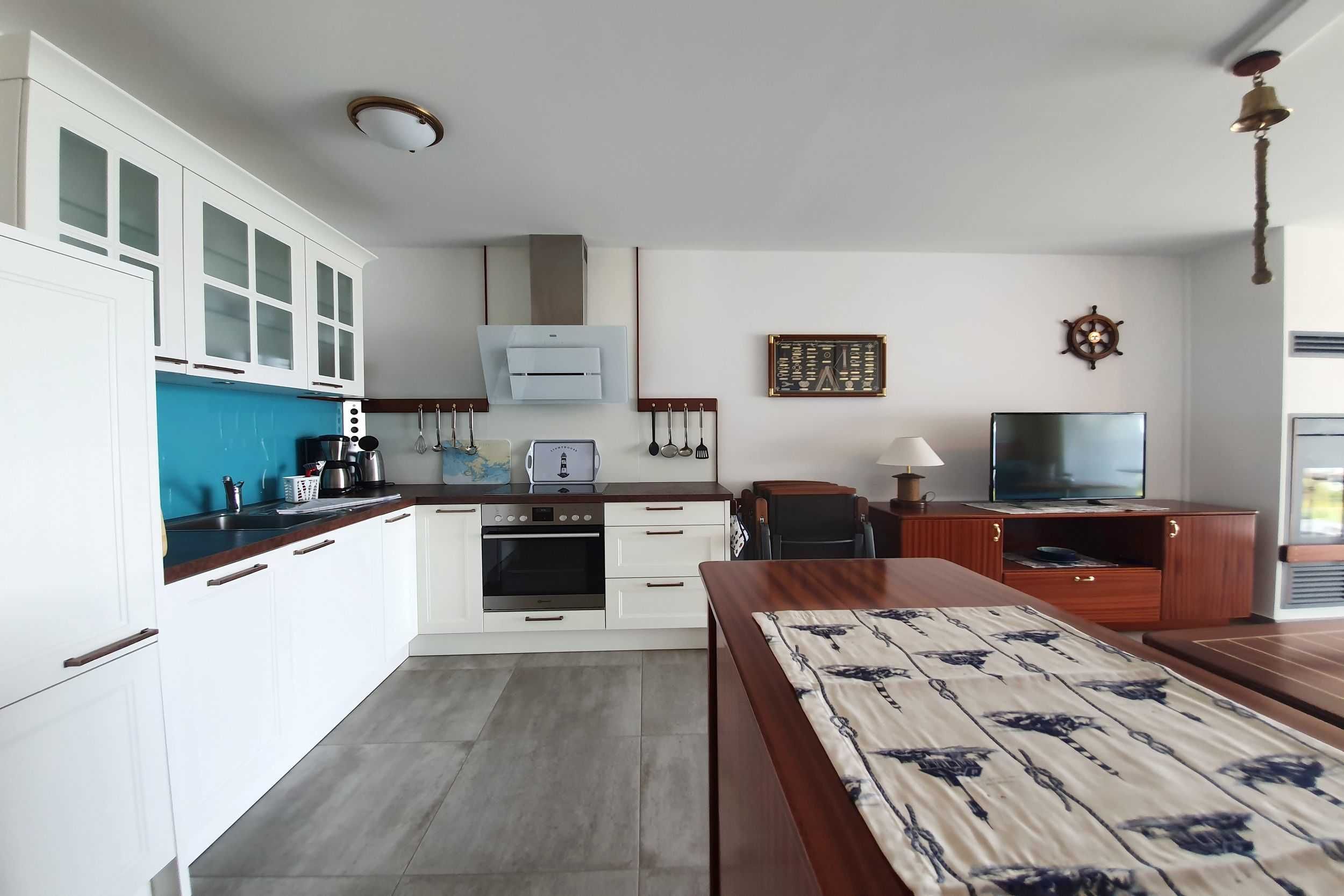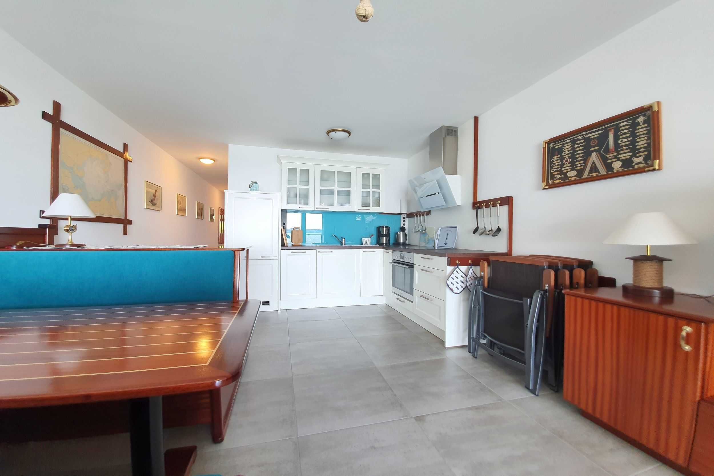 Der Wohnbereich mit seinen bodentiefen Fenstern und Zugang zur Terrasse mit direktem Wasserblick ist mit einer Couch und Flachbild TV eingerichtet. Die offene Küche mit Essbereich ist mit einem 4 Felder Induktionserd und Backofen, Kühlschrank mit Gefrierfach, Kaffeemaschine, Toaster und reichlich Küchenutensilien bestens ausgestattet.
