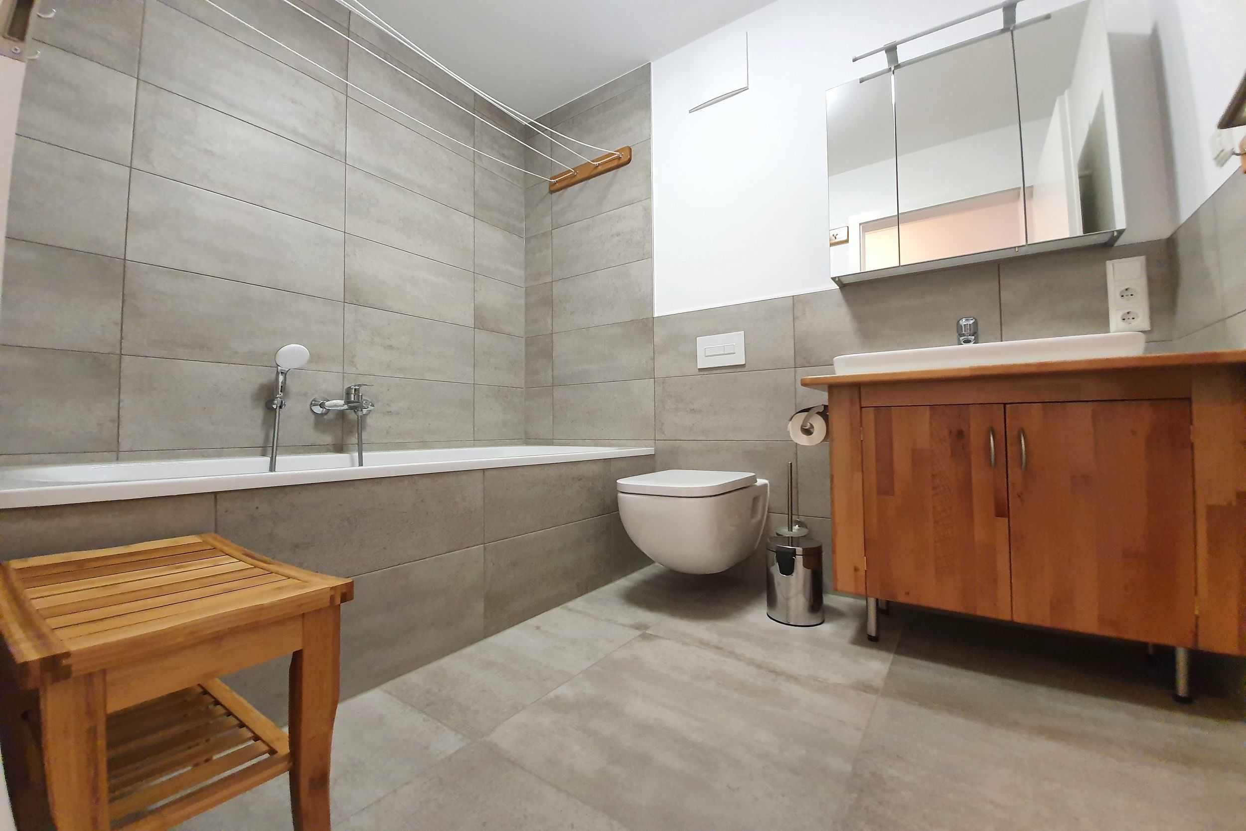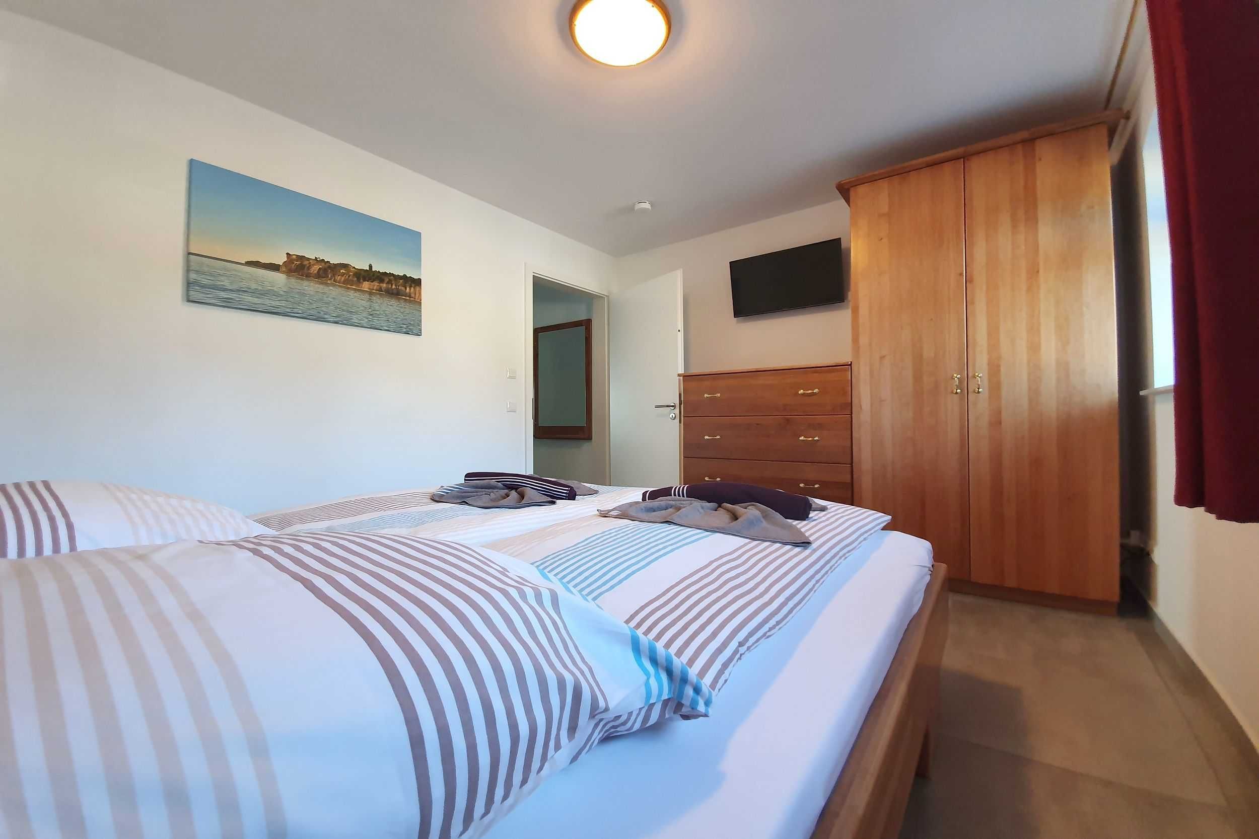 Im Schlafzimmer finden Sie ein beuqemes Doppelbett, Smart TV und einen Kleiderschrank. Das moderne Bad ist mit einer Badewanne, WC und Waschbecken versehen.